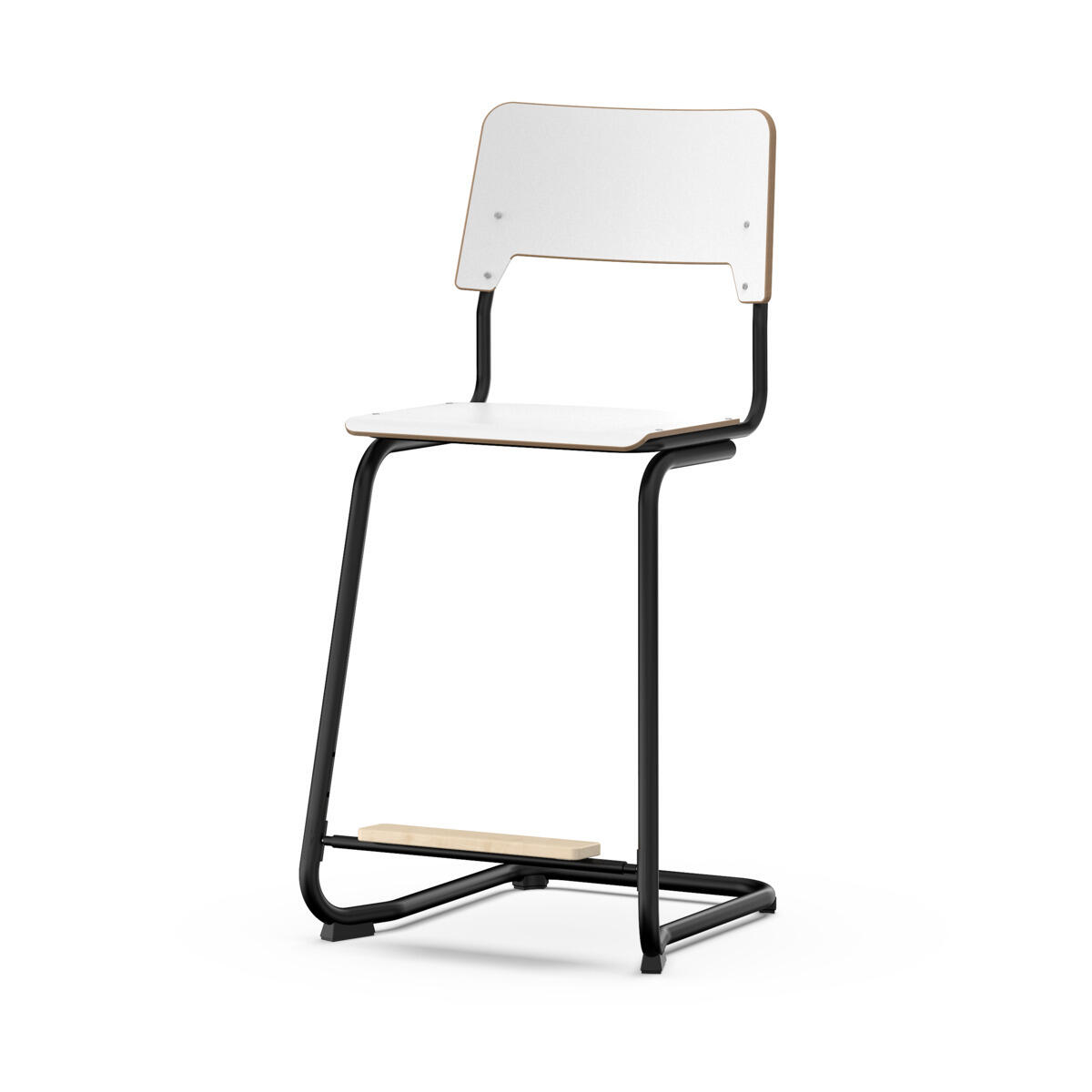 Sits och rygg är tillverkade av plywood med en yta av högtryckslaminat. Sitsen är skålad vilket gör den behaglig att sitta på. Stativet är lackerat i vitt, RAL 9003. Tassar med filt. Stolen uppfyller kraven enligt EN 1729-1 & 2. En distans mellan rygg och stativ möjliggör upphängning av stolen med hjälp av ryggen. För att förhindra skador på bordet vid upphängning är glidskydd monterade på ryggen. Distansen gör det även möjligt att använda stativet som en praktisk väskkrok. Reglarbart fotstöd i tre fasta lägen (26, 31 och 36 cm från sits).