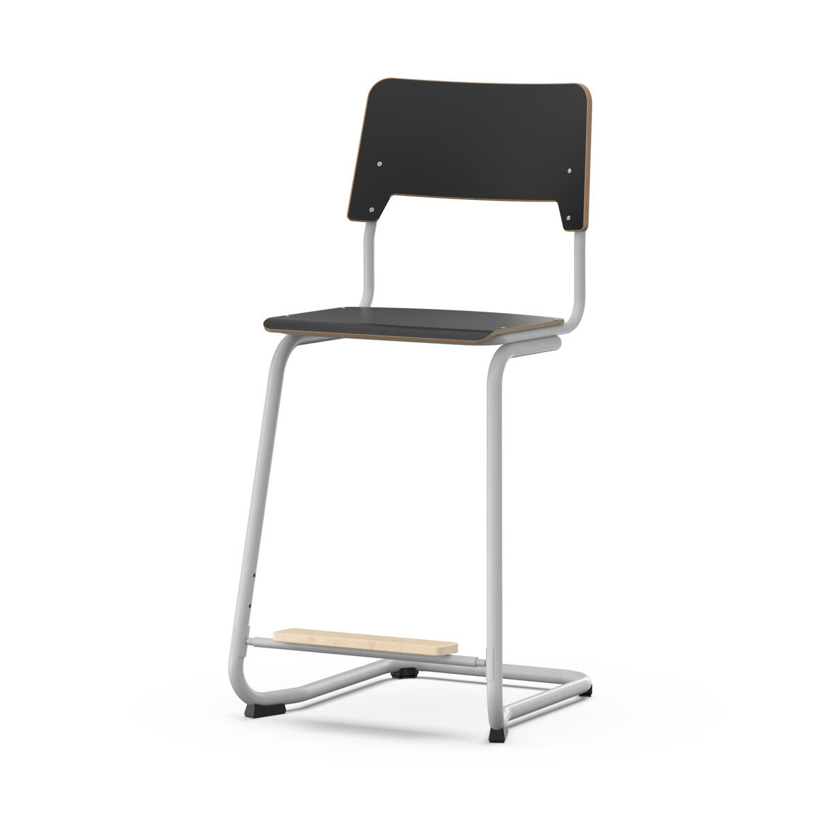 Sits och rygg är tillverkade av plywood med en yta av högtryckslaminat. Sitsen är skålad vilket gör den behaglig att sitta på. Stativet är lackerat i svart, RAL 9005. Tassar med filt. Stolen uppfyller kraven enligt EN 1729-1 & 2. En distans mellan rygg och stativ möjliggör upphängning av stolen med hjälp av ryggen. För att förhindra skador på bordet vid upphängning är glidskydd monterade på ryggen. Distansen gör det även möjligt att använda stativet som en praktisk väskkrok. Reglarbart fotstöd i tre fasta lägen (26, 31 och 36 cm från sits).