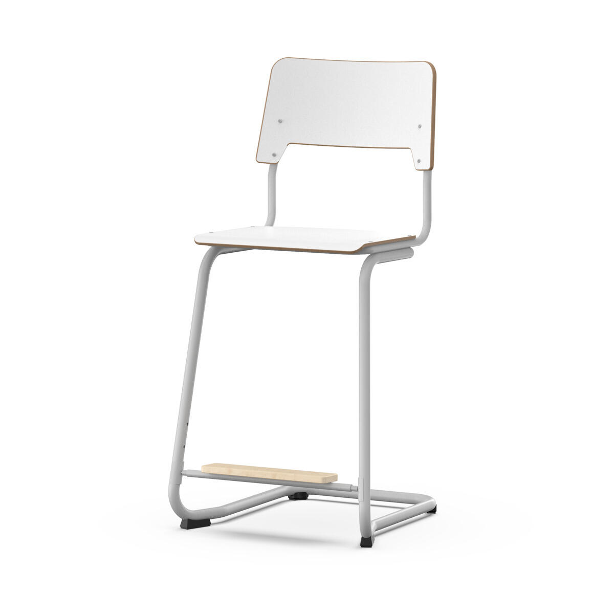Sits och rygg är tillverkade av plywood med en yta av högtryckslaminat. Sitsen är skålad vilket gör den behaglig att sitta på. Stativet är lackerat i vitt, RAL 9003. Tassar med filt. Stolen uppfyller kraven enligt EN 1729-1 & 2. En distans mellan rygg och stativ möjliggör upphängning av stolen med hjälp av ryggen. För att förhindra skador på bordet vid upphängning är glidskydd monterade på ryggen. Distansen gör det även möjligt att använda stativet som en praktisk väskkrok. Reglarbart fotstöd i tre fasta lägen (26, 31 och 36 cm från sits).