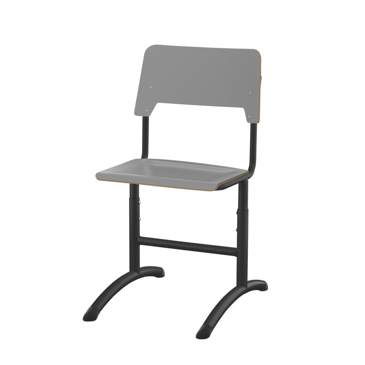 Sits och rygg är tillverkade av plywood med en yta av högtryckslaminat. Sitsen är skålad vilket gör den behaglig att sitta på. Stativet är lackerat i silver, RAL 9006. Ställbar i höjderna 38, 43, 46 och 51 cm. Glidfötter i plast varav två är justerbara med ställskruv. En distans mellan rygg och stativ möjliggör upphängning av stolen med hjälp av ryggen. För att förhindra skador på bordet vid upphängning är glidskydd monterade på ryggen. Distansen gör det även möjligt att använda stativet som en praktisk väskkrok.