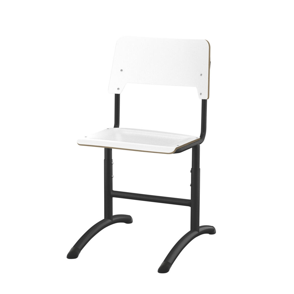 Sits och rygg är tillverkade av plywood med en yta av högtryckslaminat. Sitsen är skålad vilket gör den behaglig att sitta på. Stativet är lackerat i svart, RAL 9005. Ställbar i höjderna 38, 43, 46 och 51 cm. Glidfötter i plast varav två är justerbara med ställskruv. En distans mellan rygg och stativ möjliggör upphängning av stolen med hjälp av ryggen. För att förhindra skador på bordet vid upphängning är glidskydd monterade på ryggen. Distansen gör det även möjligt att använda stativet som en praktisk väskkrok.