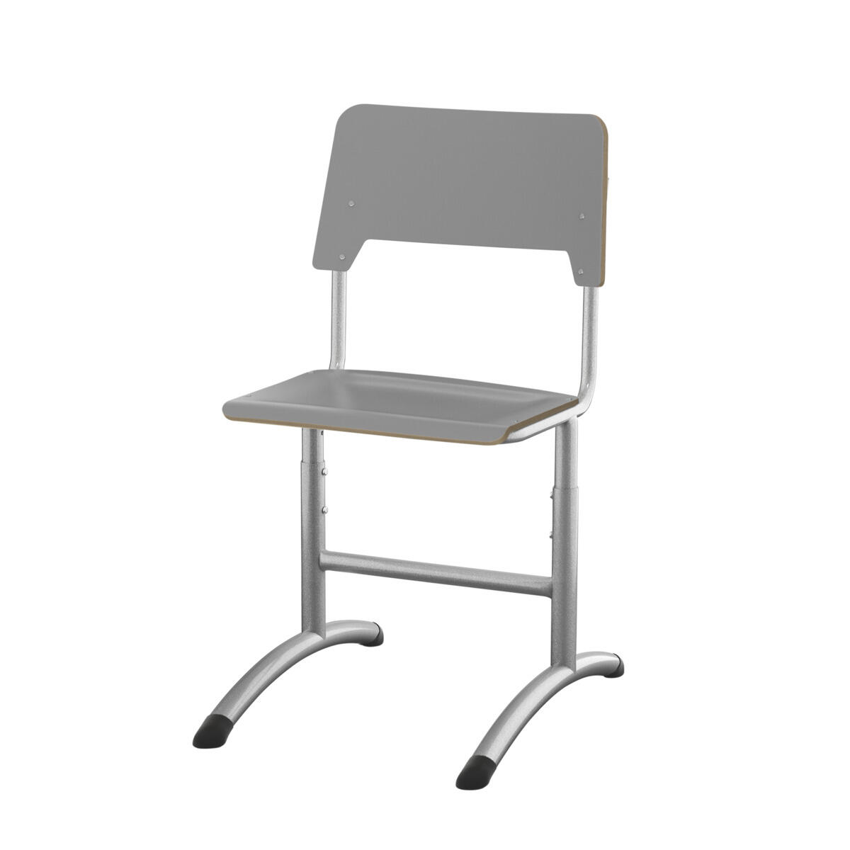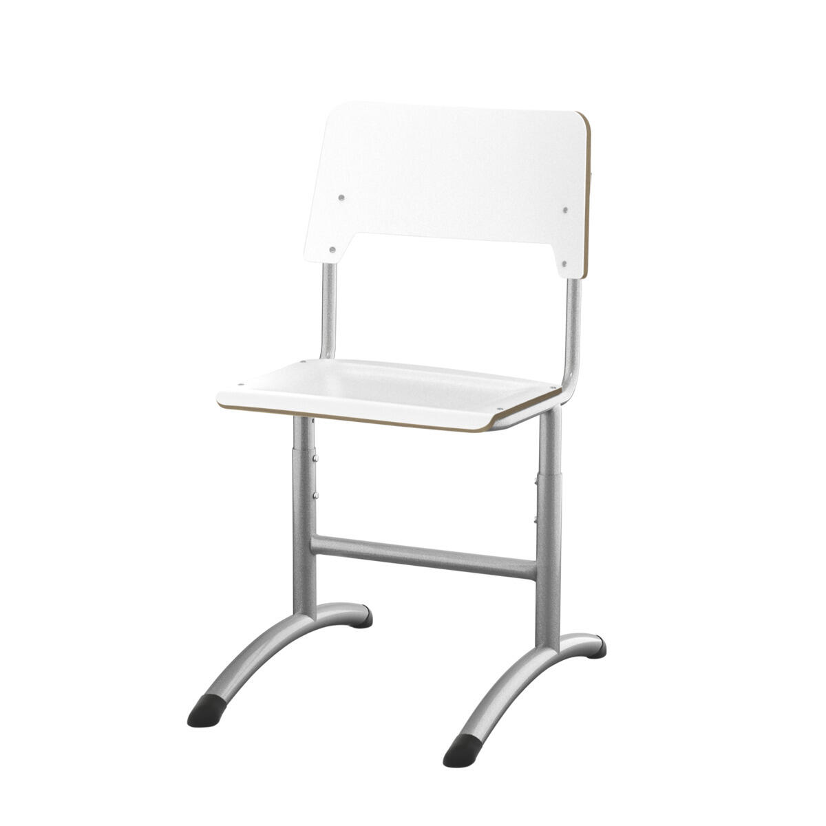 Sits och rygg är tillverkade av plywood med en yta av högtryckslaminat. Sitsen är skålad vilket gör den behaglig att sitta på. Stativet är lackerat i silver, RAL 9006. Ställbar i höjderna 38, 43, 46 och 51 cm. Glidfötter i plast varav två är justerbara med ställskruv. En distans mellan rygg och stativ möjliggör upphängning av stolen med hjälp av ryggen. För att förhindra skador på bordet vid upphängning är glidskydd monterade på ryggen. Distansen gör det även möjligt att använda stativet som en praktisk väskkrok.