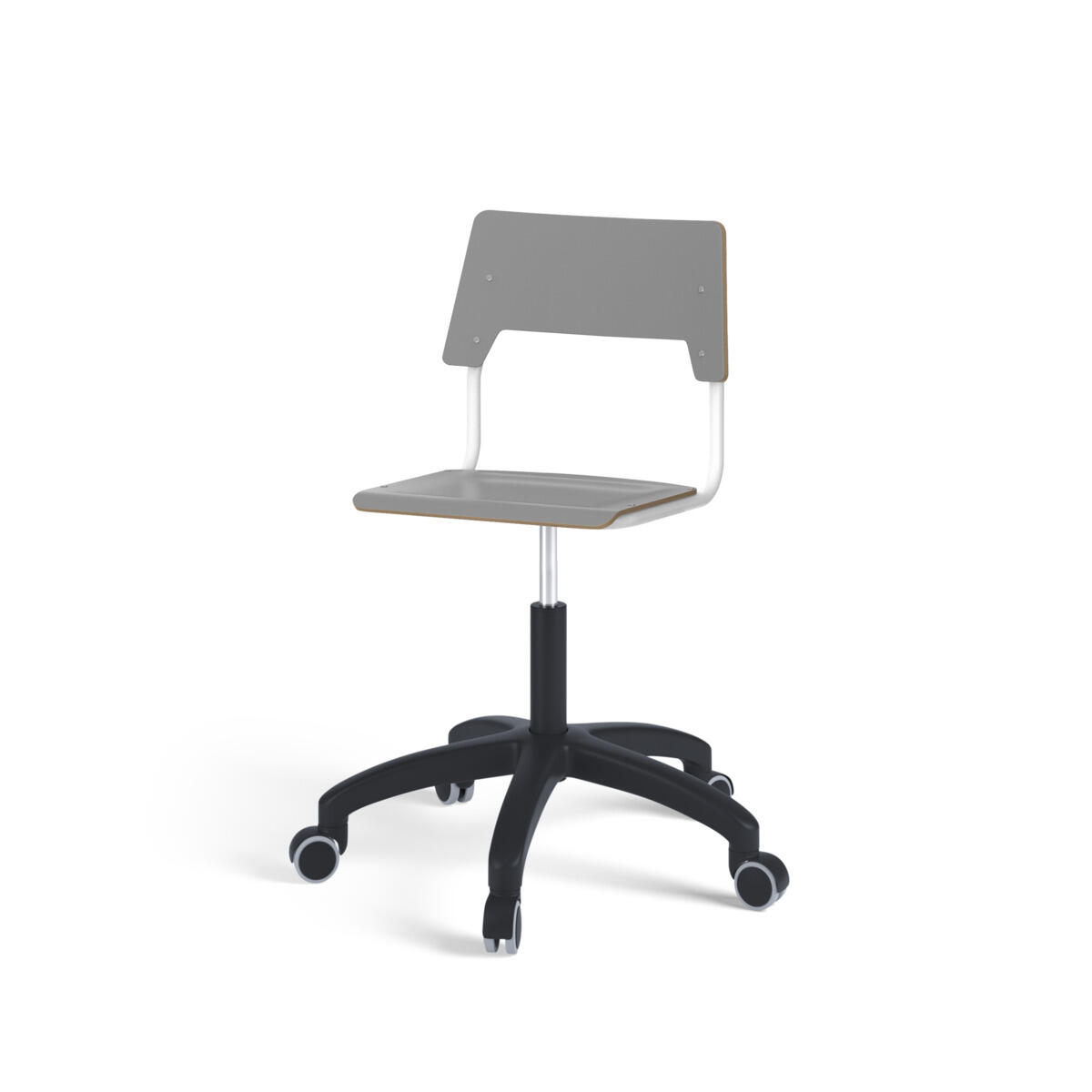 Sits och rygg är tillverkade av plywood med en yta av högtryckslaminat. Sitsen är skålad vilket gör den behaglig att sitta på. Ram för rygg och sits är lackerad i silver, RAL 9006. Utrustad med gasdämpare för reglering av sitthöjd med hjälp av en spak. Svart nylonkryss med hjul. En distans mellan rygg och stativ möjliggör upphängning av stolen med hjälp av ryggen. För att förhindra skador på bordet vid upphängning är glidskydd monterade på ryggen. Distansen gör det även möjligt att använda stativet som en praktisk väskkrok.