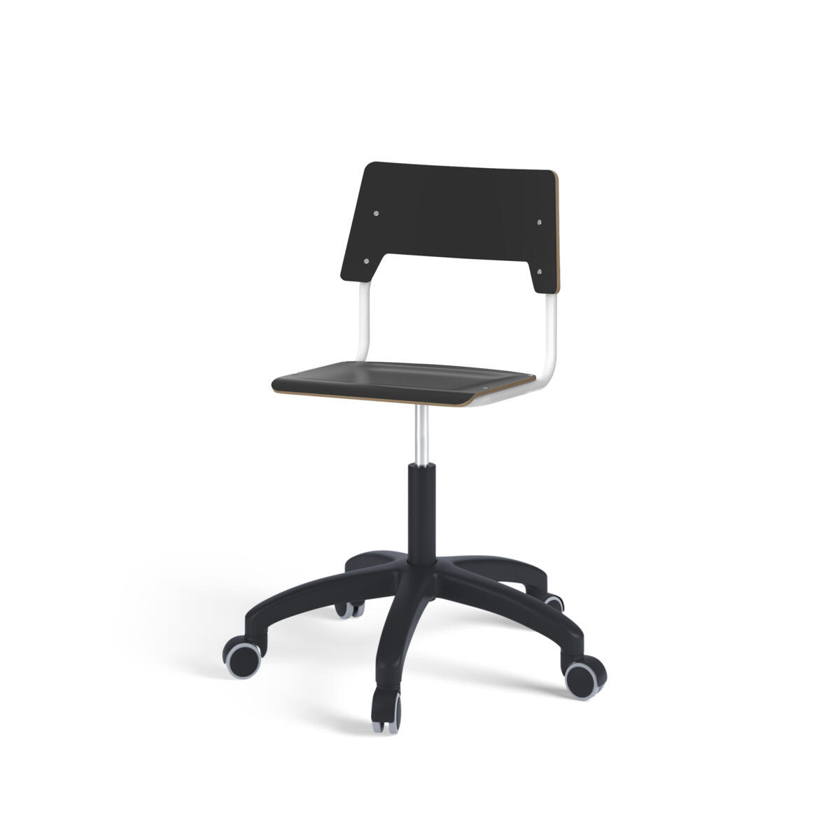 Sits och rygg är tillverkade av plywood med en yta av högtryckslaminat. Sitsen är skålad vilket gör den behaglig att sitta på. Ram för rygg och sits är lackerad i svart, RAL 9005. Utrustad med gasdämpare för reglering av sitthöjd med hjälp av en spak. Svart nylonkryss med hjul. En distans mellan rygg och stativ möjliggör upphängning av stolen med hjälp av ryggen. För att förhindra skador på bordet vid upphängning är glidskydd monterade på ryggen. Distansen gör det även möjligt att använda stativet som en praktisk väskkrok.