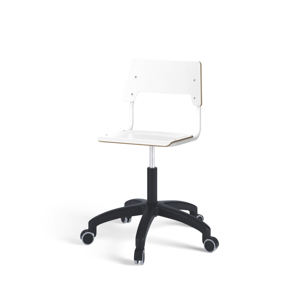 Sits och rygg är tillverkade av plywood med en yta av högtryckslaminat. Sitsen är skålad vilket gör den behaglig att sitta på. Ram för rygg och sits är lackerad i vitt, RAL 9003. Utrustad med gasdämpare för reglering av sitthöjd med hjälp av en spak. Svart nylonkryss med hjul. En distans mellan rygg och stativ möjliggör upphängning av stolen med hjälp av ryggen. För att förhindra skador på bordet vid upphängning är glidskydd monterade på ryggen. Distansen gör det även möjligt att använda stativet som en praktisk väskkrok.
