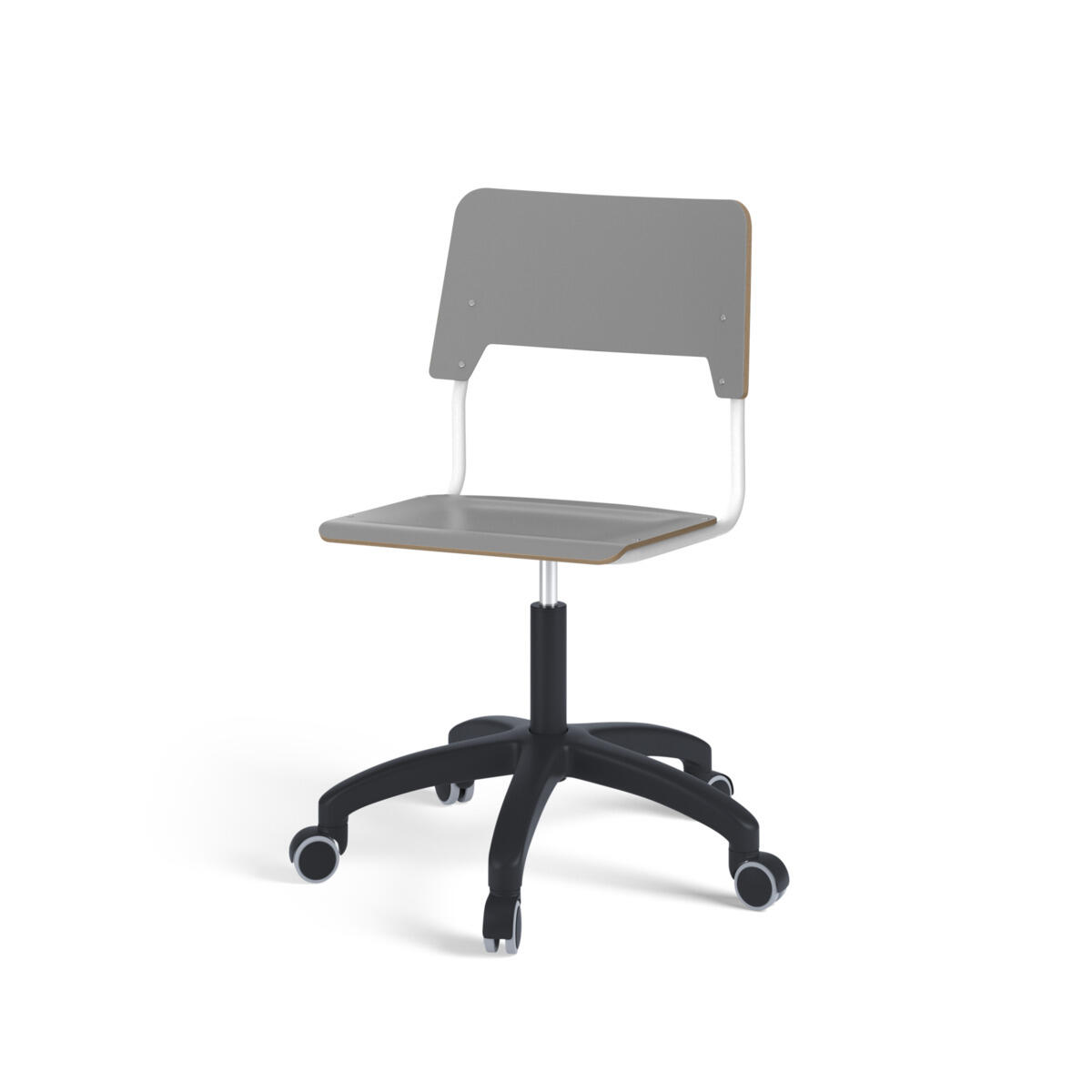 Sits och rygg är tillverkade av plywood med en yta av högtryckslaminat. Sitsen är skålad vilket gör den behaglig att sitta på. Ram för rygg och sits är lackerad i silver, RAL 9006. Utrustad med gasdämpare för reglering av sitthöjd med hjälp av en spak. Svart nylonkryss med hjul. En distans mellan rygg och stativ möjliggör upphängning av stolen med hjälp av ryggen. För att förhindra skador på bordet vid upphängning är glidskydd monterade på ryggen. Distansen gör det även möjligt att använda stativet som en praktisk väskkrok.