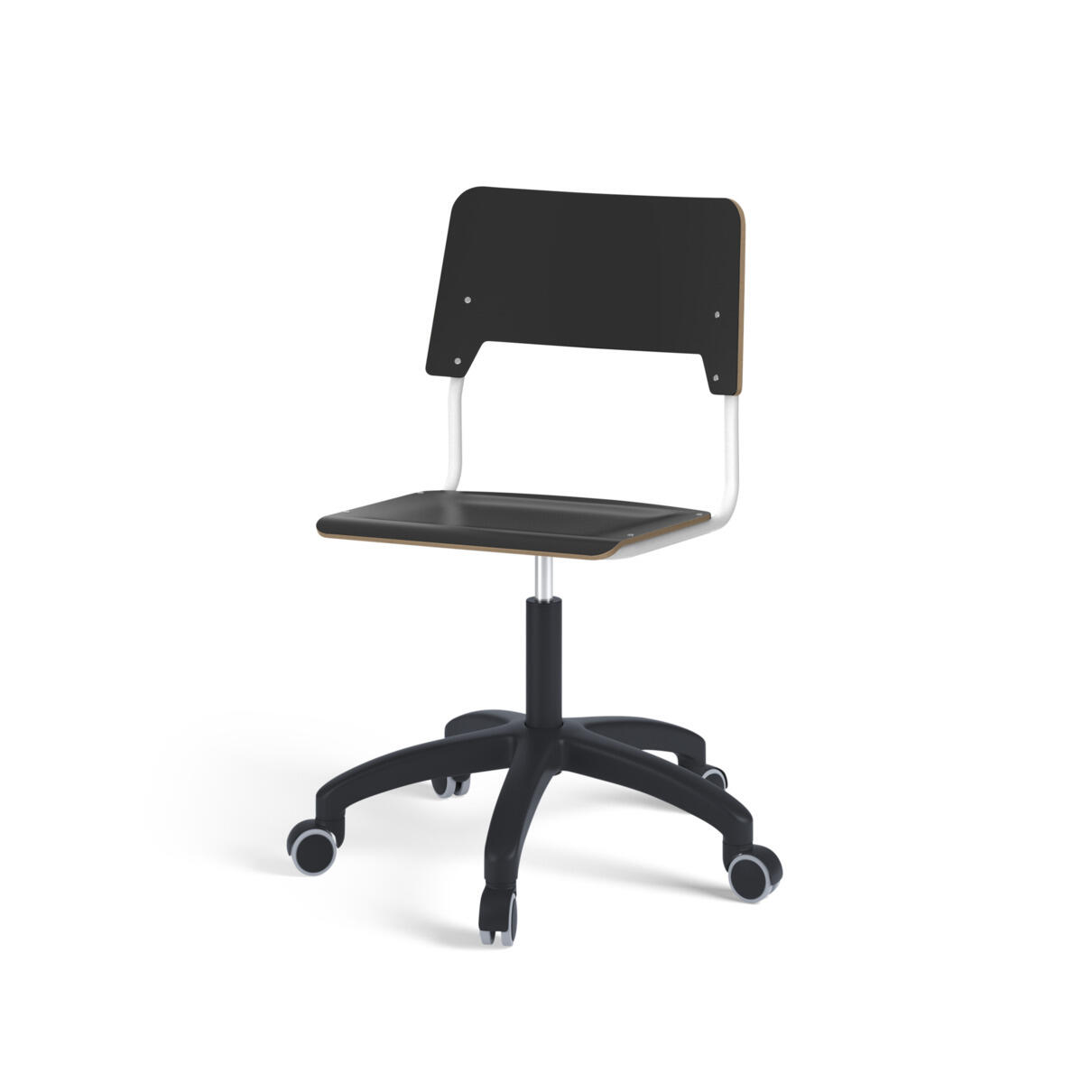 Sits och rygg är tillverkade av plywood med en yta av högtryckslaminat. Sitsen är skålad vilket gör den behaglig att sitta på. Ram för rygg och sits är lackerad i svart, RAL 9005. Utrustad med gasdämpare för reglering av sitthöjd med hjälp av en spak. Svart nylonkryss med hjul. En distans mellan rygg och stativ möjliggör upphängning av stolen med hjälp av ryggen. För att förhindra skador på bordet vid upphängning är glidskydd monterade på ryggen. Distansen gör det även möjligt att använda stativet som en praktisk väskkrok.
