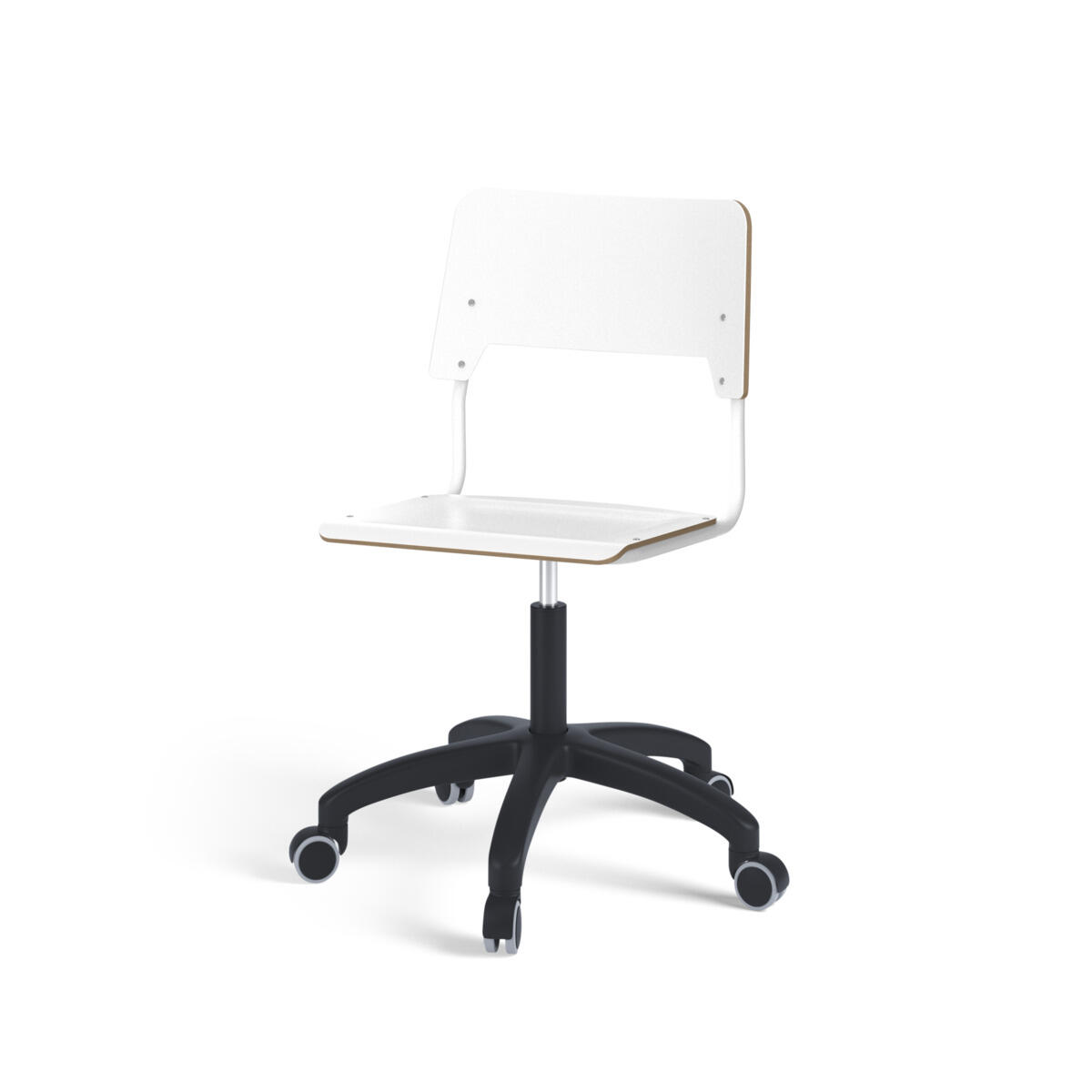 Sits och rygg är tillverkade av plywood med en yta av högtryckslaminat. Sitsen är skålad vilket gör den behaglig att sitta på. Ram för rygg och sits är lackerad i vitt, RAL 9003. Utrustad med gasdämpare för reglering av sitthöjd med hjälp av en spak. Svart nylonkryss med hjul. En distans mellan rygg och stativ möjliggör upphängning av stolen med hjälp av ryggen. För att förhindra skador på bordet vid upphängning är glidskydd monterade på ryggen. Distansen gör det även möjligt att använda stativet som en praktisk väskkrok.