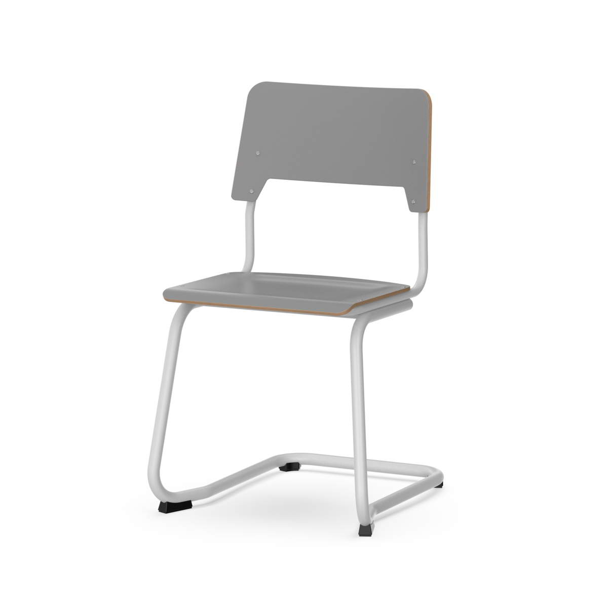 Sits och rygg är tillverkade av plywood med en yta av högtryckslaminat. Sitsen är skålad vilket gör den behaglig att sitta på. Stativet är lackerat i silver, RAL 9006. Tassar med filt. Stolen uppfyller kraven enligt EN 1729-1 & 2. En distans mellan rygg och stativ möjliggör upphängning av stolen med hjälp av ryggen. För att förhindra skador på bordet vid upphängning är glidskydd monterade på ryggen. Distansen gör det även möjligt att använda stativet som en praktisk väskkrok. Reglarbart fotstöd i tre fasta lägen (26, 31 och 36 cm från sits).