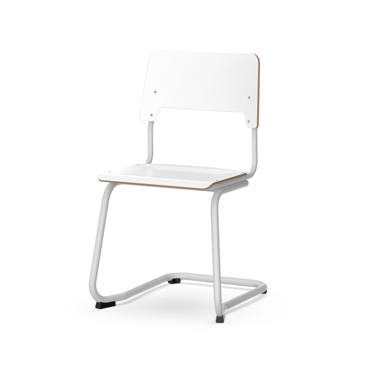 Sits och rygg är tillverkade av plywood med en yta av högtryckslaminat. Sitsen är skålad vilket gör den behaglig att sitta på. Stativet är lackerat i vitt, RAL 9003. Tassar med filt. Stolen uppfyller kraven enligt EN 1729-1 & 2. En distans mellan rygg och stativ möjliggör upphängning av stolen med hjälp av ryggen. För att förhindra skador på bordet vid upphängning är glidskydd monterade på ryggen. Distansen gör det även möjligt att använda stativet som en praktisk väskkrok. Reglarbart fotstöd i tre fasta lägen (26, 31 och 36 cm från sits).