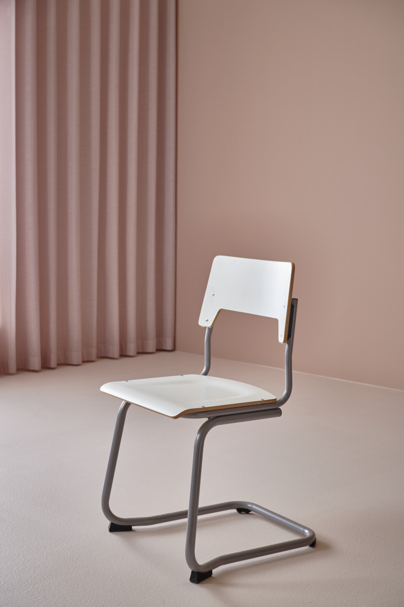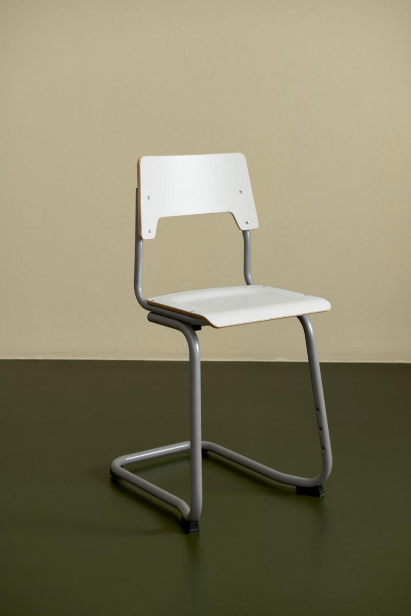 Sits och rygg är tillverkade av plywood med en yta av högtryckslaminat. Sitsen är skålad vilket gör den behaglig att sitta på. Stativet är lackerat i vitt, RAL 9003. Tassar med filt. Stolen uppfyller kraven enligt EN 1729-1 & 2. En distans mellan rygg och stativ möjliggör upphängning av stolen med hjälp av ryggen. För att förhindra skador på bordet vid upphängning är glidskydd monterade på ryggen. Distansen gör det även möjligt att använda stativet som en praktisk väskkrok.