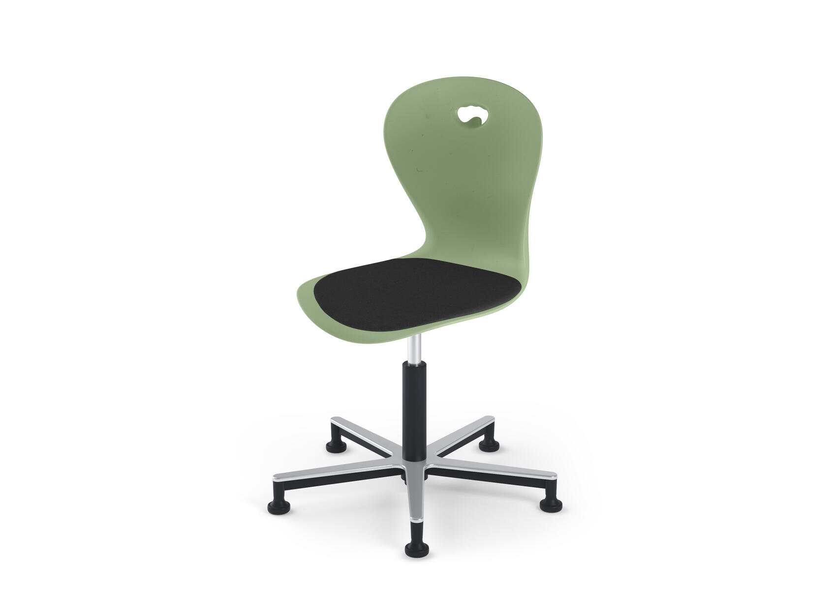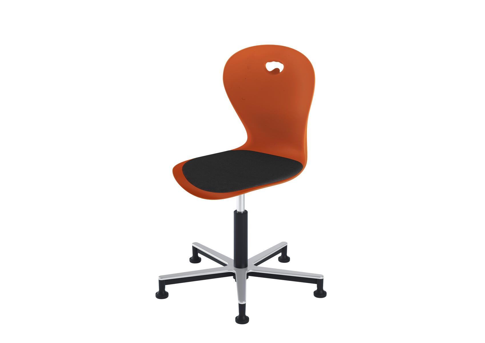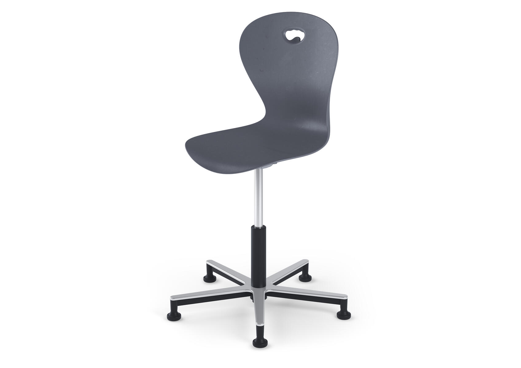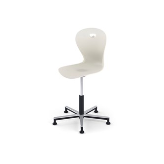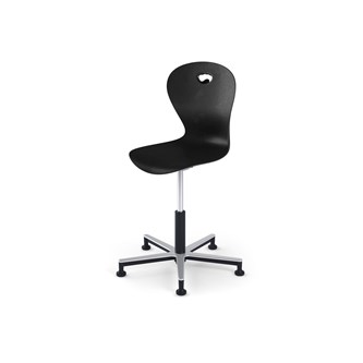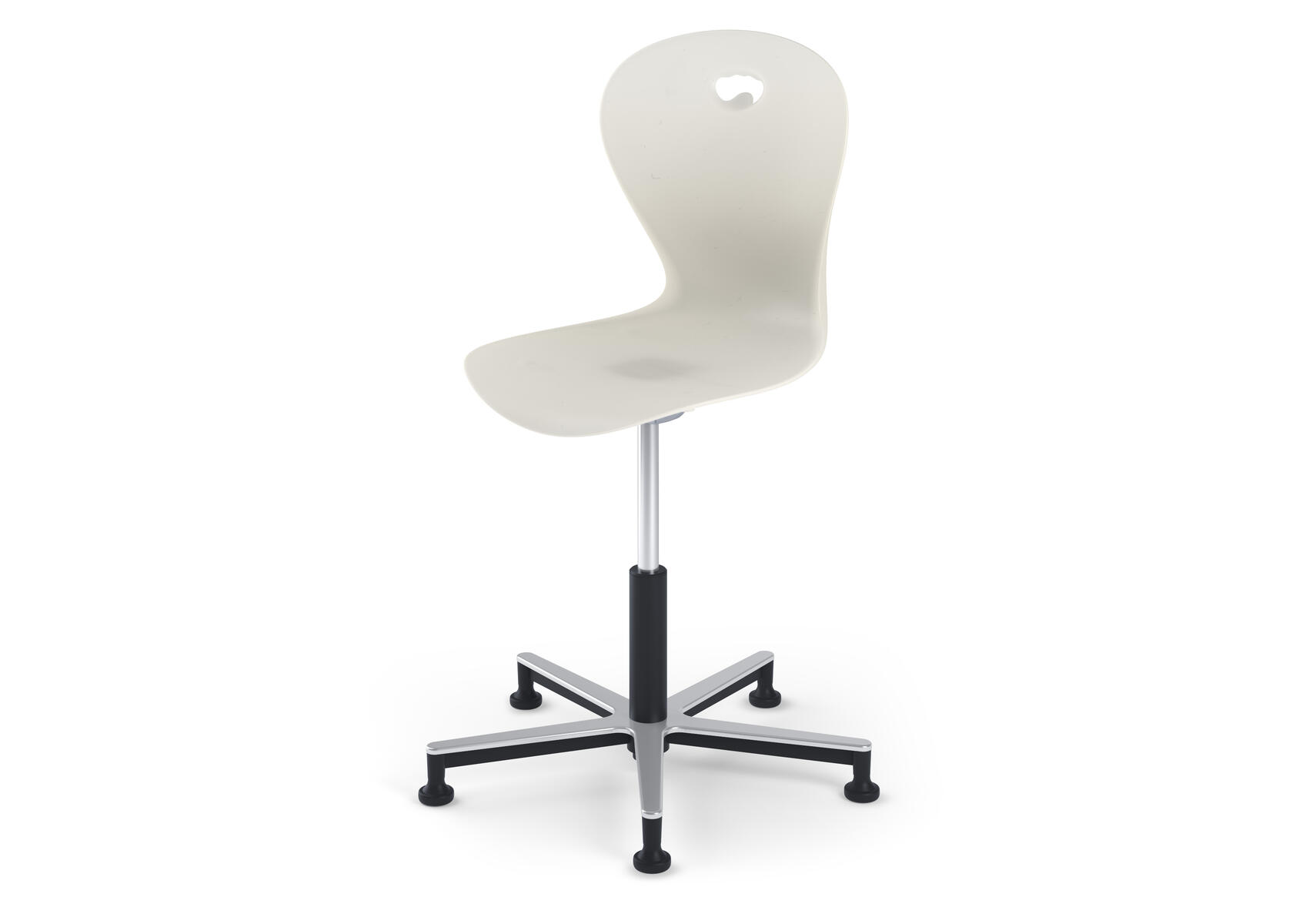 Plastskal av 100 % återvunnet material. Stolen uppfyller EN 1729-1 Sixemark 5&6, vilket innebär att användare mellan 146 och 188 cm sitter bekvämt och ergonomiskt riktigt. Väskkrok på baksidan. Moviflexmekanismen gör att man kan vippa på sitsen åt alla håll, vilket uppmuntrar ett aktivt sittande. Borstat aluminiumkryss med glidfötter. Mått: Sitthöjd 50-70 cm. Sitsbredd 42. Sitsdjup 40 cm. Välj till klädd sits i 100 % återvunnet material.