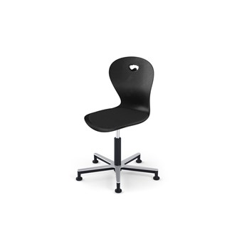 Plastskal av 100 % återvunnet material. Stolen uppfyller EN 1729-1 Sixemark 5&6, vilket innebär att användare mellan 146 och 188 cm sitter bekvämt och ergonomiskt riktigt. Väskkrok på baksidan. Aluminiumkryss med glidfötter. Mått: Sitthöjd 50-70. Sitsbredd 42. Sitsdjup 40 cm. Välj till klädd sits i 100 % återvunnet material.