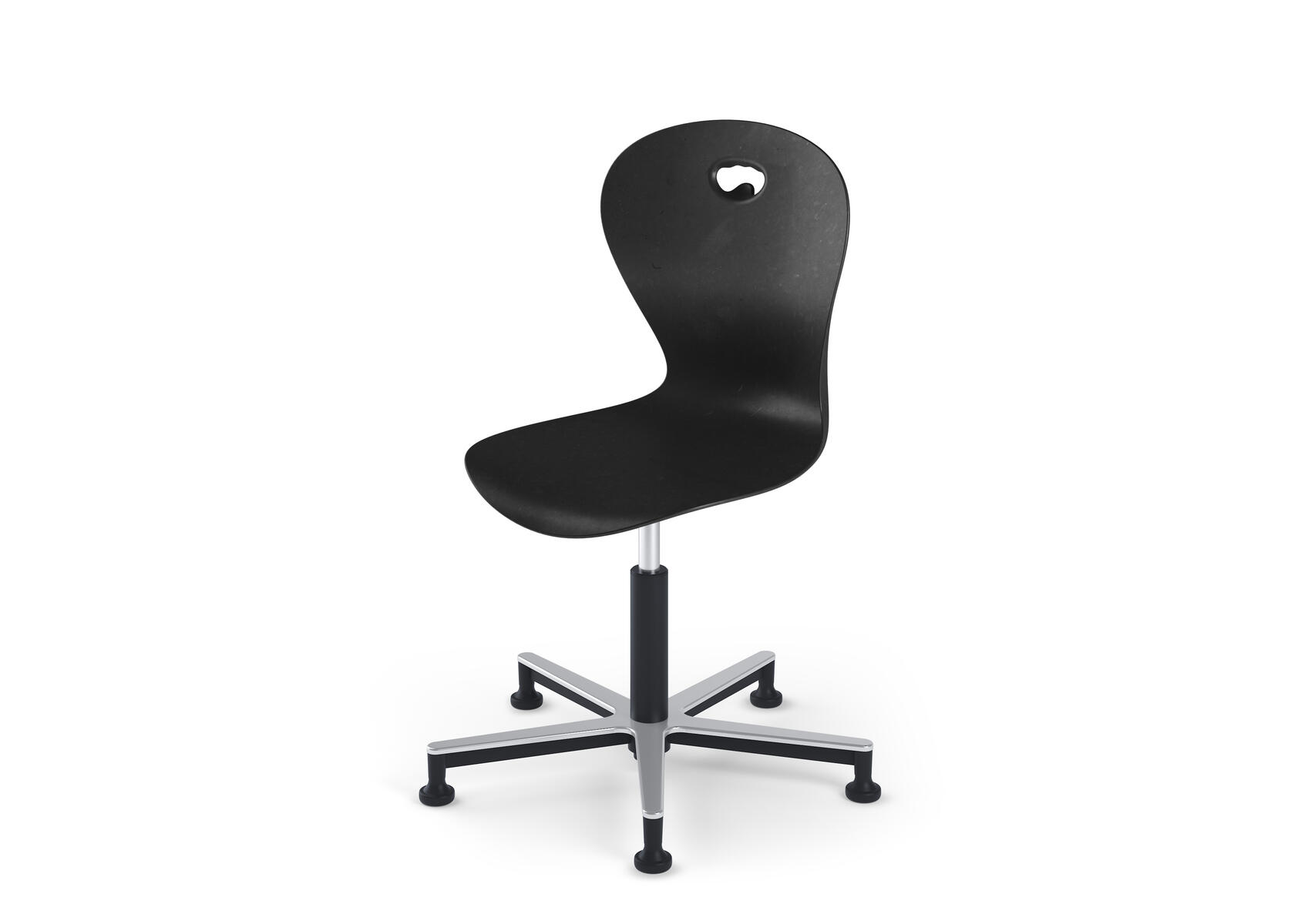 Plastskal av 100 % återvunnet material. Stolen uppfyller EN 1729-1 Sixemark 5&6, vilket innebär att användare mellan 146 och 188 cm sitter bekvämt och ergonomiskt riktigt. Väskkrok på baksidan. Moviflexmekanismen gör att man kan vippa på sitsen åt alla håll, vilket uppmuntrar ett aktivt sittande. Borstat aluminiumkryss med glidfötter. Mått: Sitthöjd 50-70 cm. Sitsbredd 42. Sitsdjup 40 cm. Välj till klädd sits i 100 % återvunnet material.
