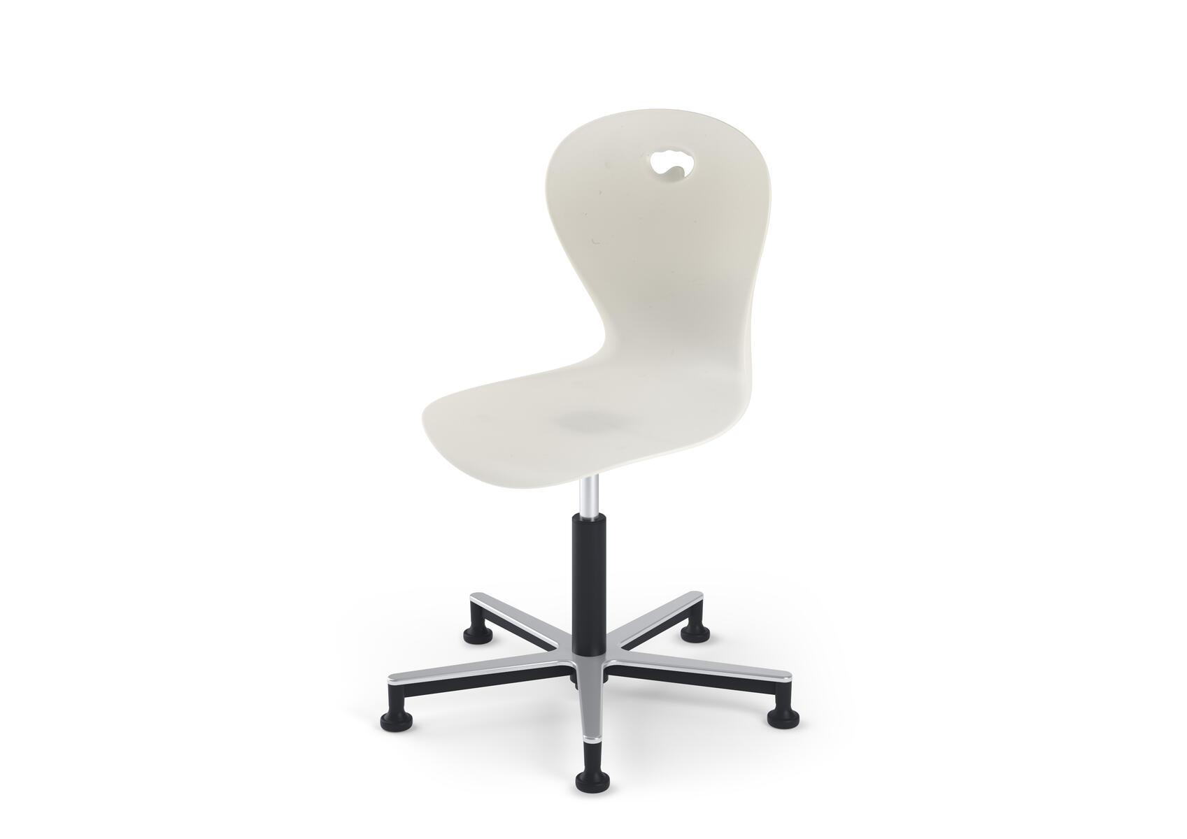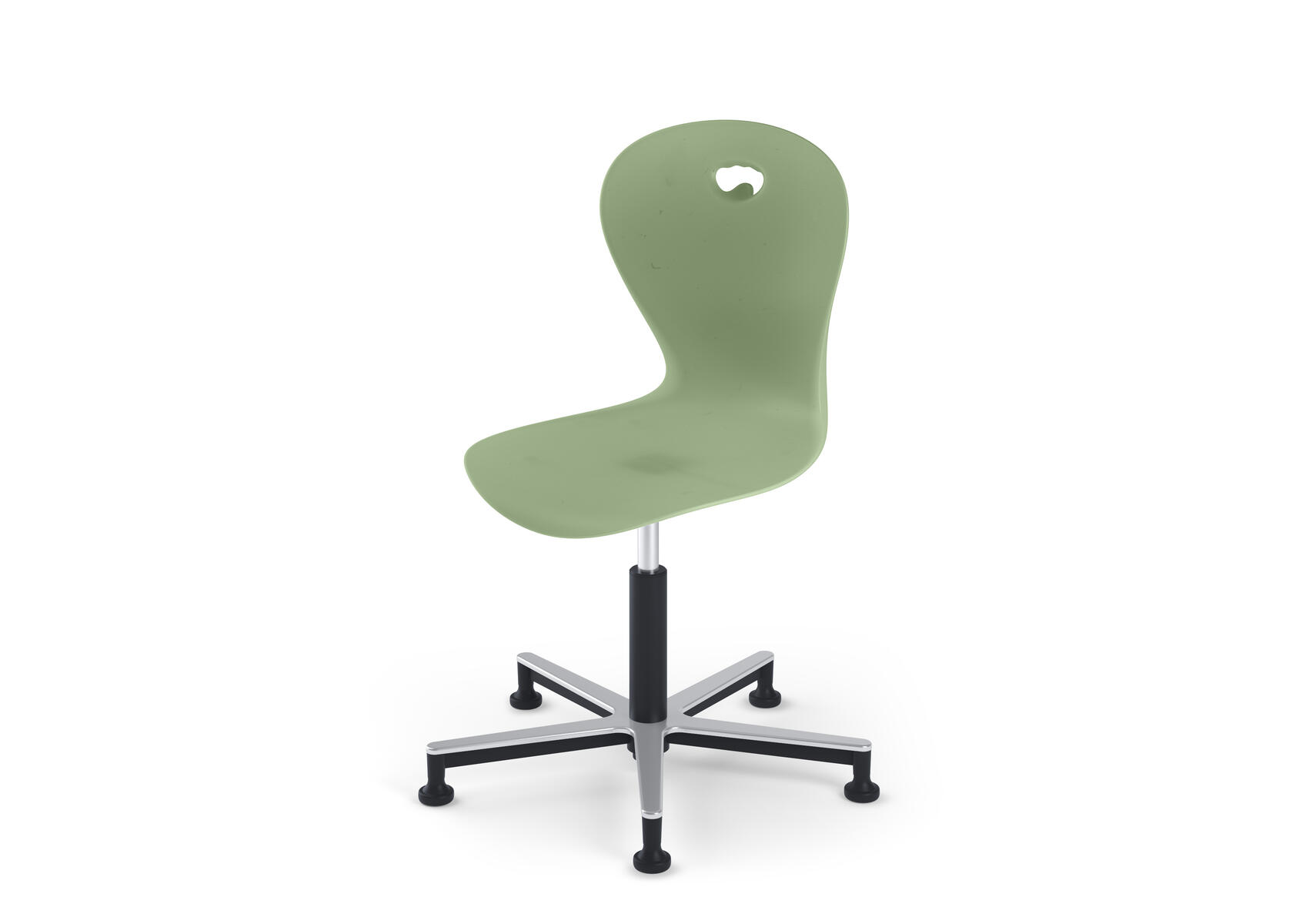 Plastskal av 100 % återvunnet material. Stolen uppfyller EN 1729-1 Sixemark 5&6, vilket innebär att användare mellan 146 och 188 cm sitter bekvämt och ergonomiskt riktigt. Väskkrok på baksidan. Moviflexmekanismen gör att man kan vippa på sitsen åt alla håll, vilket uppmuntrar ett aktivt sittande. Borstat aluminiumkryss med glidfötter. Mått: Sitthöjd 50-70 cm. Sitsbredd 42. Sitsdjup 40 cm. Välj till klädd sits i 100 % återvunnet material.