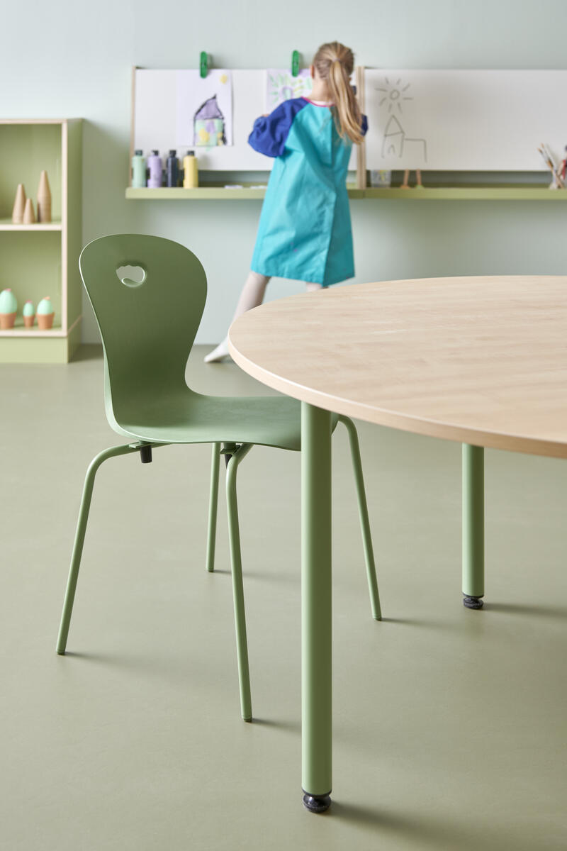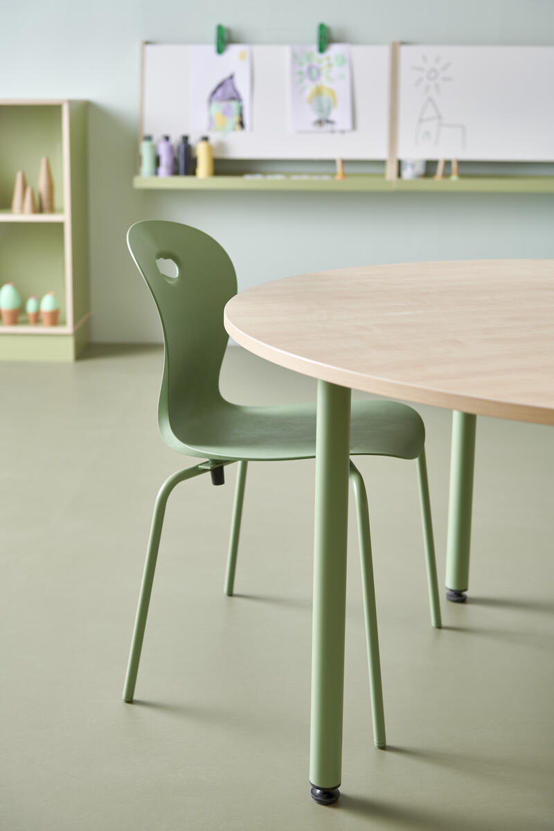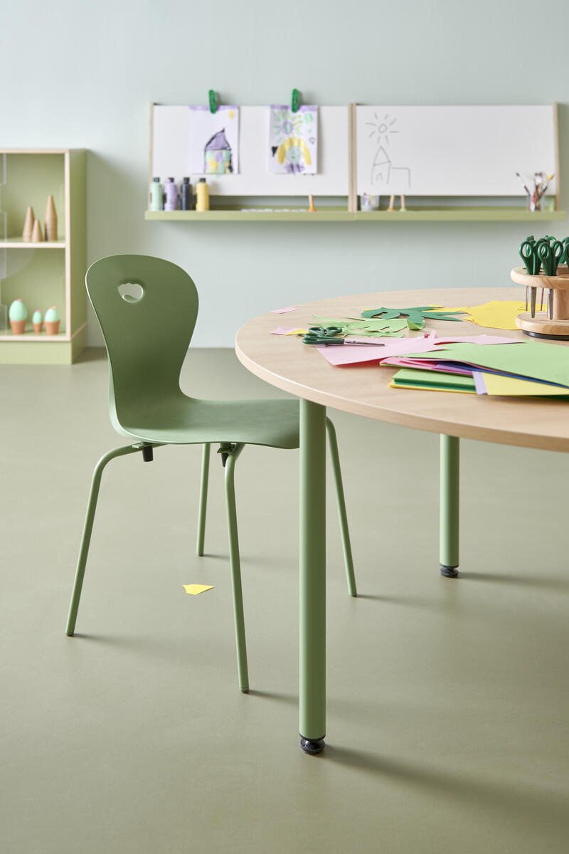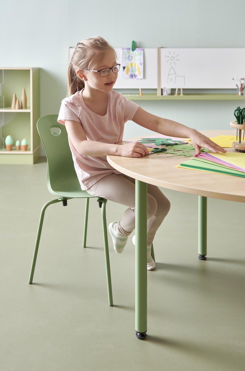 Plastskal av 100 % återvunnet material. Stolen uppfyller EN 1729-1&2 Sizemark 4-5, vilket innebär att användare mellan 133 och 176 cm sitter bekvämt och ergonomiskt riktigt. Väskkrok på baksidan. Stapelbar och upphängningsbar när man vänder den. Lätt att rengöra. Silverlackerat stativ RAL 9006.