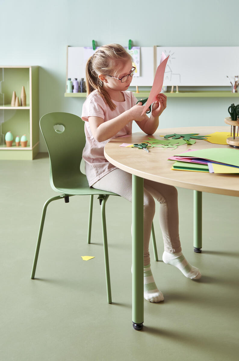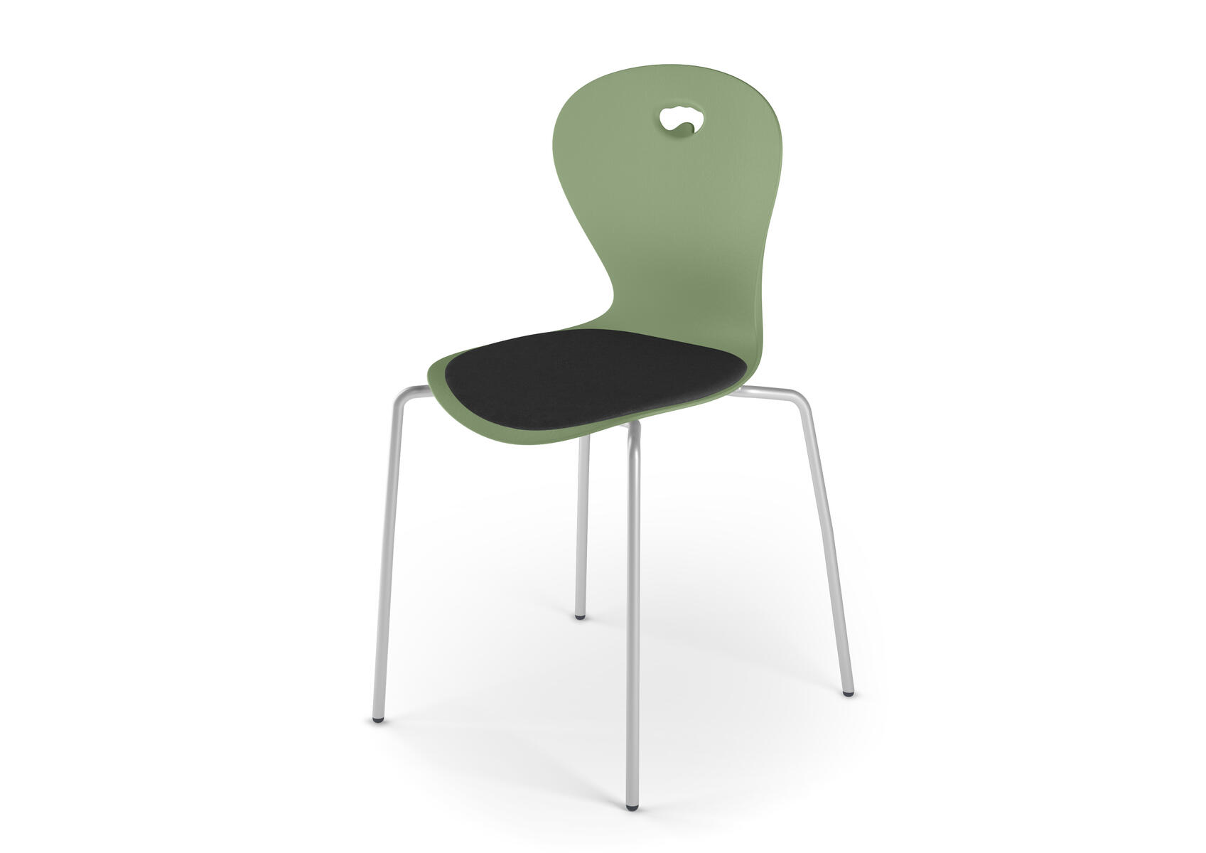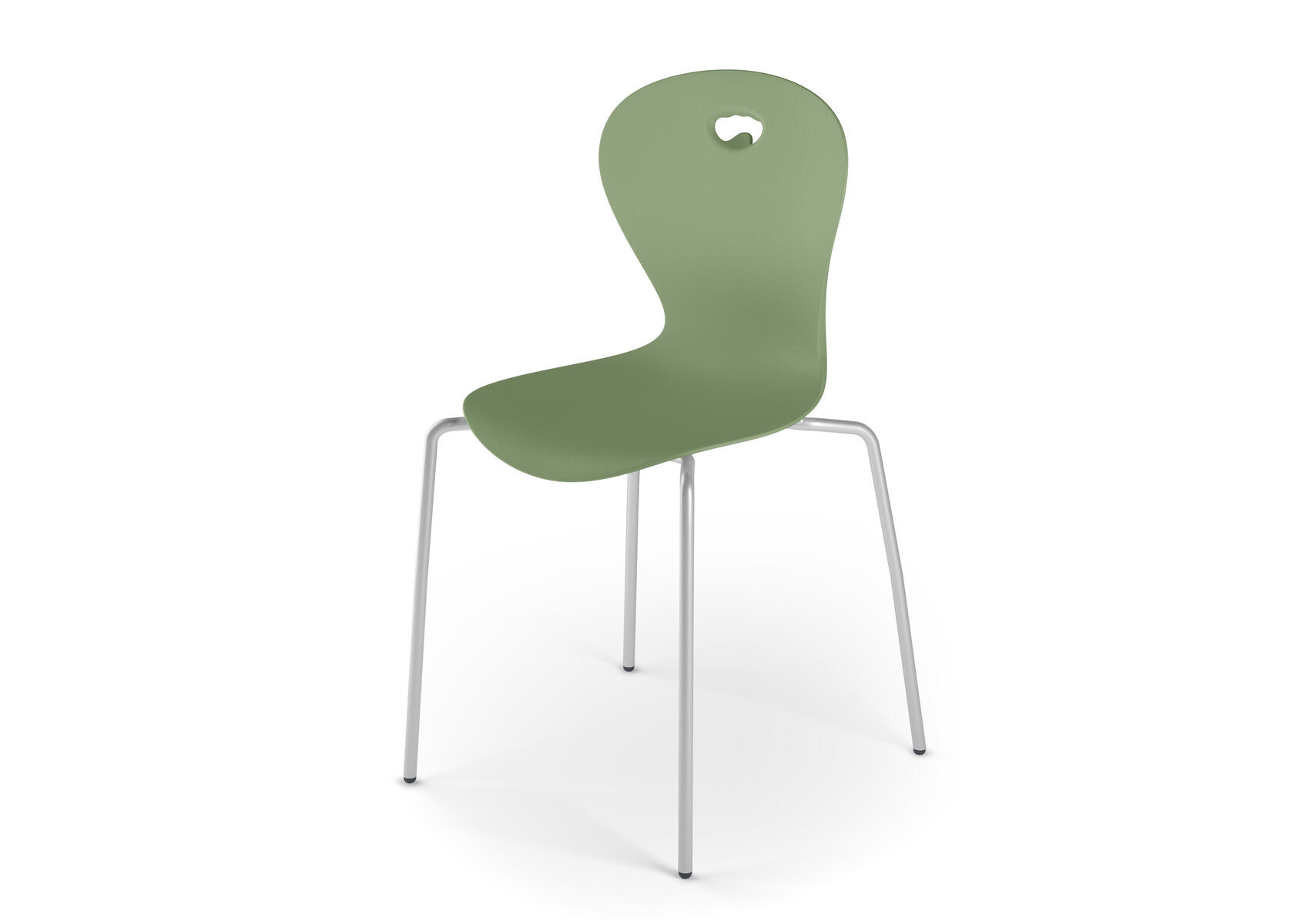 Plastskal av 100 % återvunnet material. Stolen uppfyller EN 1729-1&2 Sizemark 4-5, vilket innebär att användare mellan 133 och 176 cm sitter bekvämt och ergonomiskt riktigt. Väskkrok på baksidan. Stapelbar och upphängningsbar när man vänder den. Lätt att rengöra. Silverlackerat stativ RAL 9006.