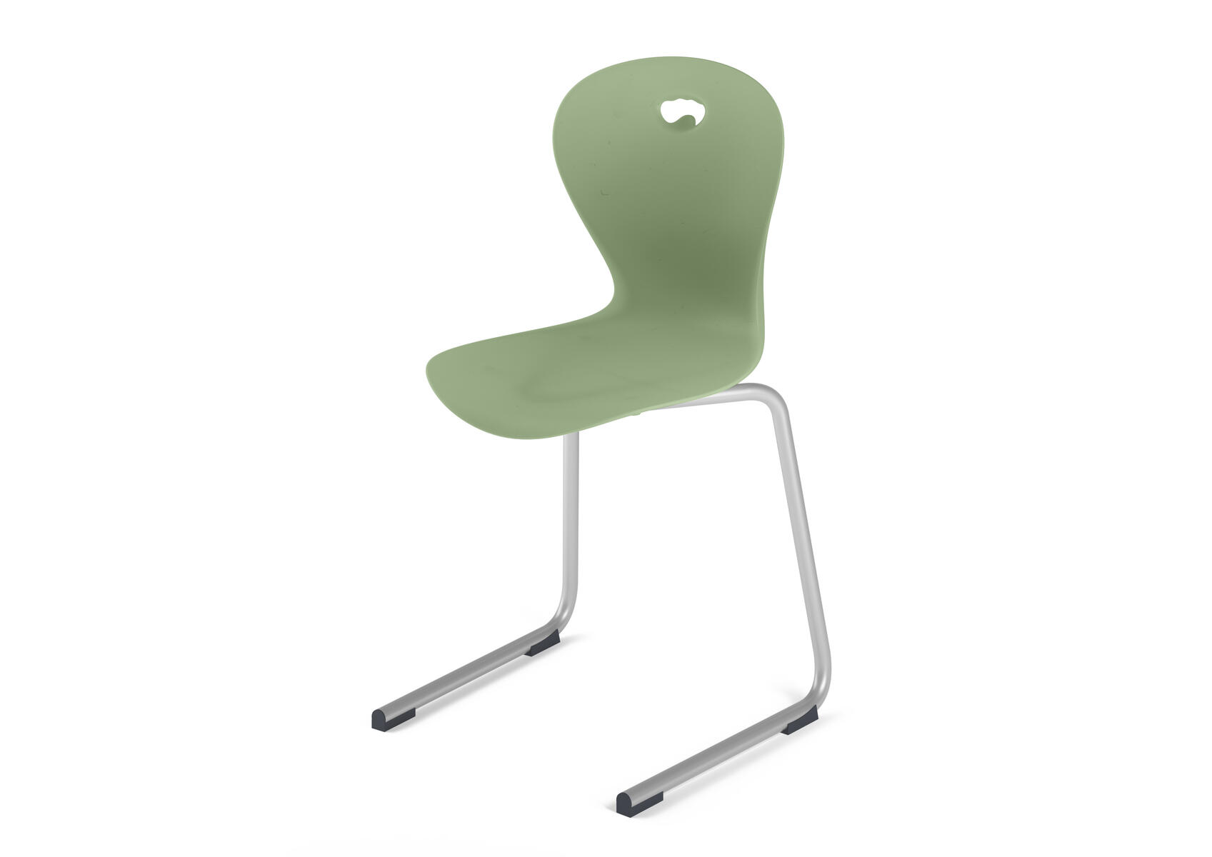 Plastskal av 100 % återvunnet material. Stolen uppfyller EN 1729-1&2 Sizemark 4-5, vilket innebär att användare mellan 133 och 176 cm sitter bekvämt och ergonomiskt riktigt. Väskkrok på baksidan. Stapelbar med max 4 stolar och stativet är utformat för att enkelt kunna hänga upp den. Lätt att rengöra. Silverlackerat stativ RAL 9006.