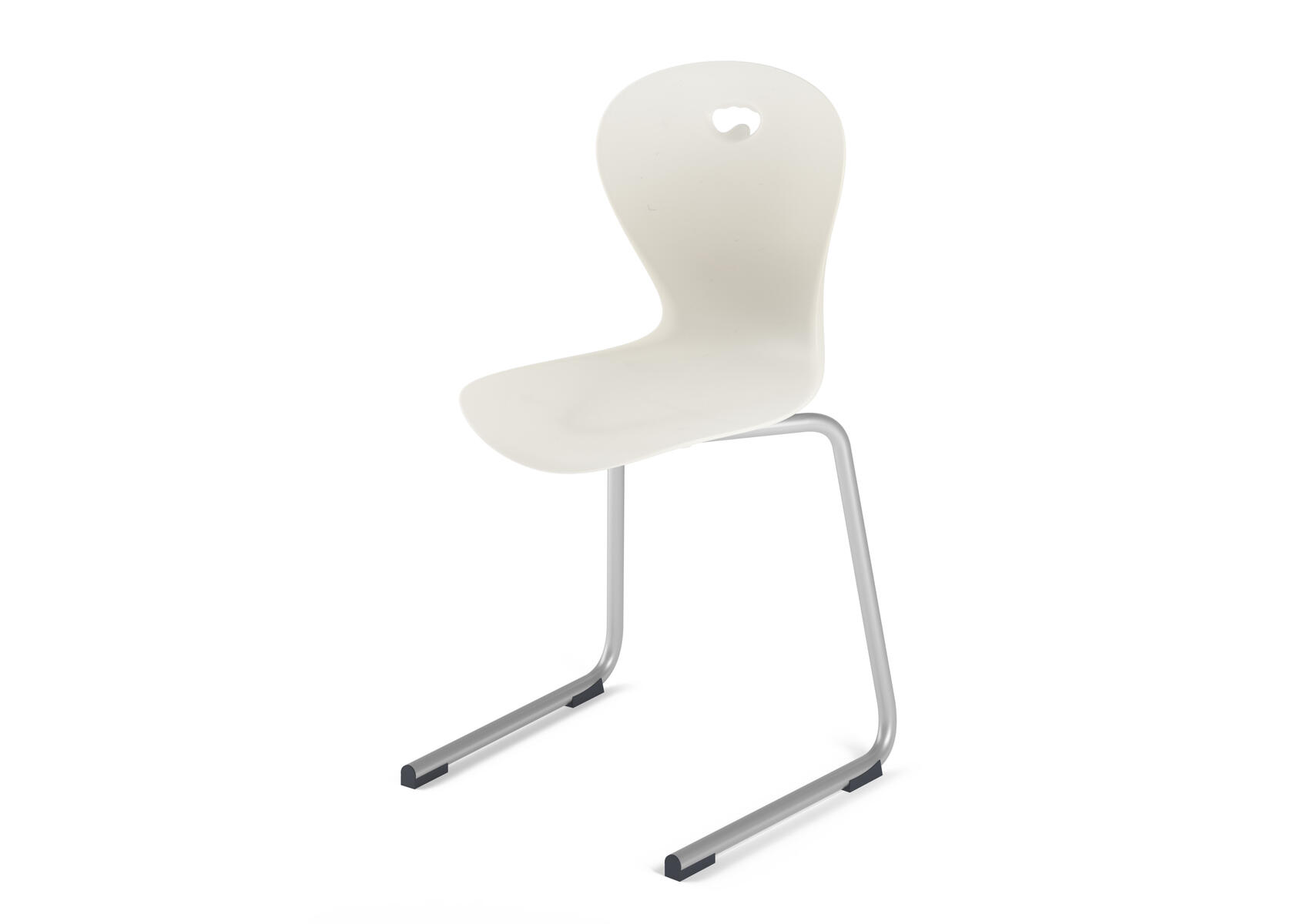 Plastskal av 100 % återvunnet material. Stolen uppfyller EN 1729-1&2 Sizemark 4-5, vilket innebär att användare mellan 133 och 176 cm sitter bekvämt och ergonomiskt riktigt. Väskkrok på baksidan. Stapelbar med max 4 stolar och stativet är utformat för att enkelt kunna hänga upp den. Lätt att rengöra. Vitlackerat stativ RAL 9003.