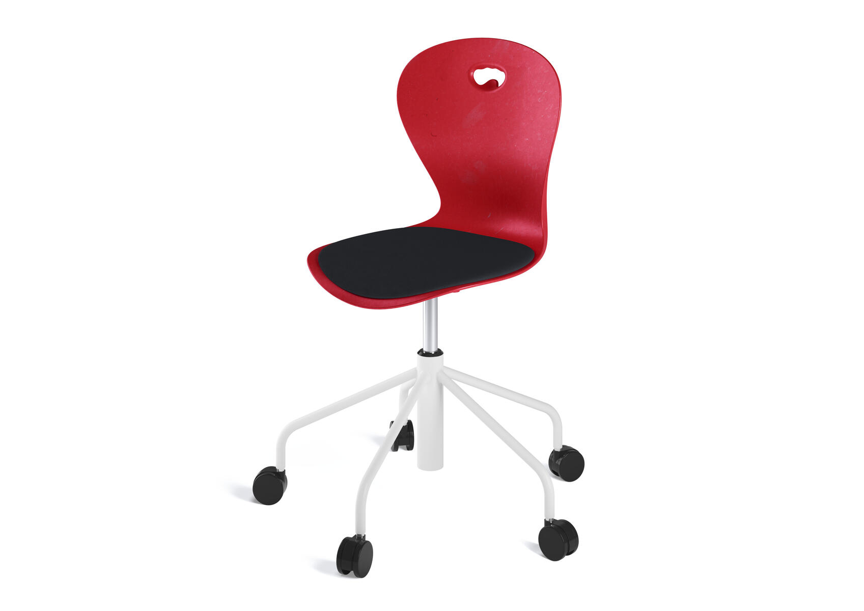 Stol Take med ett högt 5-krysstativ på hjul lackerat i RAL 9005. Sitthöjd justeras med gasfjäder i intervallerna 46-57. Plastskalet ger ett flexibelt stöd för ryggen. Lätt att rengöra. Skal i polyuretan.
