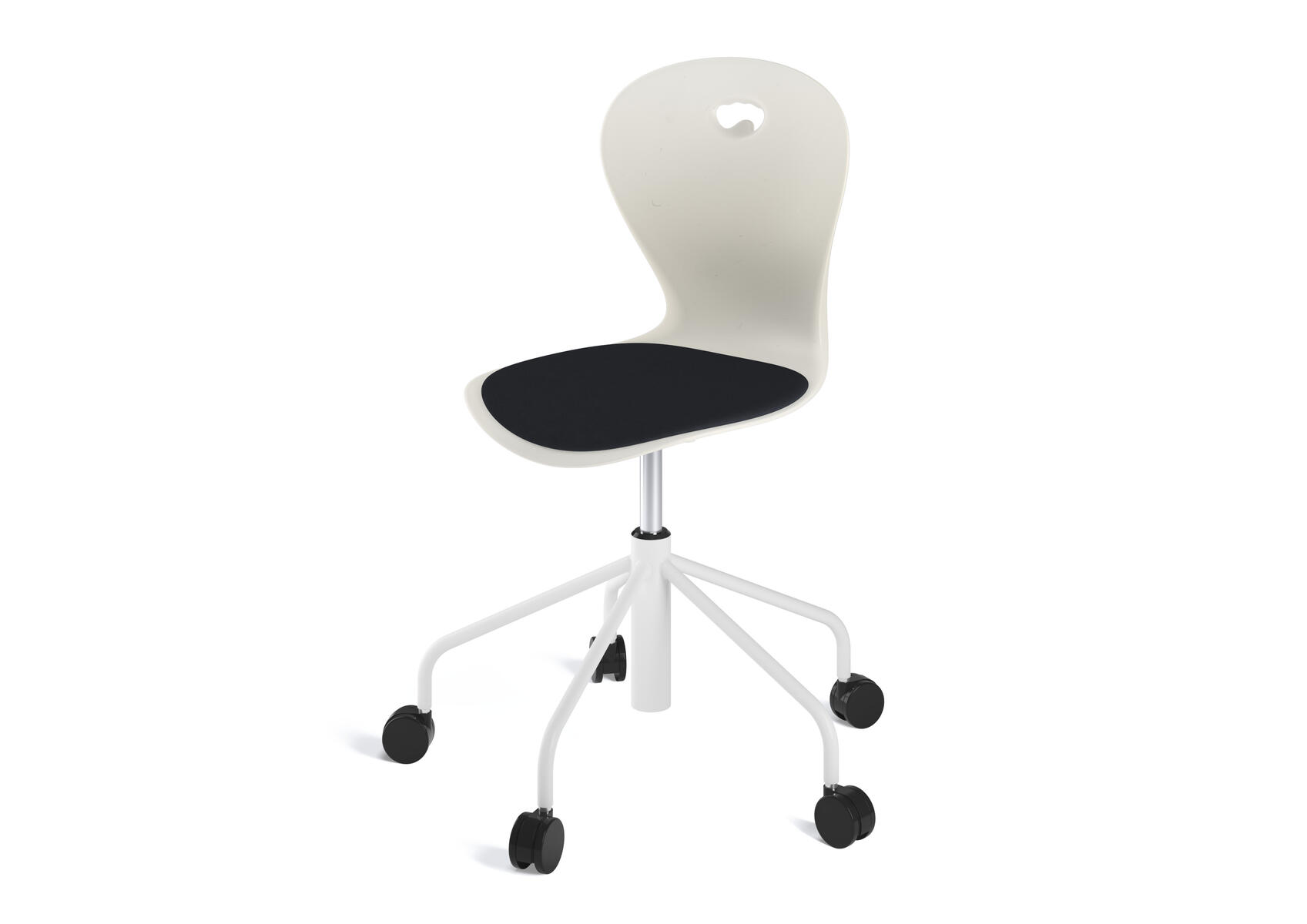 Stol Take med ett högt 5-krysstativ på hjul lackerat i RAL 9003. Sitthöjd justeras med gasfjäder i intervallerna 46-57. Plastskalet ger ett flexibelt stöd för ryggen. Lätt att rengöra. Skal i polyuretan.