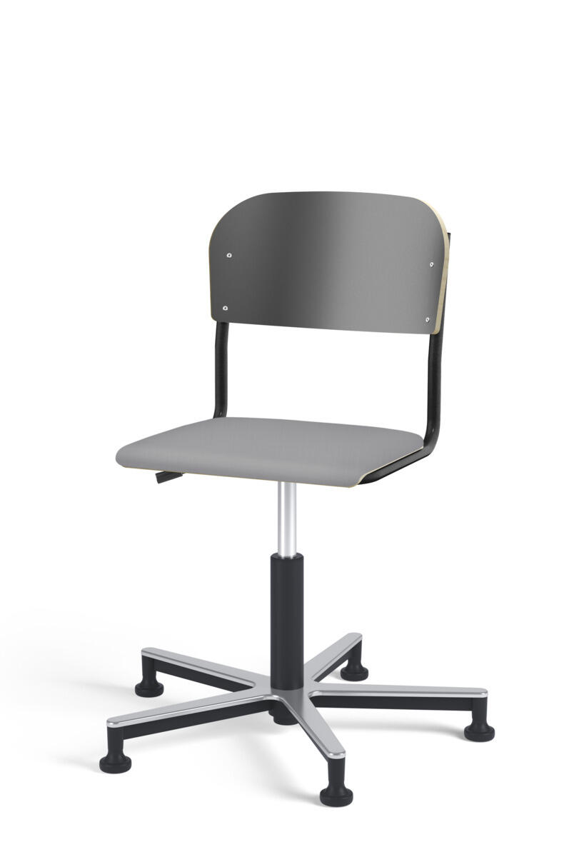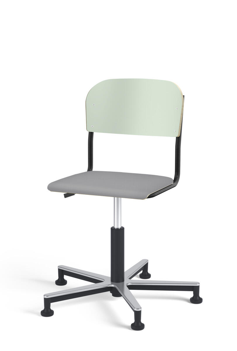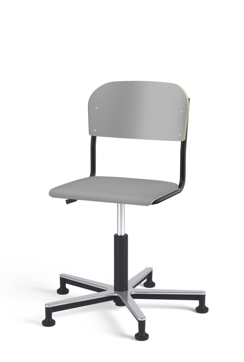 Stol Matte med gasfjäder för reglering av sitthöjd med hjälp av en spak. Sits och rygg i högtryckslaminat. Ram till sits och rygg i pulverlackerat stål, silver. Kryss i aluminium med glidfötter.