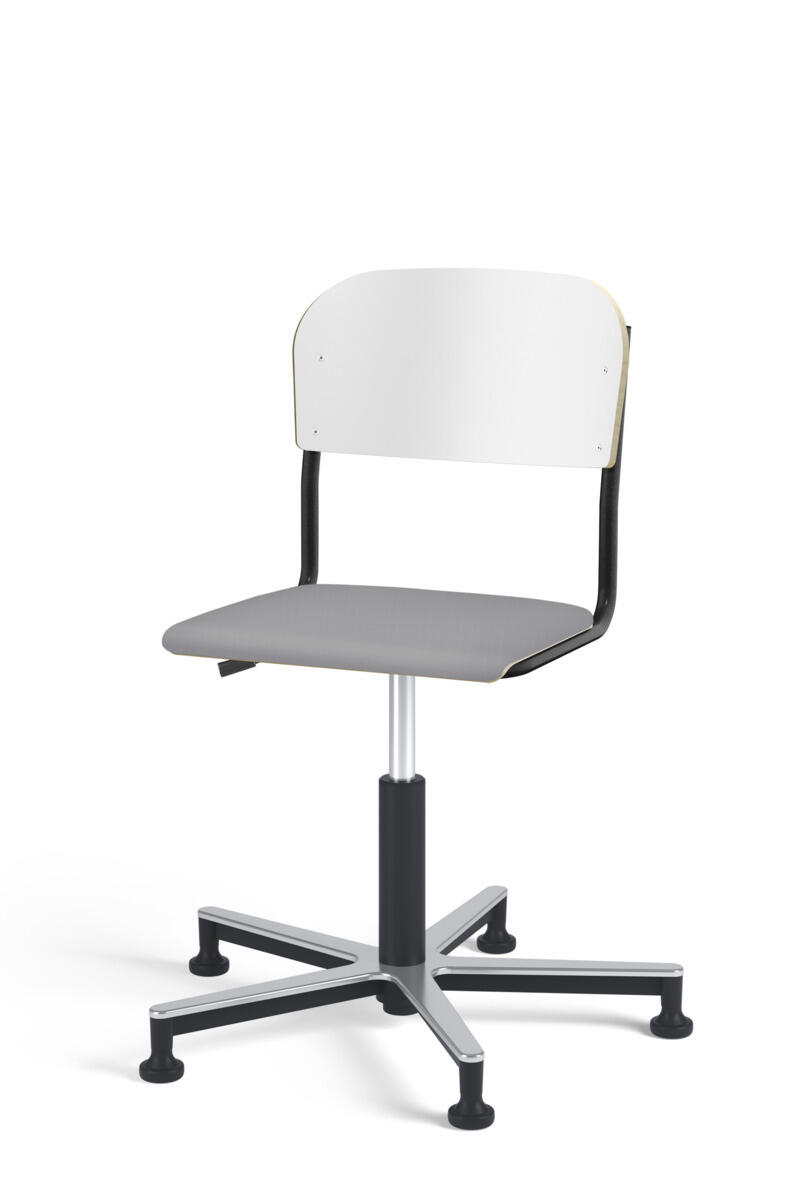 Stol Matte med gasfjäder för reglering av sitthöjd med hjälp av en spak. Sits och rygg i högtryckslaminat. Ram till sits och rygg i pulverlackerat stål, vit. Kryss i aluminium med glidfötter.