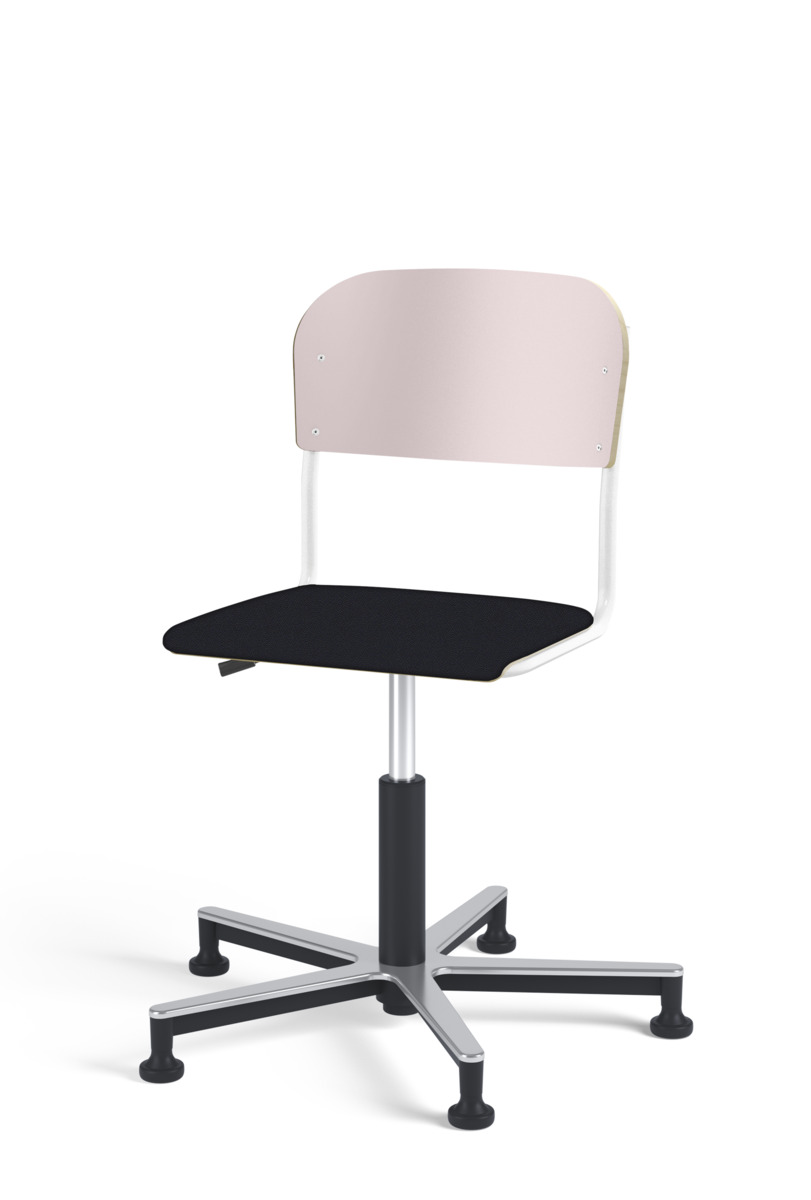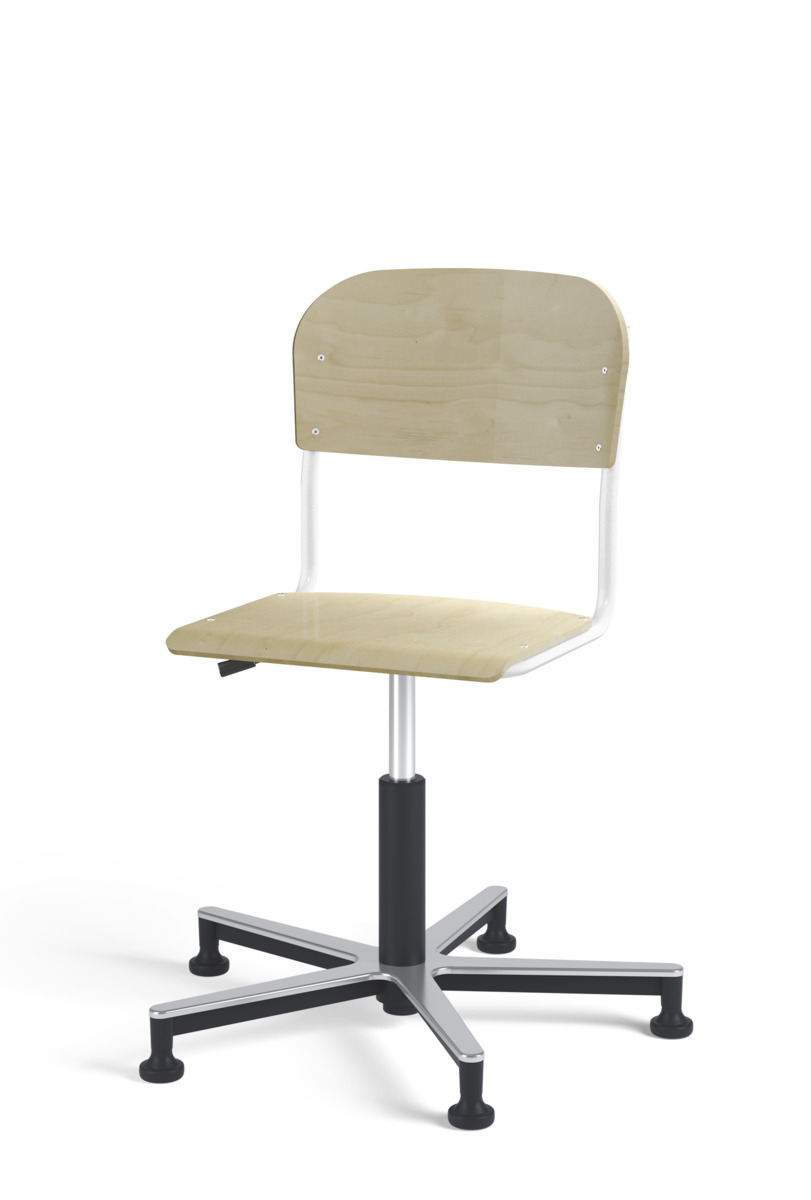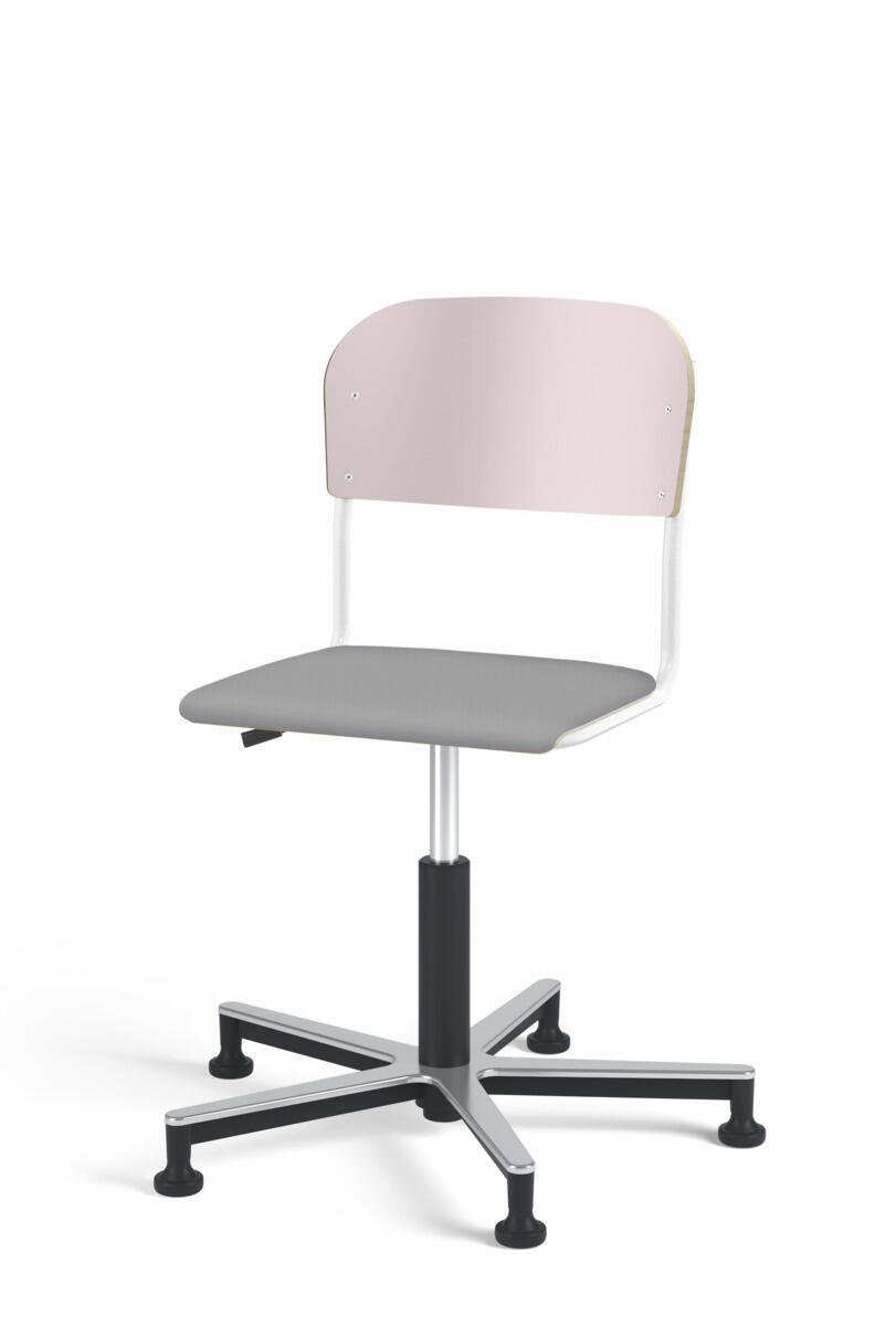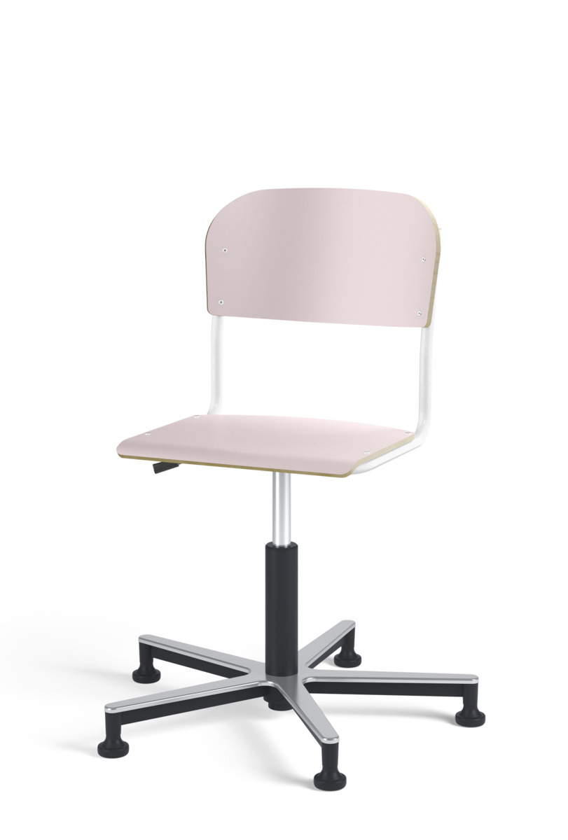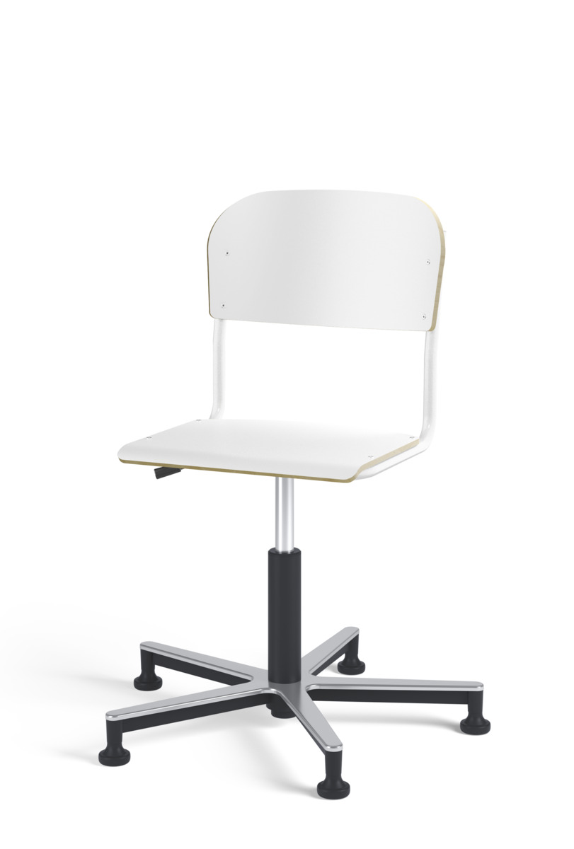 Stol Matte med gasfjäder för reglering av sitthöjd med hjälp av en spak. Sits och rygg i högtryckslaminat. Ram till sits och rygg i pulverlackerat stål, vit. Kryss i aluminium med hjul.