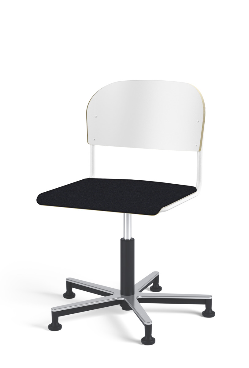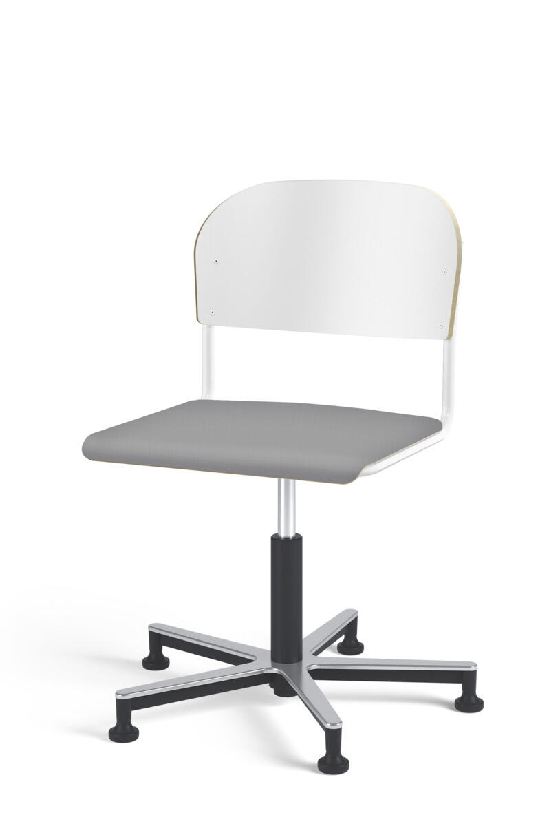 Stol Matte med gasfjäder för reglering av sitthöjd med hjälp av en spak. Sits och rygg i högtryckslaminat. Ram till sits och rygg i pulverlackerat stål, vit. Kryss i aluminium med glidfötter.