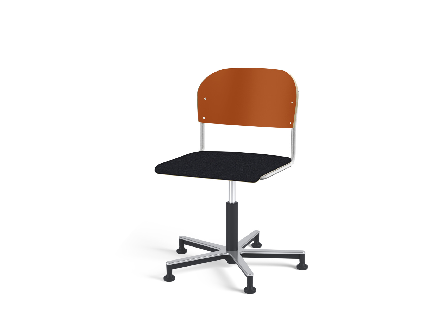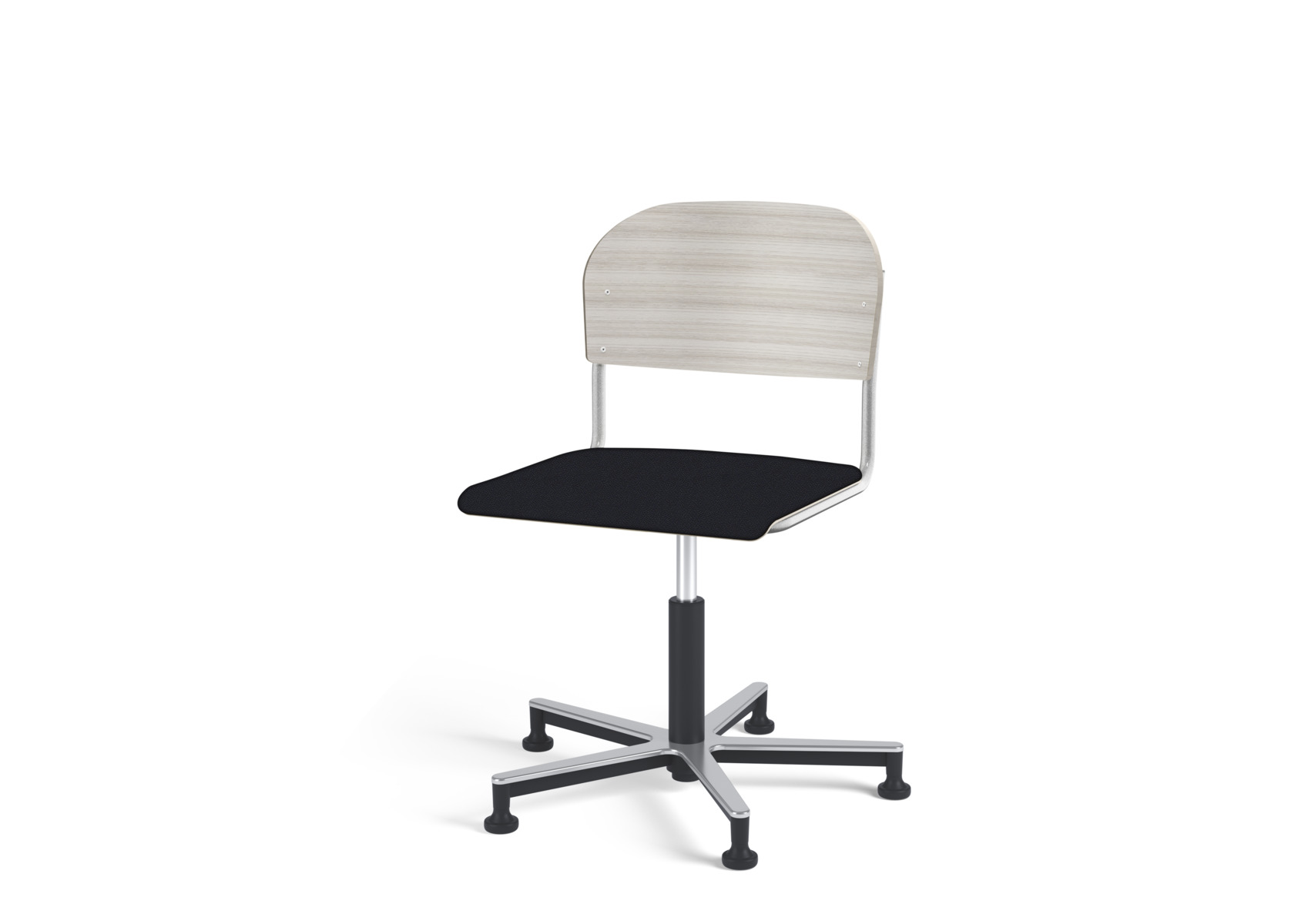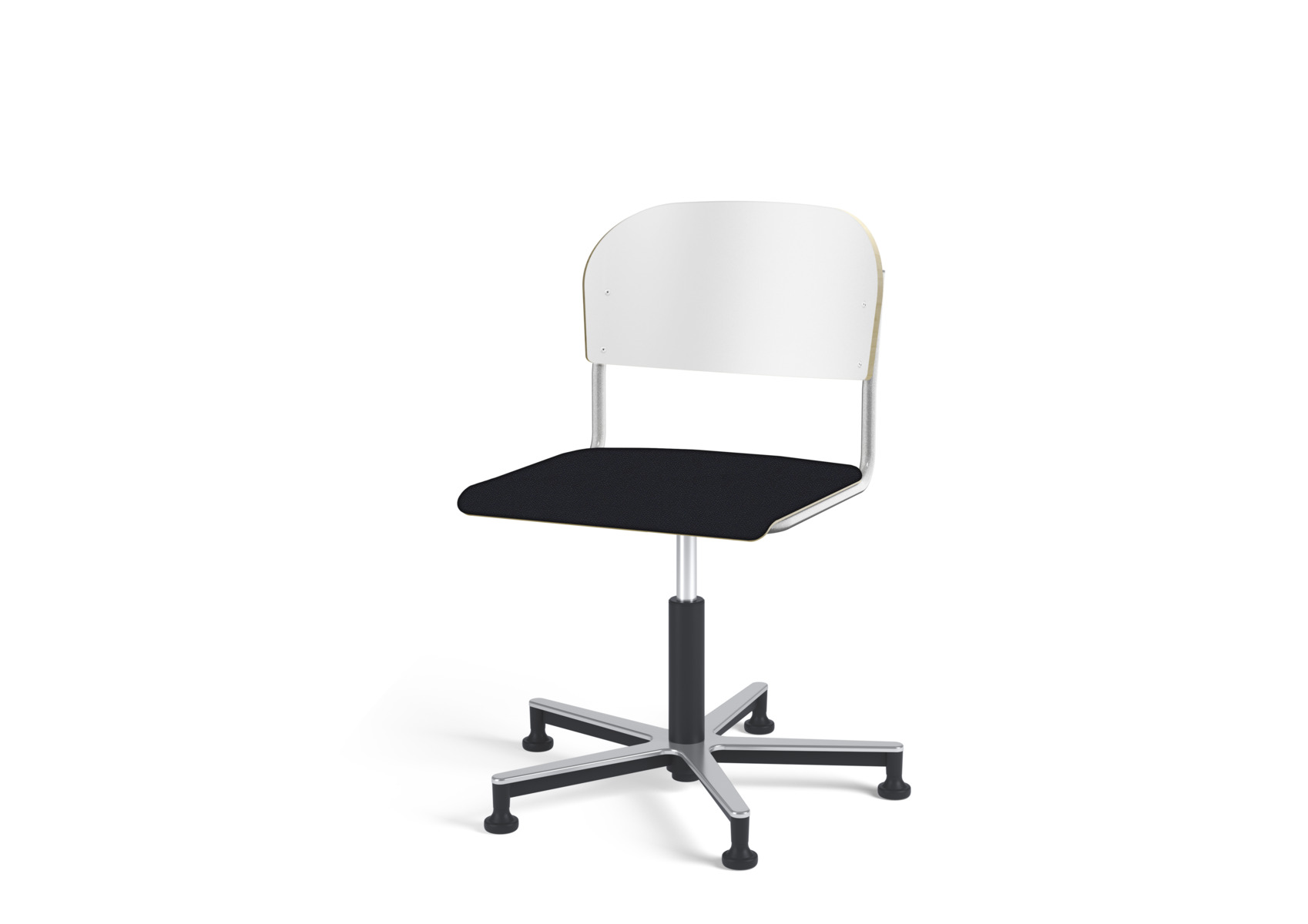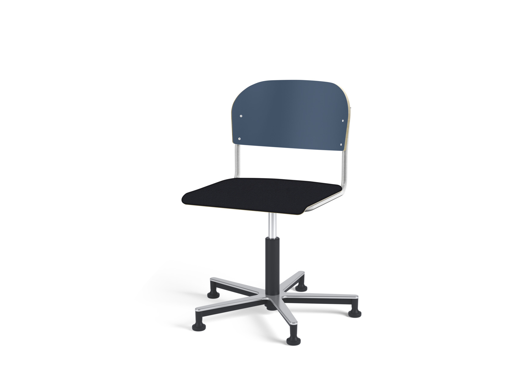 Levereras med hjul och glidfötter. Upphängningsbar. Justerbar sitthöjd 39-51 cm. Sitsmått: B40xD35 cm. Kryss i svart plast. Sits och rygg i björkfaner. Denna stol hette tidigare Trine.