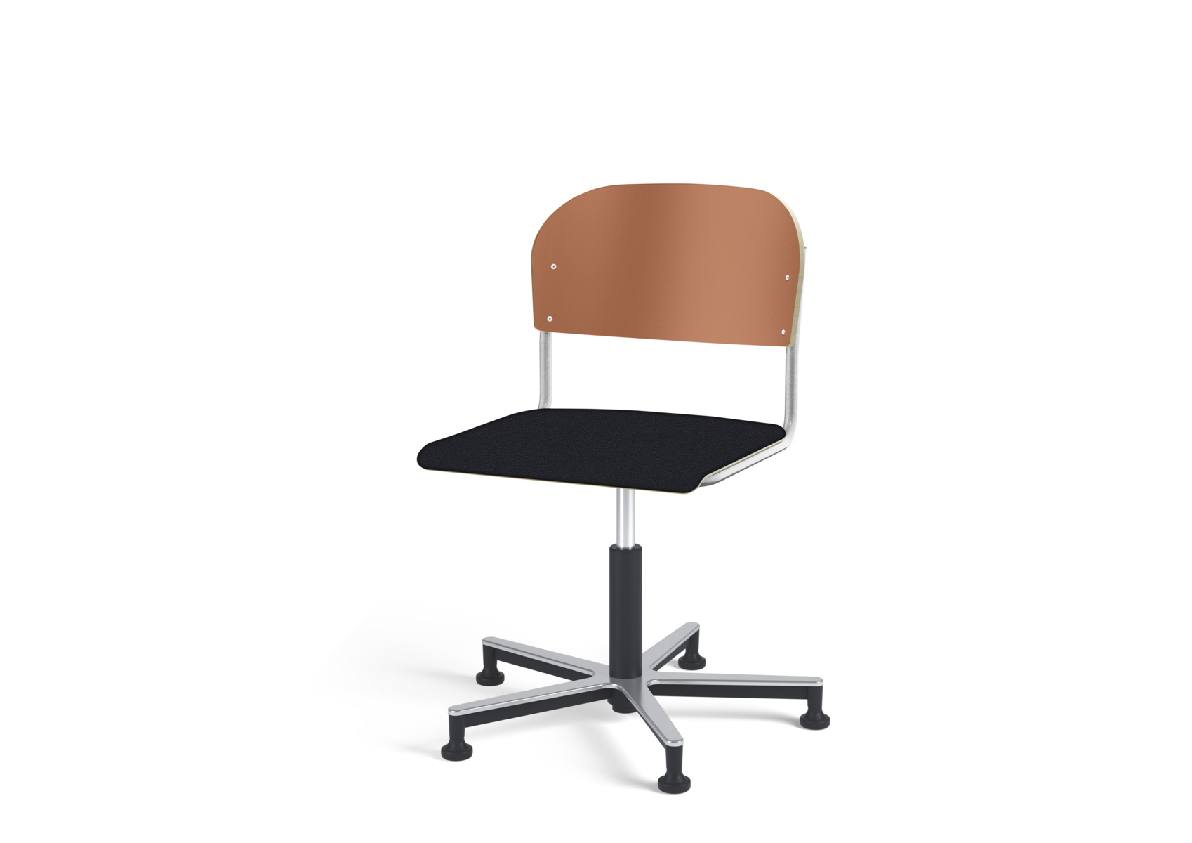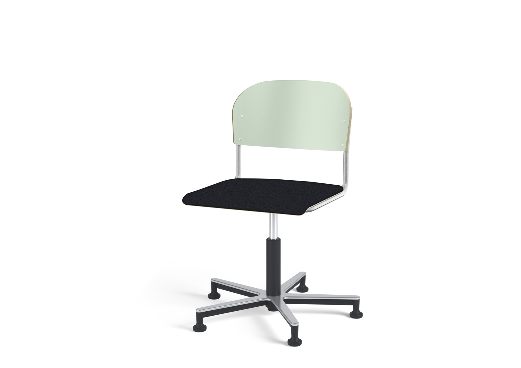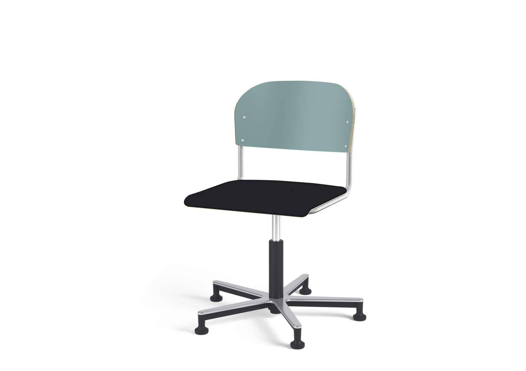 Levereras med hjul och glidfötter. Upphängningsbar. Justerbar sitthöjd 39-51 cm. Sitsmått: B40xD35 cm. Kryss i svart plast. Sits och rygg i björkfaner. Denna stol hette tidigare Trine.
