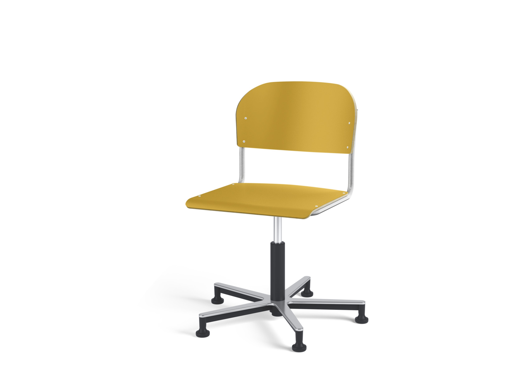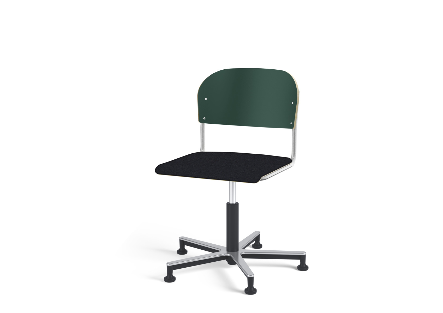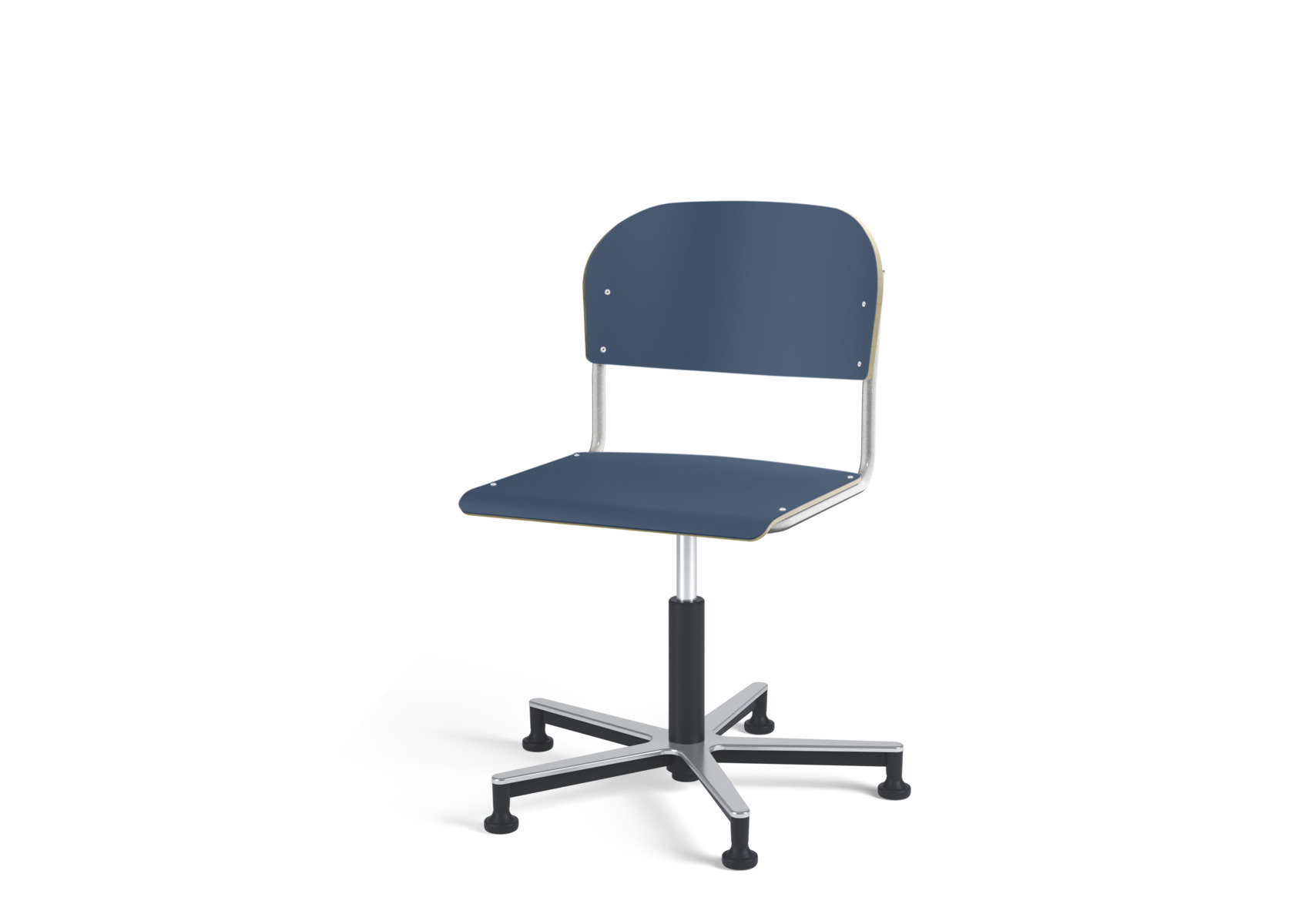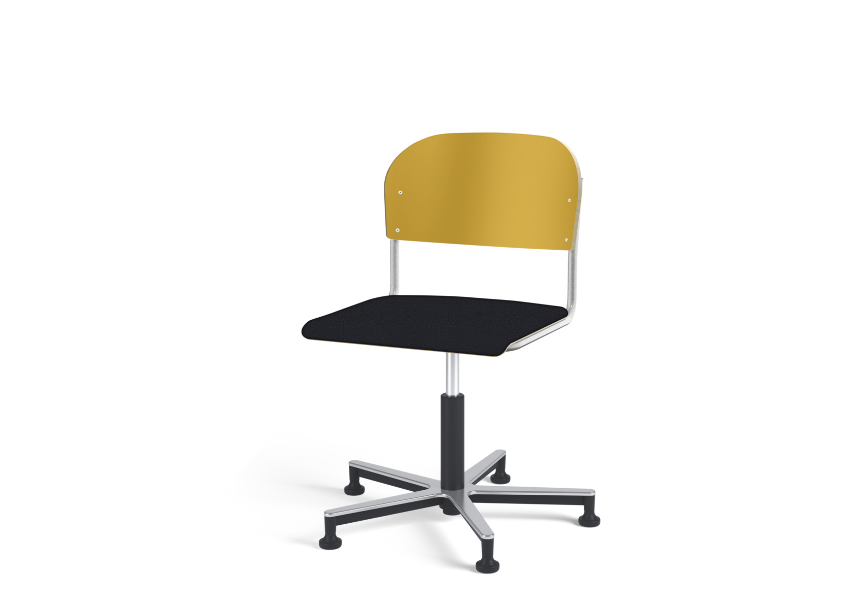 Levereras med hjul och glidfötter. Upphängningsbar. Justerbar sitthöjd 39-51 cm. Sitsmått: B40xD35 cm. Kryss i svart plast. Sits och rygg i björkfaner. Denna stol hette tidigare Trine.