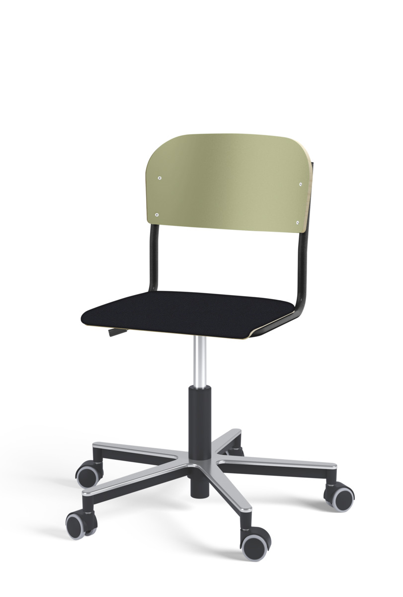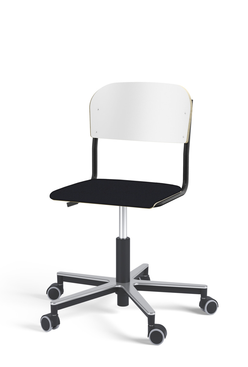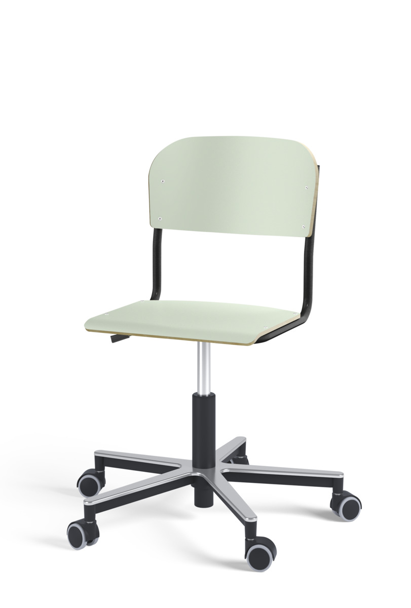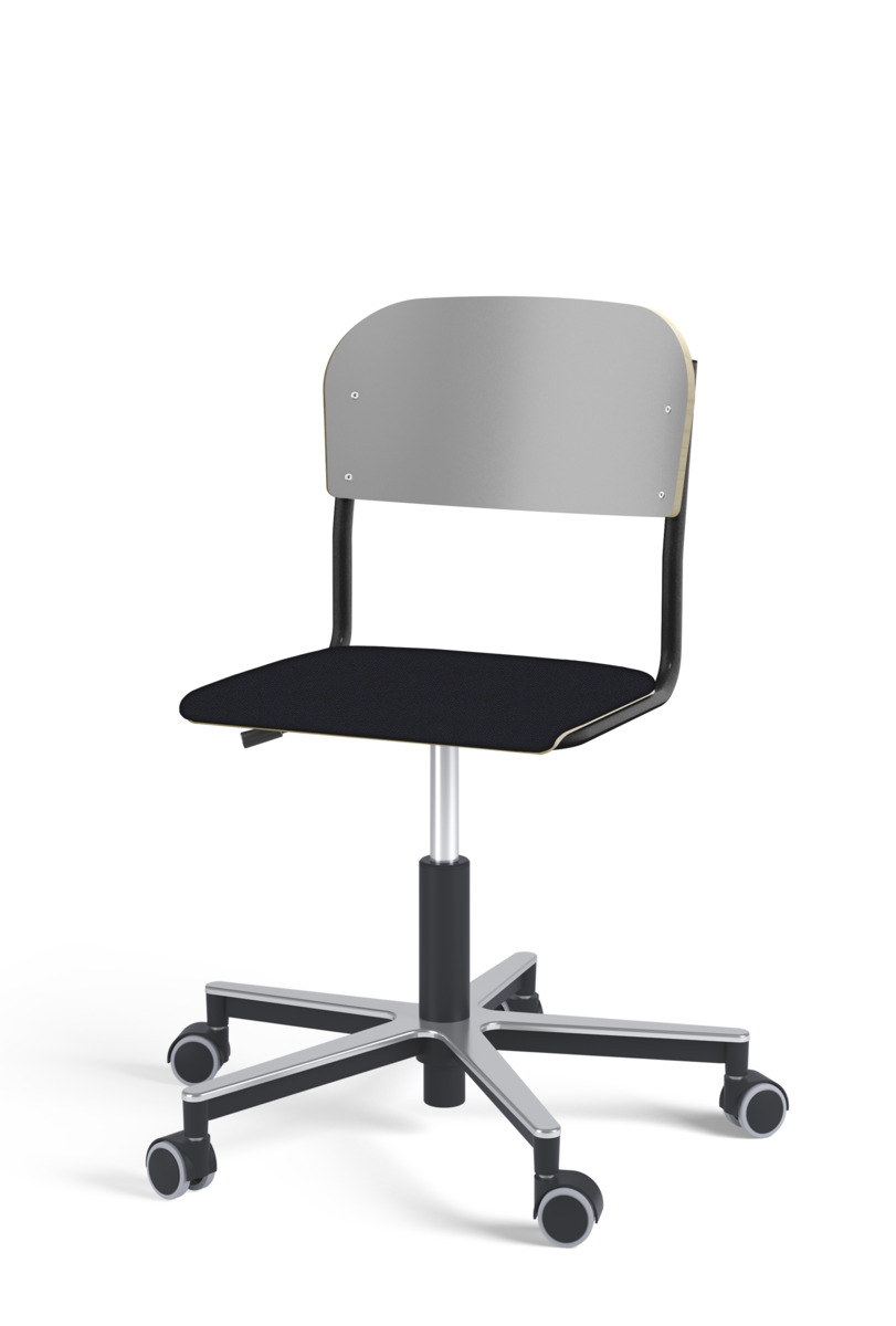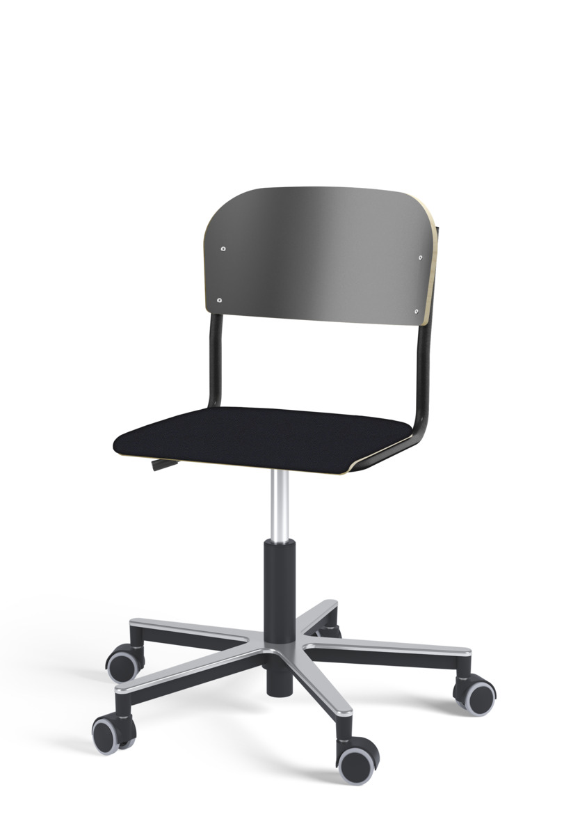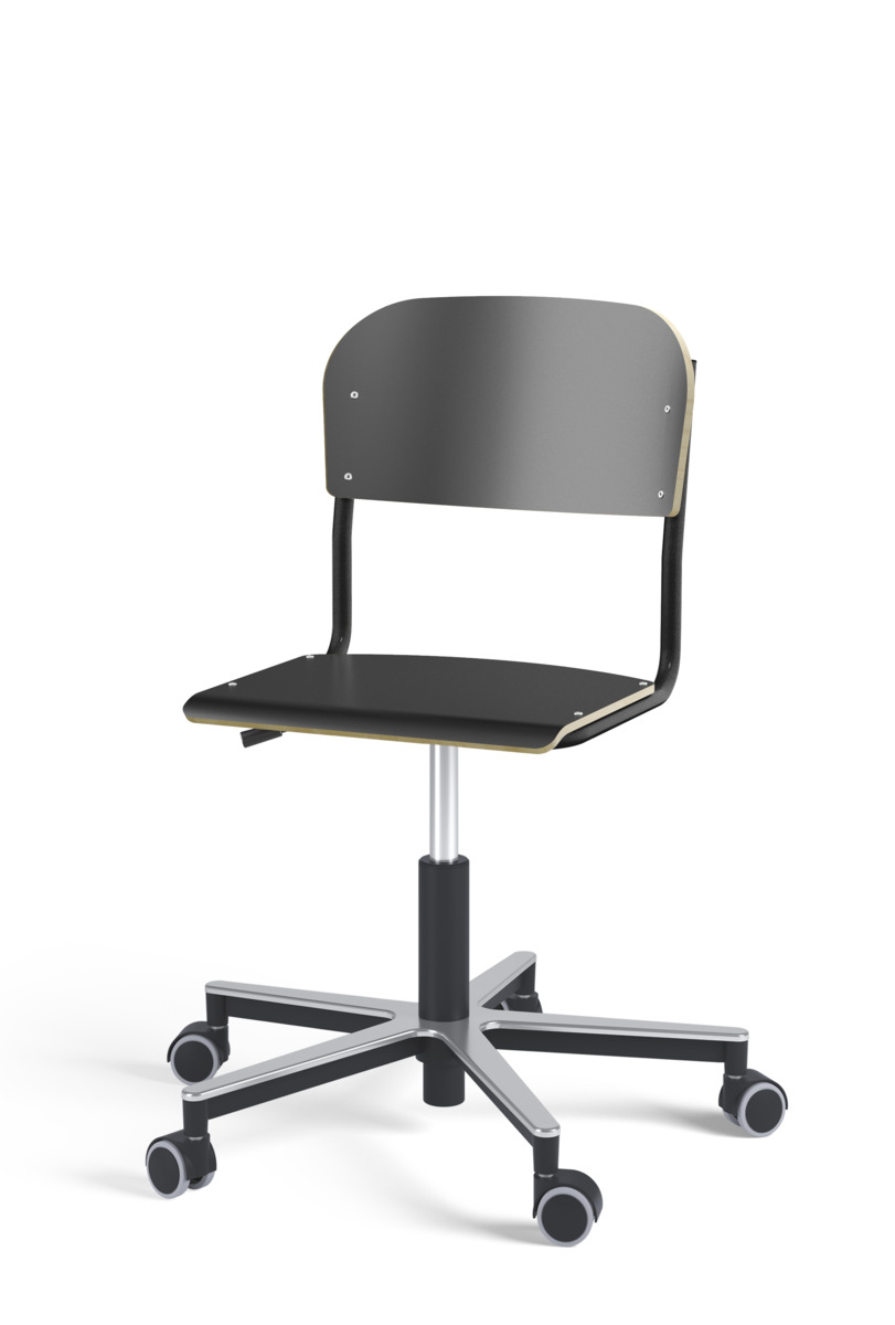 Stol Matte med gasfjäder för reglering av sitthöjd med hjälp av en spak. Sits och rygg i högtryckslaminat. Ram till sits och rygg i pulverlackerat stål, svart. Kryss i aluminium med hjul.