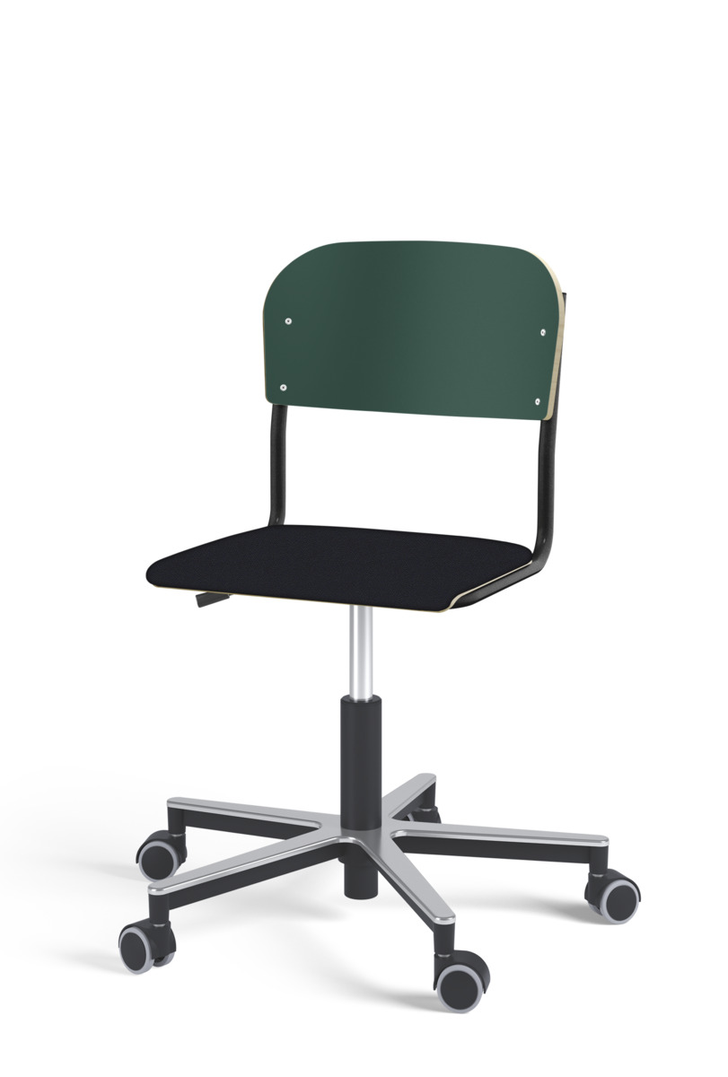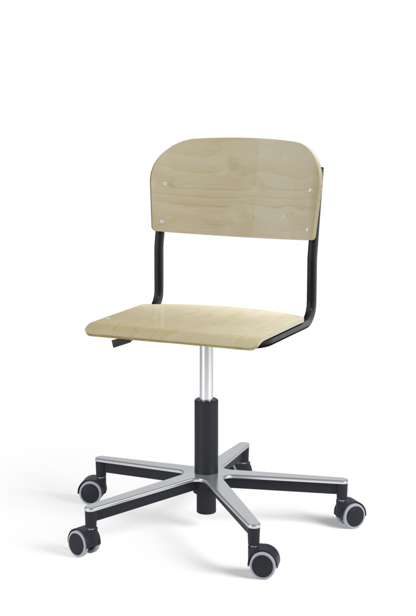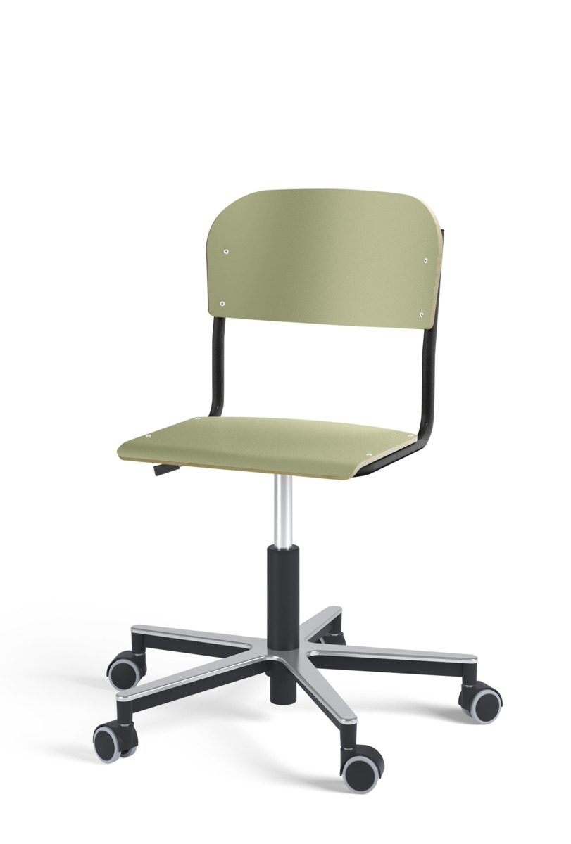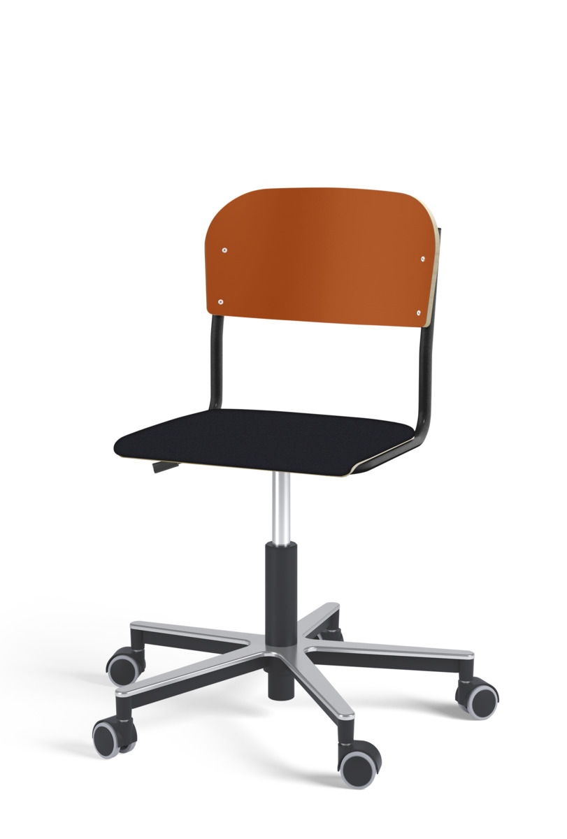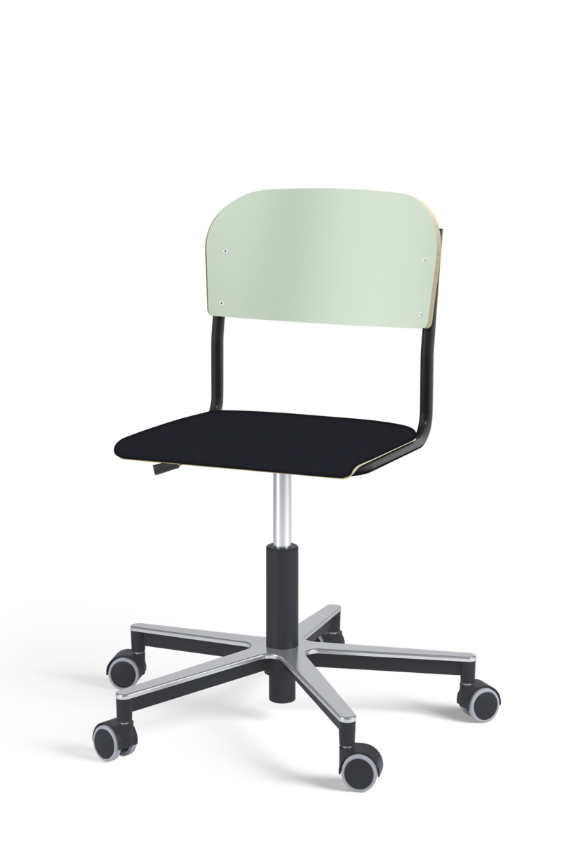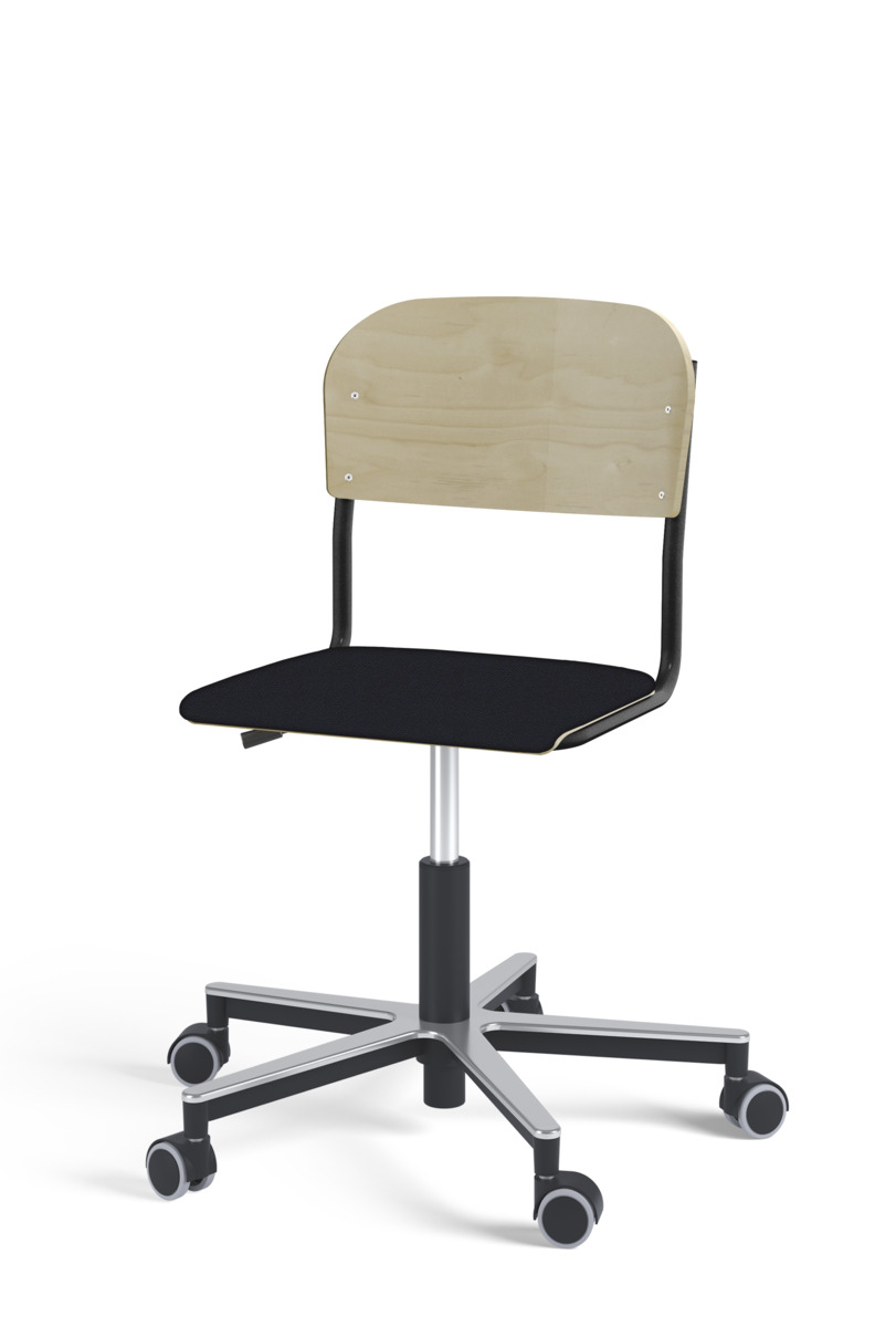 Stol Matte med gasfjäder för reglering av sitthöjd med hjälp av en spak. Sits och rygg i högtryckslaminat. Ram till sits och rygg i pulverlackerat stål, svart. Kryss i aluminium med hjul.