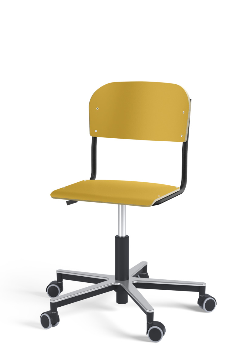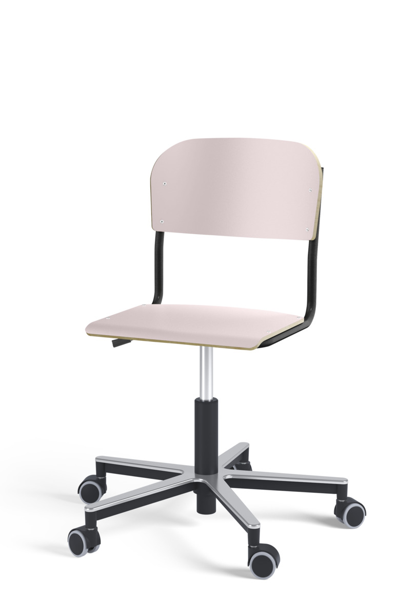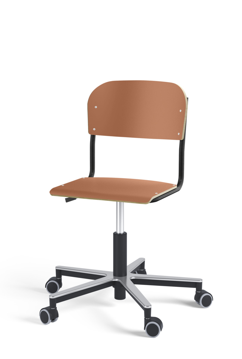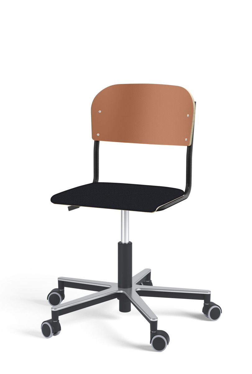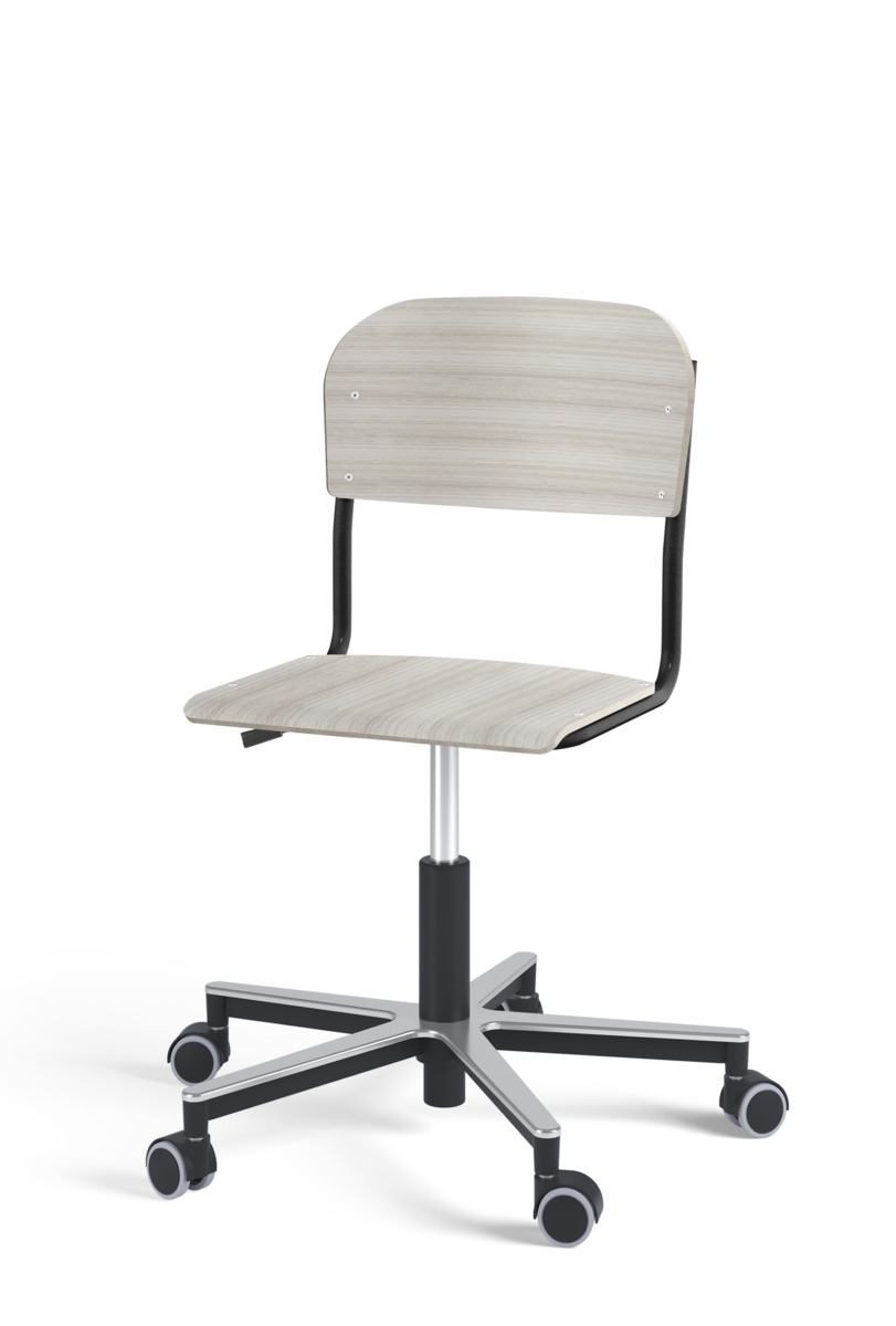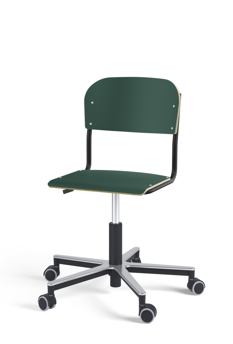 Stol Matte med gasfjäder för reglering av sitthöjd med hjälp av en spak. Sits och rygg i högtryckslaminat. Ram till sits och rygg i pulverlackerat stål, svart. Kryss i aluminium med hjul.