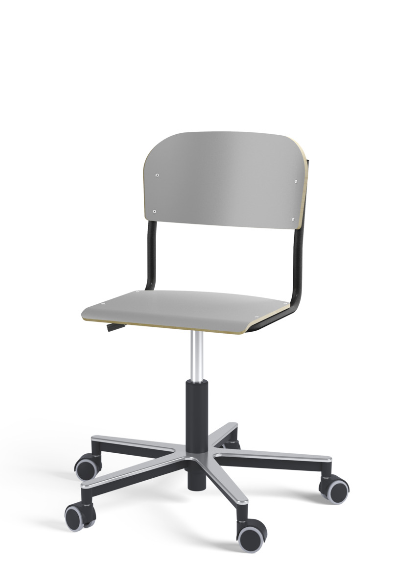 Stol Matte med gasfjäder för reglering av sitthöjd med hjälp av en spak. Sits och rygg i högtryckslaminat. Ram till sits och rygg i pulverlackerat stål, silver. Kryss i aluminium med hjul.
