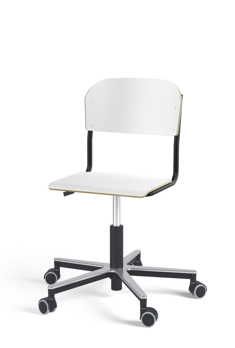 Stol Matte med gasfjäder för reglering av sitthöjd med hjälp av en spak. Sits och rygg i högtryckslaminat. Ram till sits och rygg i pulverlackerat stål, vit. Kryss i aluminium med hjul.