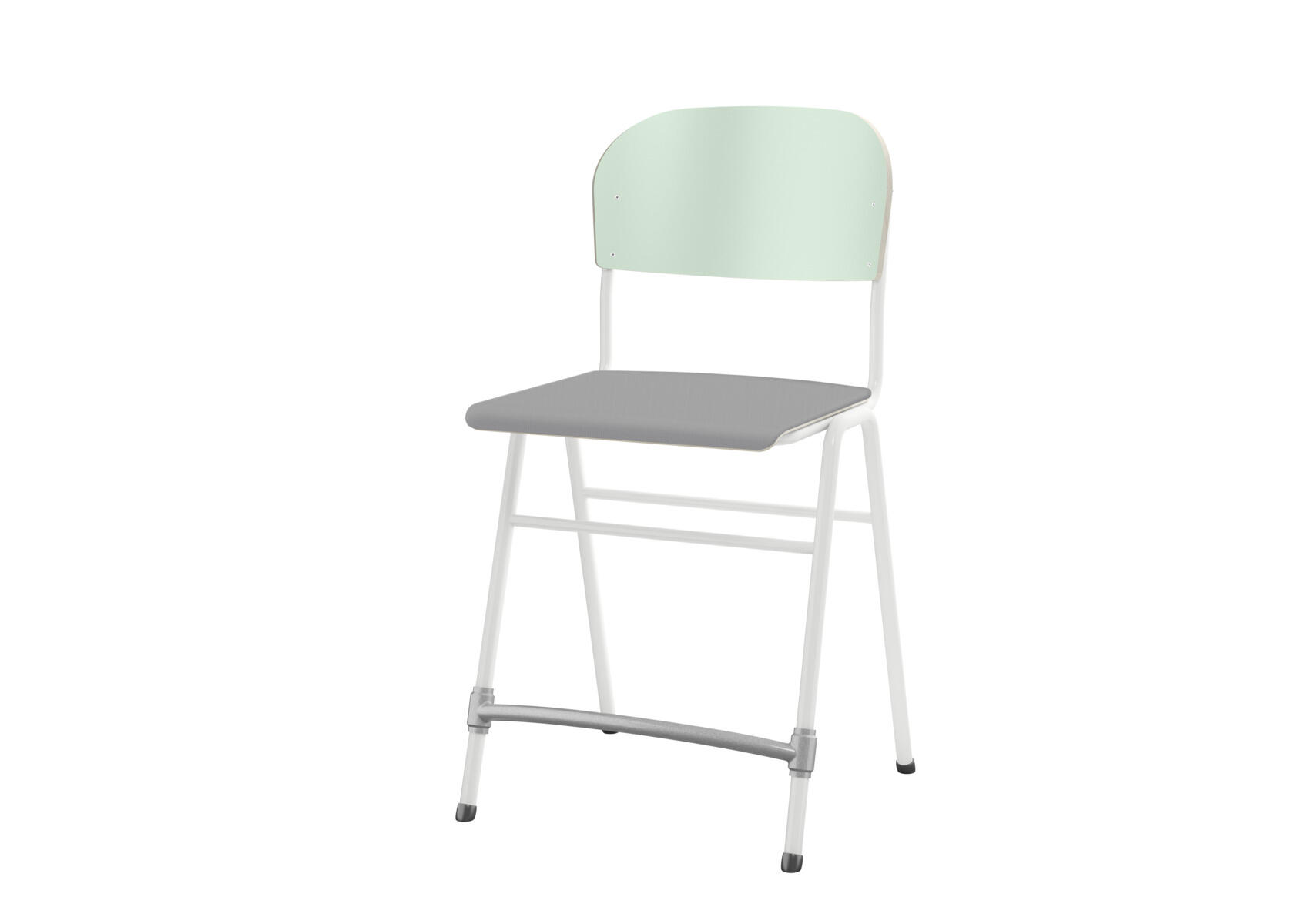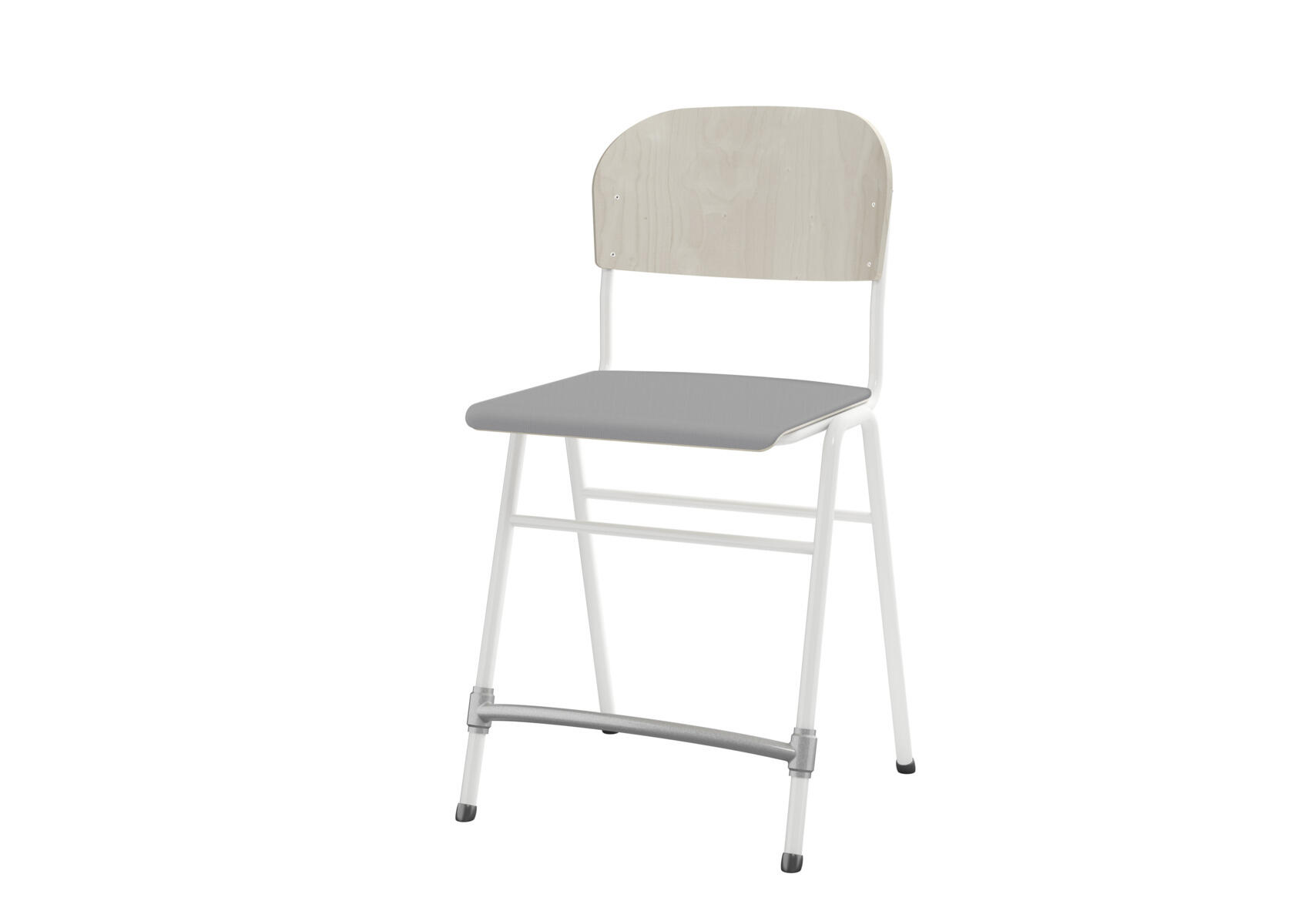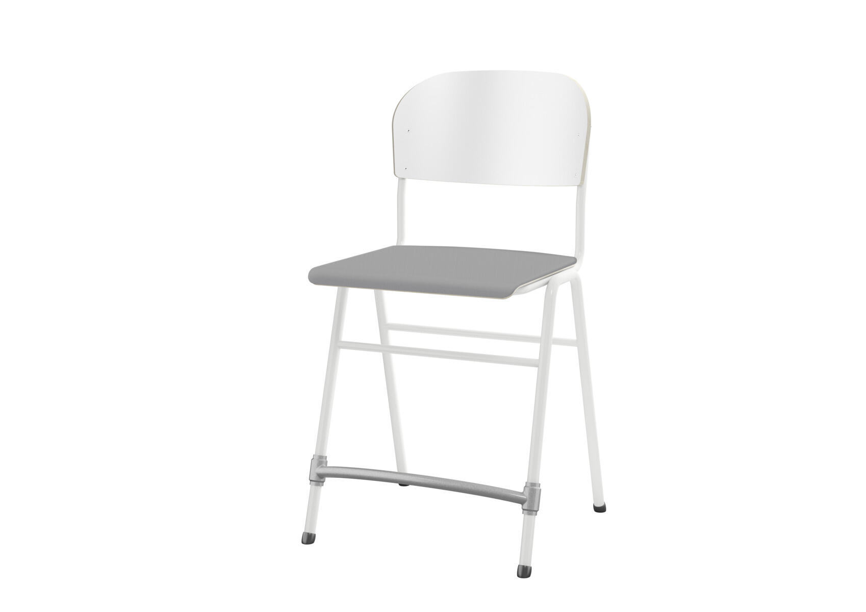 Stapelbar. Ljuddämpande tassar. Reglerbart fotstöd. Sitthöjd: 54 cm. Sitsmått: B36xD35 cm. Vikt 5,3 kg. Sits och rygg i högtryckslaminat. Vitlackerat stativ RAL 9003.