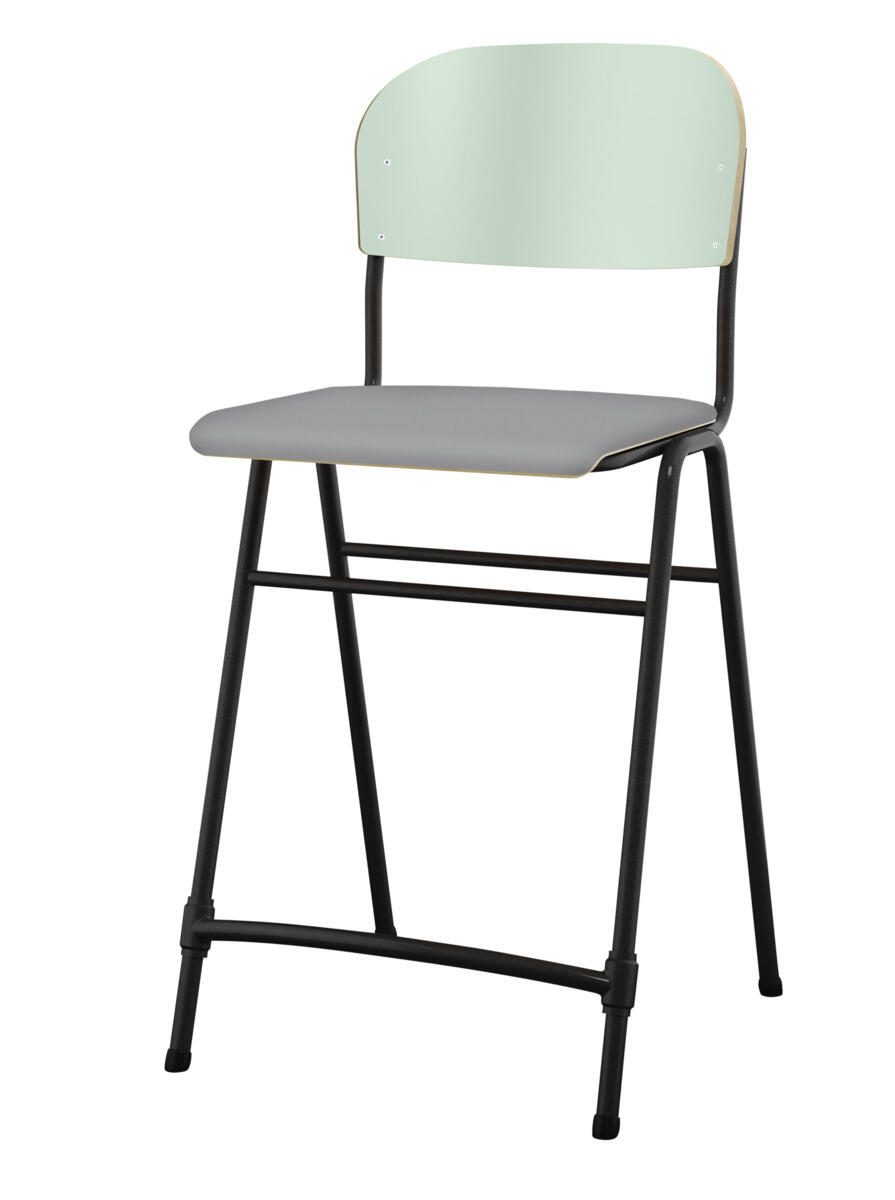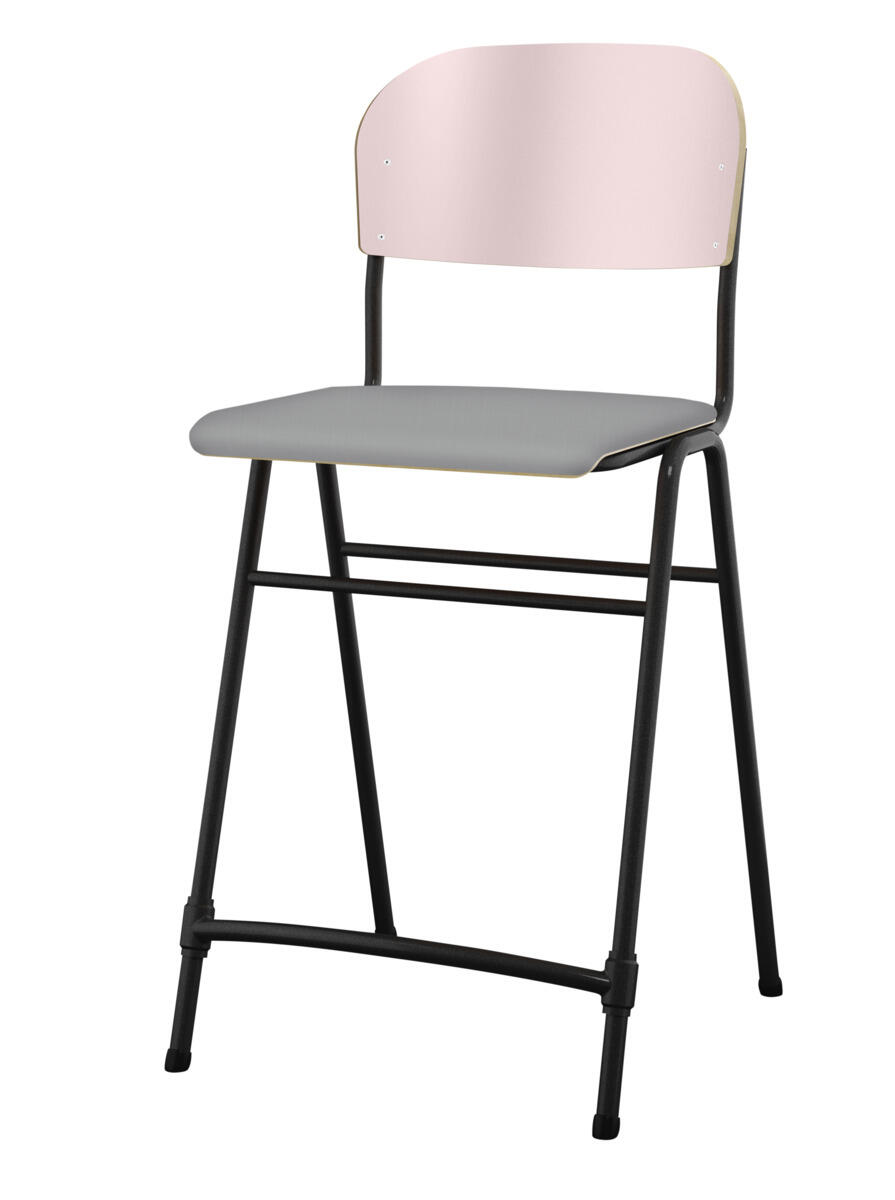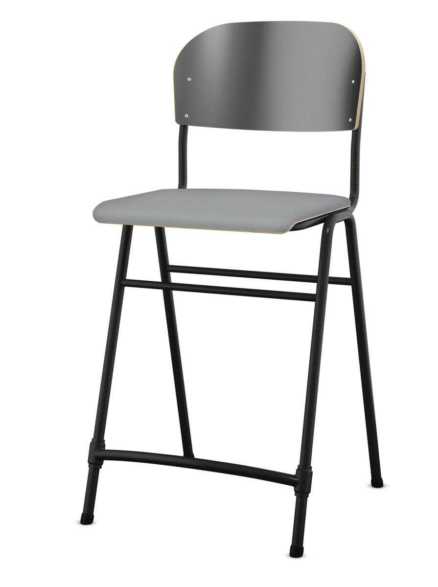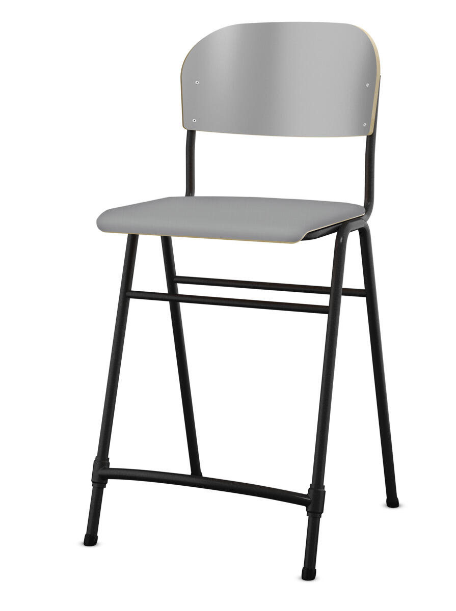 Stapelbar. Ljuddämpande tassar. Reglerbart fotstöd. Sitthöjd: 65 cm. Sitsmått: B42xD39 cm. Vikt 5,3 kg. Sits och rygg i högtryckslaminat. Svartlackerat stativ, RAL 9005.