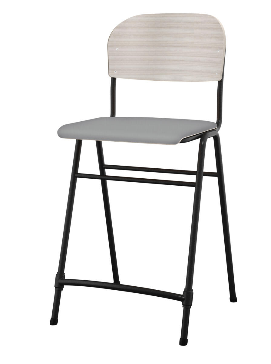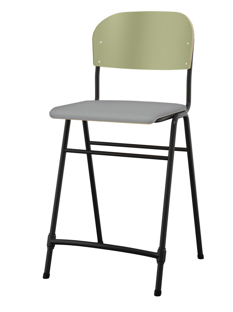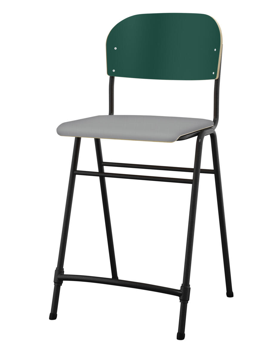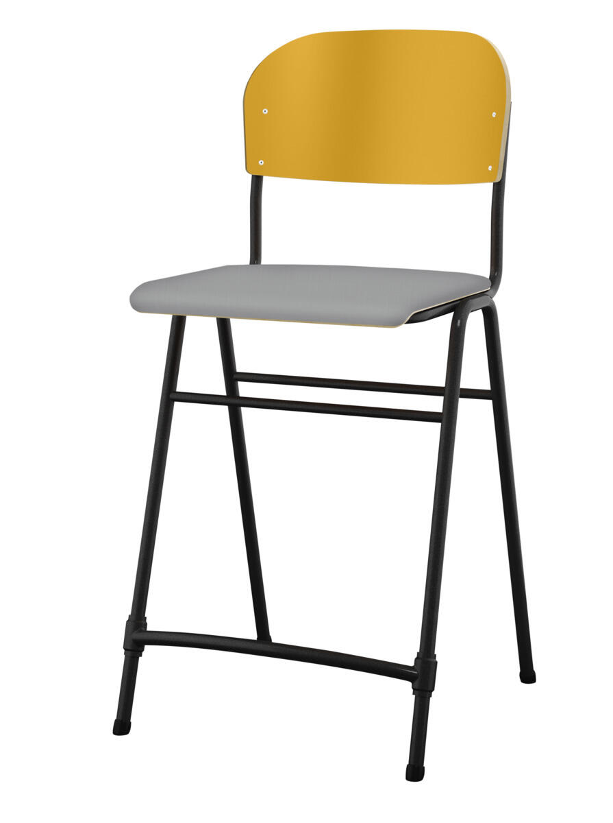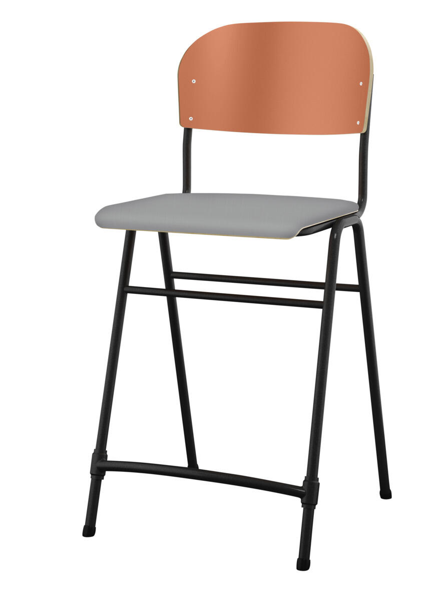 Stapelbar. Ljuddämpande tassar. Reglerbart fotstöd. Sitthöjd: 65 cm. Sitsmått: B42xD39 cm. Vikt 5,3 kg. Sits och rygg i högtryckslaminat. Svartlackerat stativ, RAL 9005.