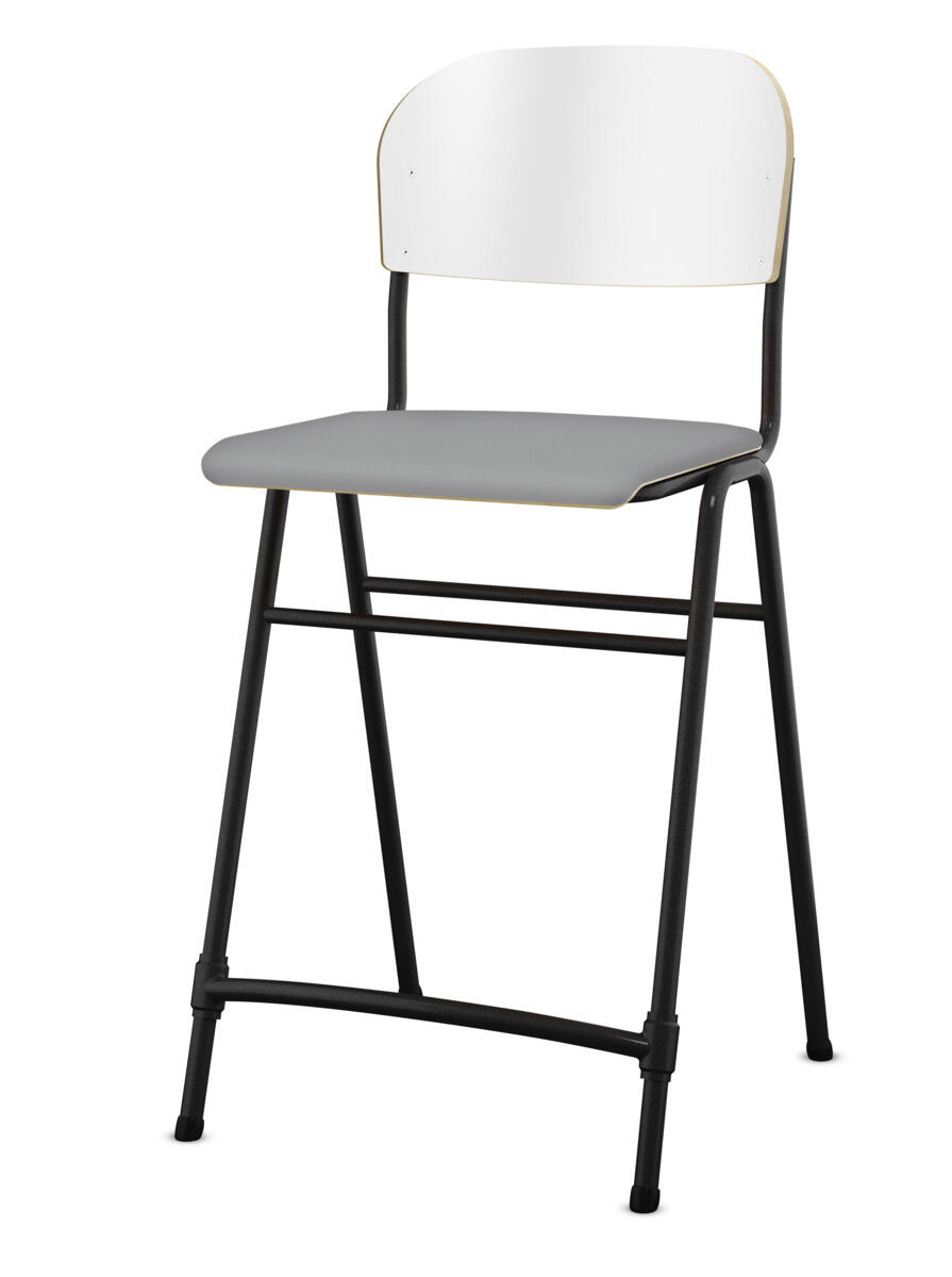 Stapelbar. Ljuddämpande tassar. Reglerbart fotstöd. Sitthöjd: 54 cm. Sitsmått: B42xD39 cm. Vikt 5,3 kg. Sits och rygg i högtryckslaminat. Vitlackerat stativ RAL 9003.