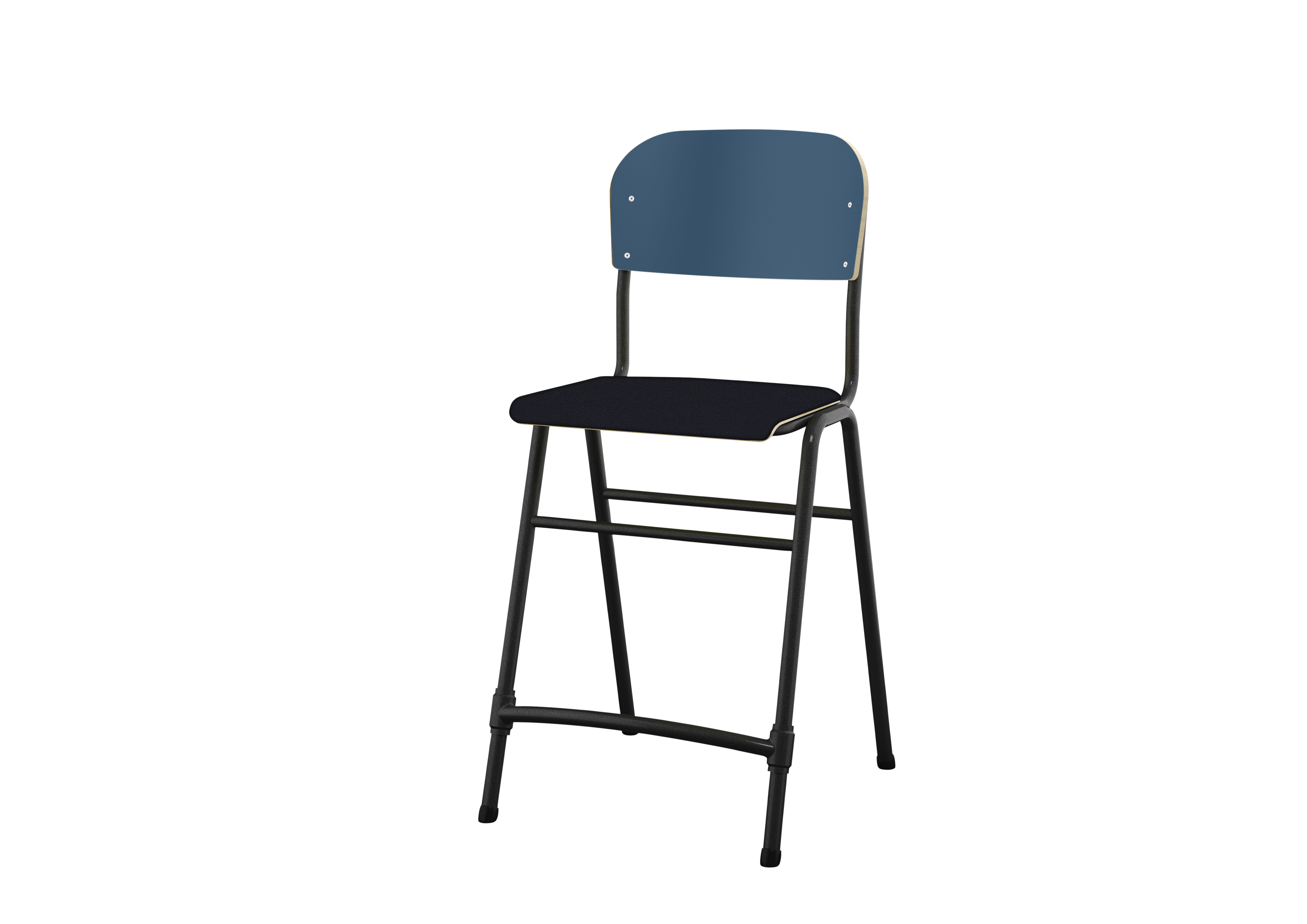 Stapelbar. Ljuddämpande tassar. Reglerbart fotstöd. Sitthöjd: 65 cm. Sitsmått: B36xD35 cm. Vikt 5,3 kg. Sits och rygg i högtryckslaminat. Svartlackerat stativ, RAL 9005.