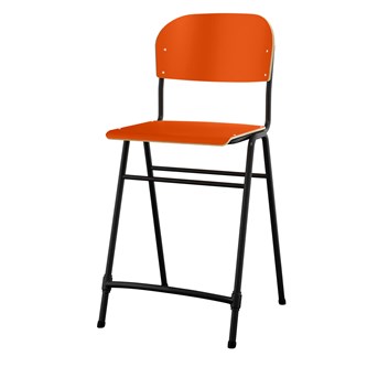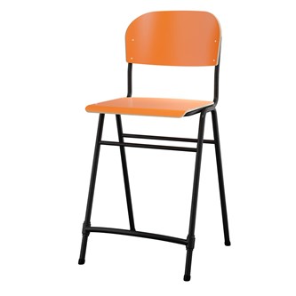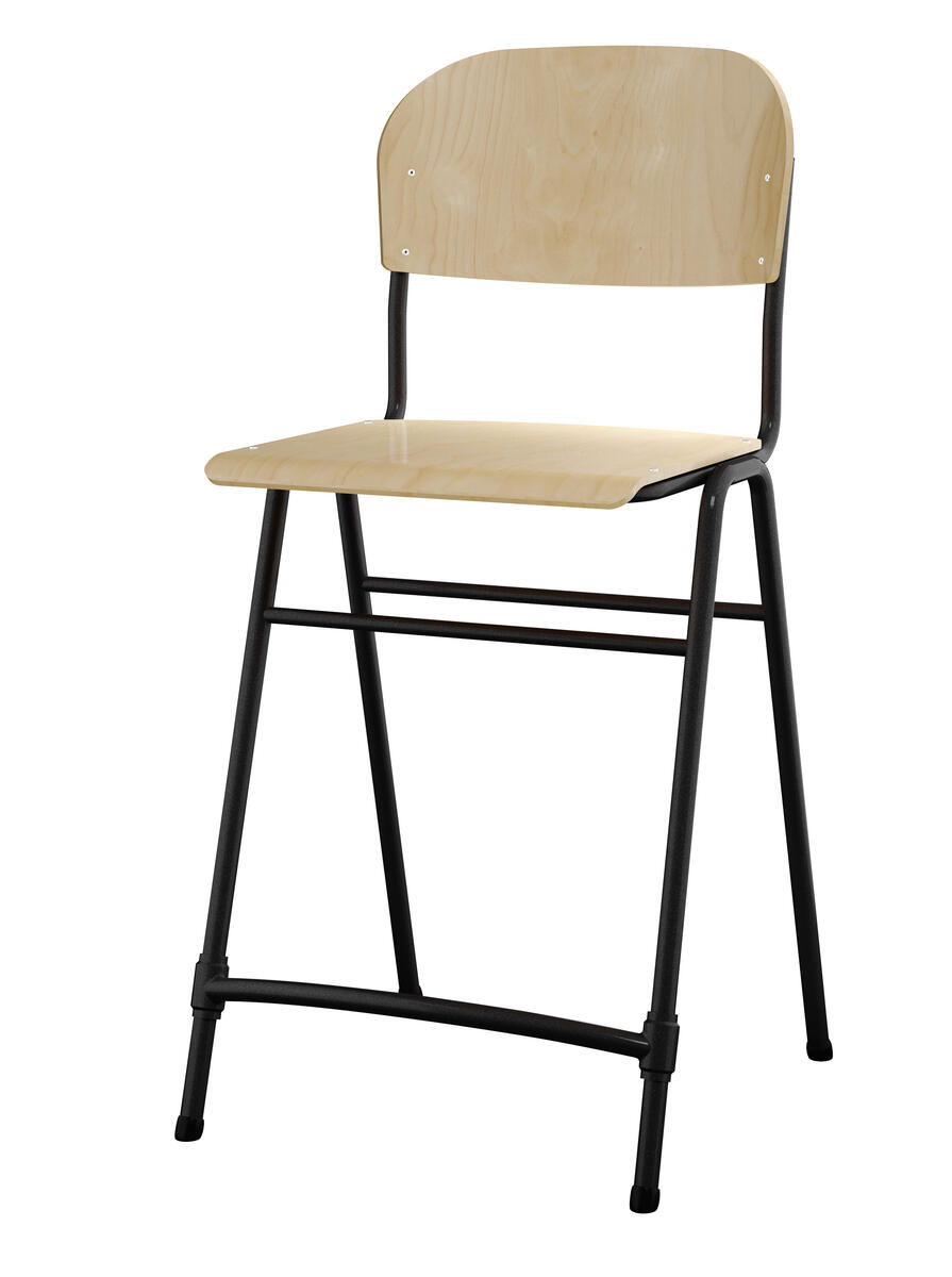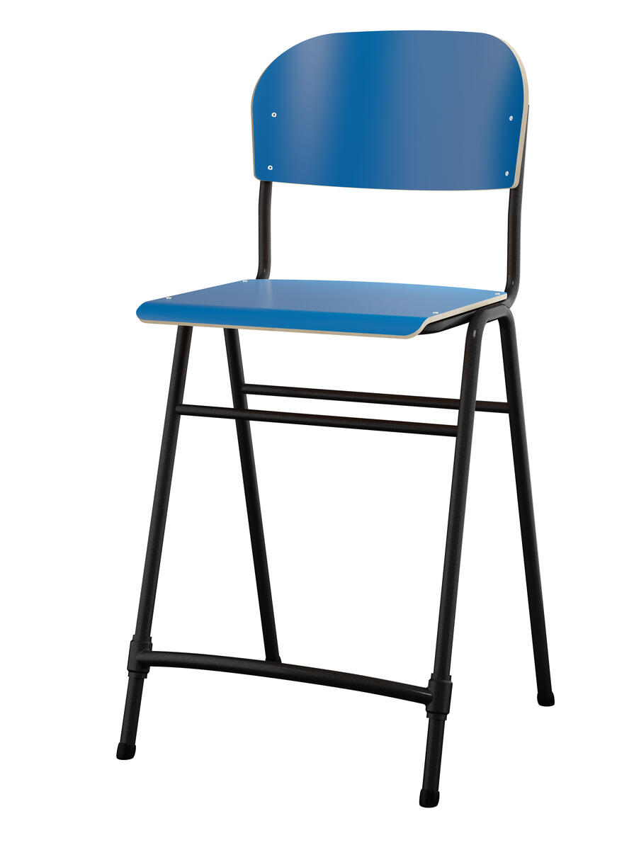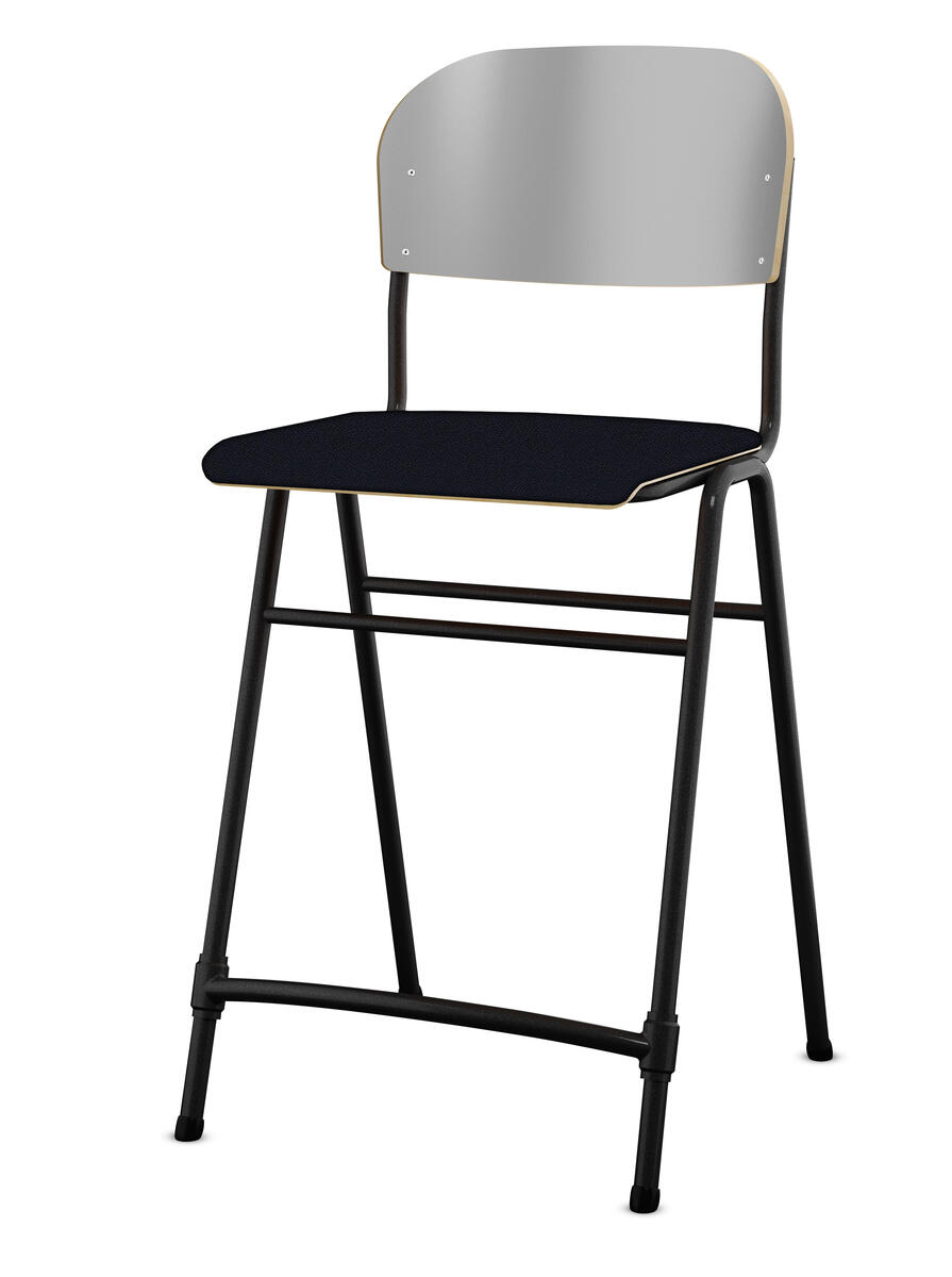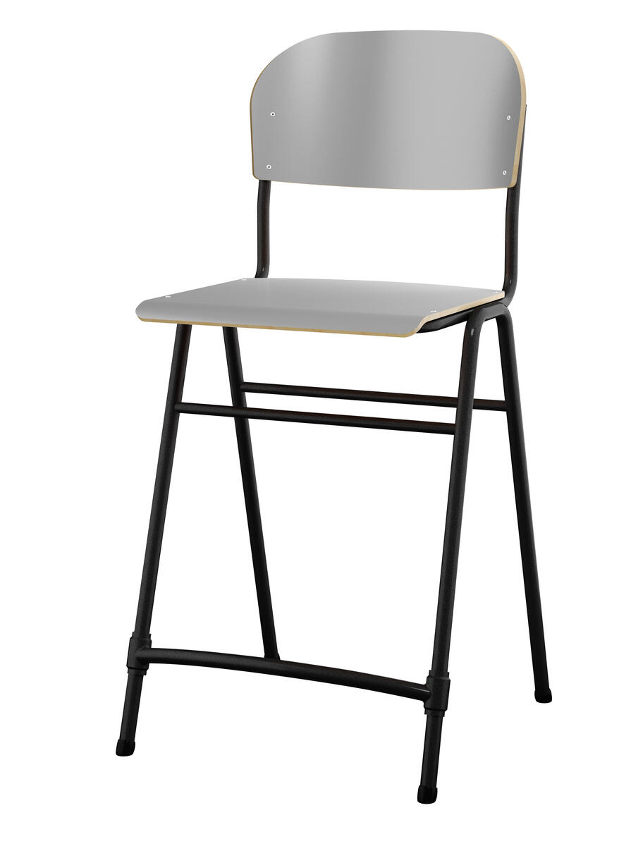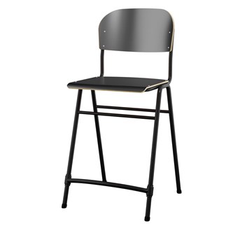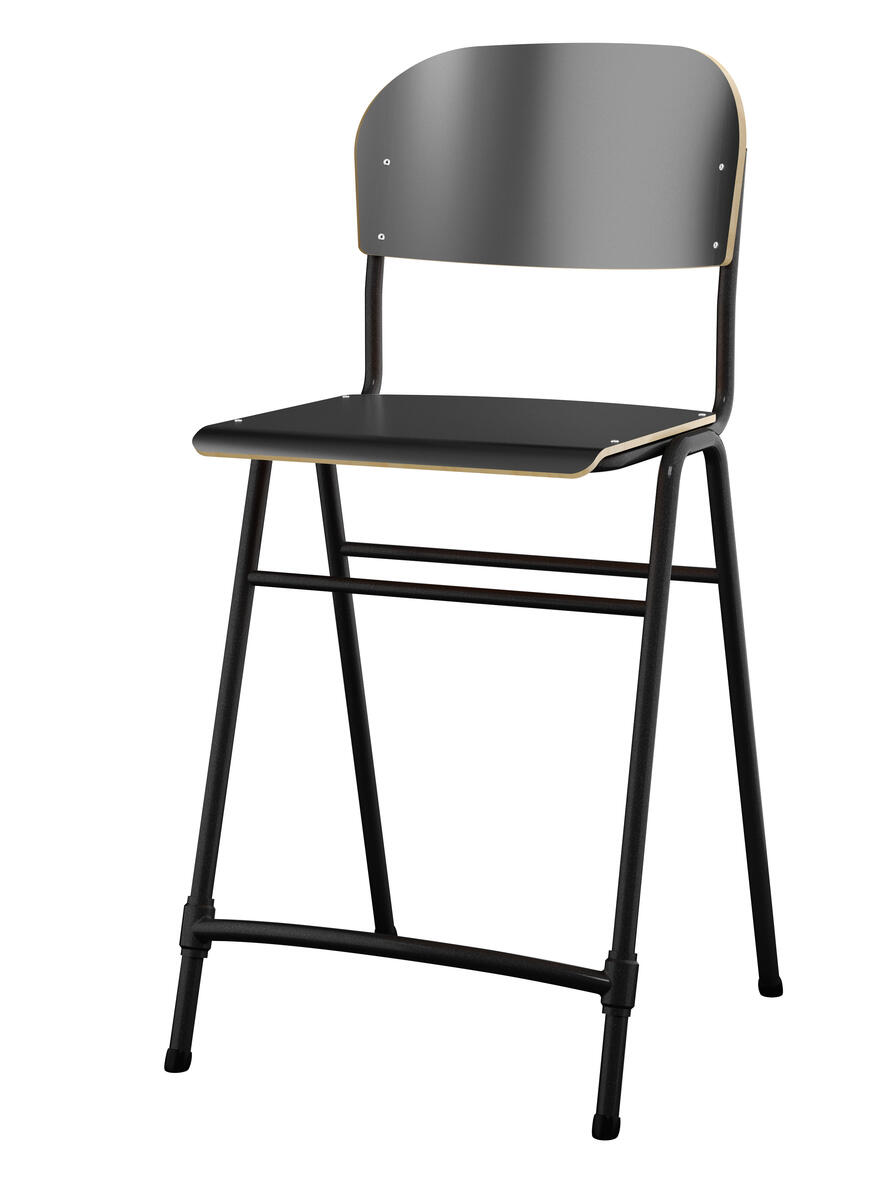 Stapelbar. Ljuddämpande tassar. Reglerbart fotstöd. Sitthöjd: 65 cm. Sitsmått: B42xD39 cm. Vikt 5,3 kg. Sits och rygg i högtryckslaminat. Svartlackerat stativ, RAL 9005.