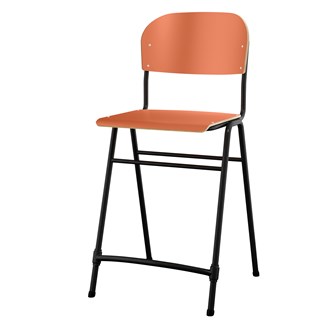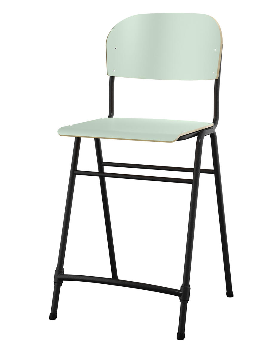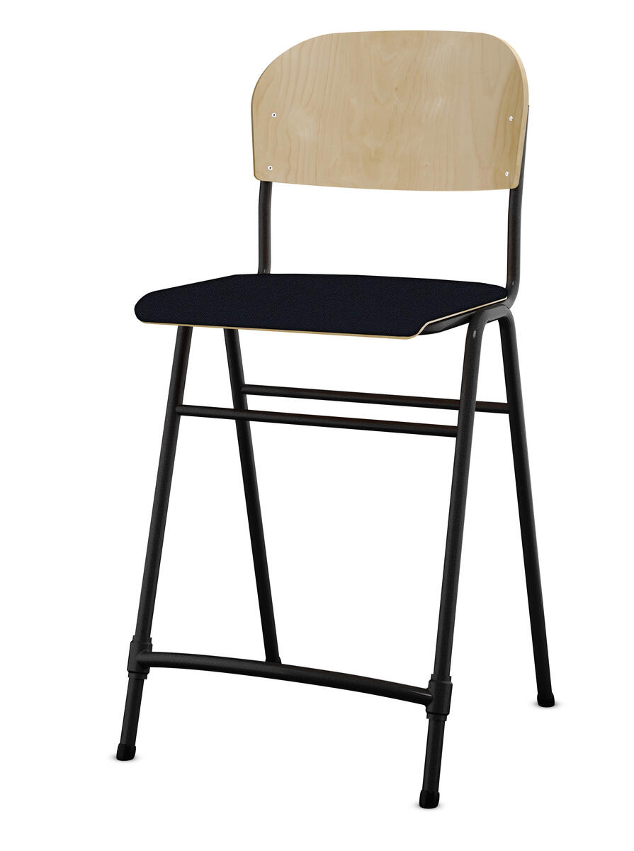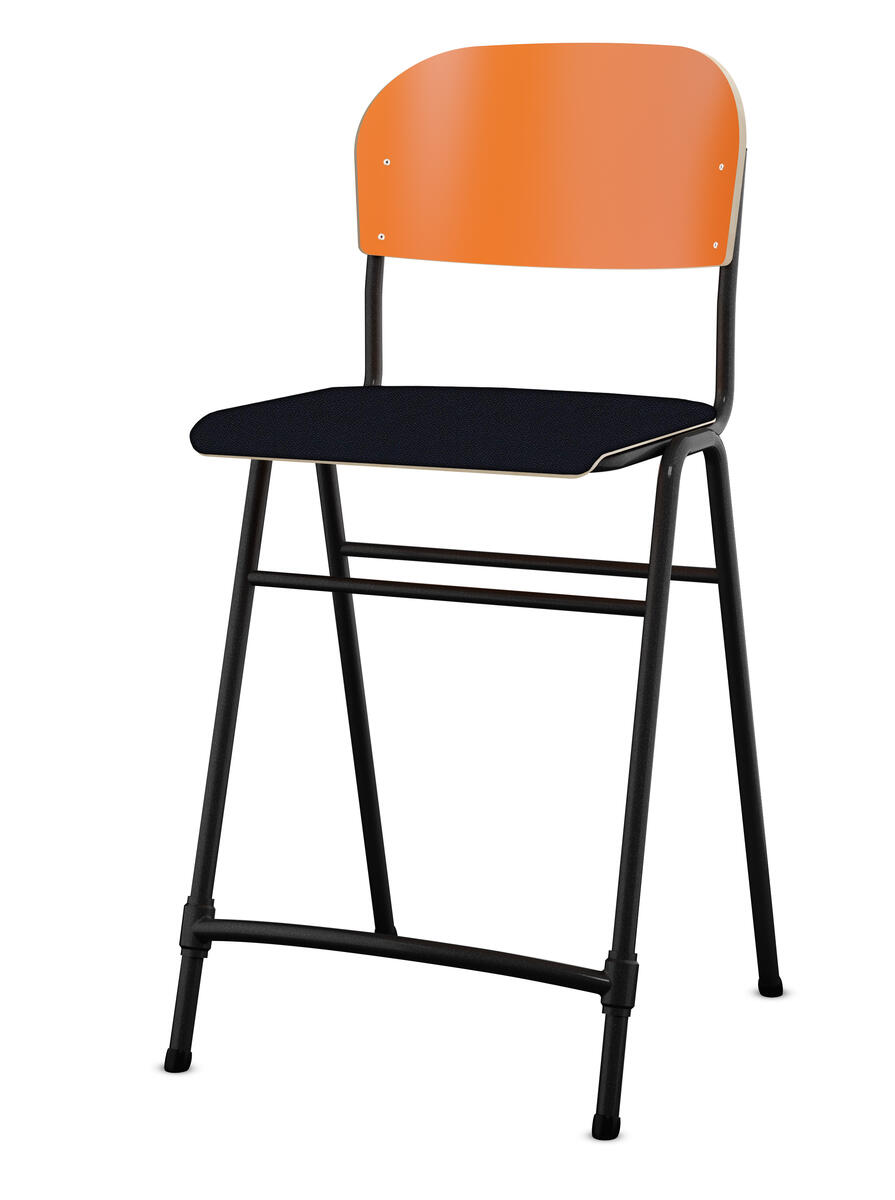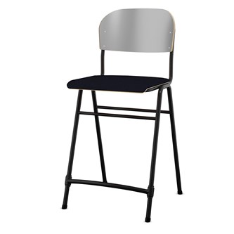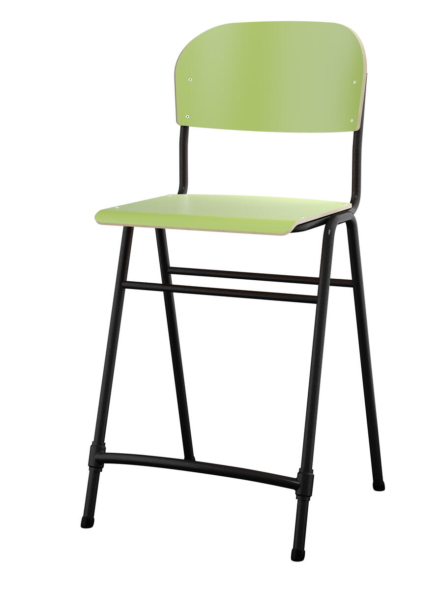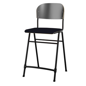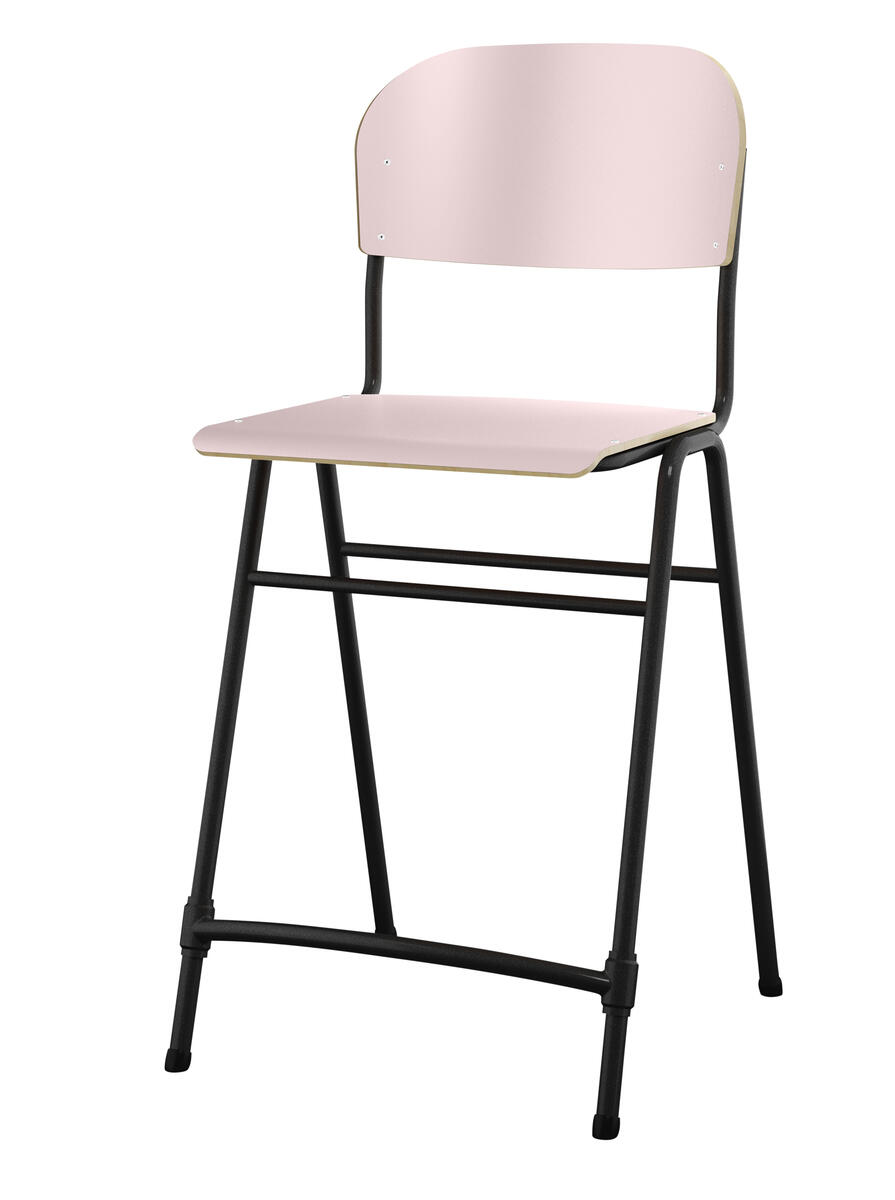 Stapelbar. Ljuddämpande tassar. Reglerbart fotstöd. Sitthöjd: 65 cm. Sitsmått: B42xD39 cm. Vikt 5,3 kg. Sits och rygg i högtryckslaminat. Svartlackerat stativ, RAL 9005.