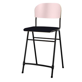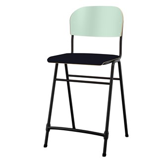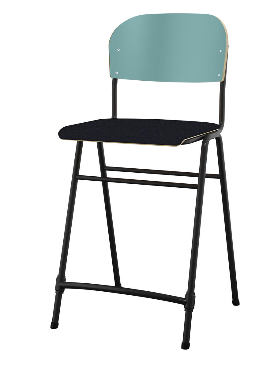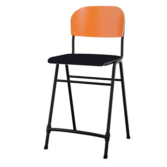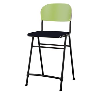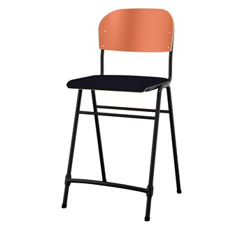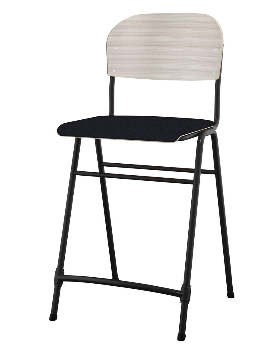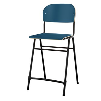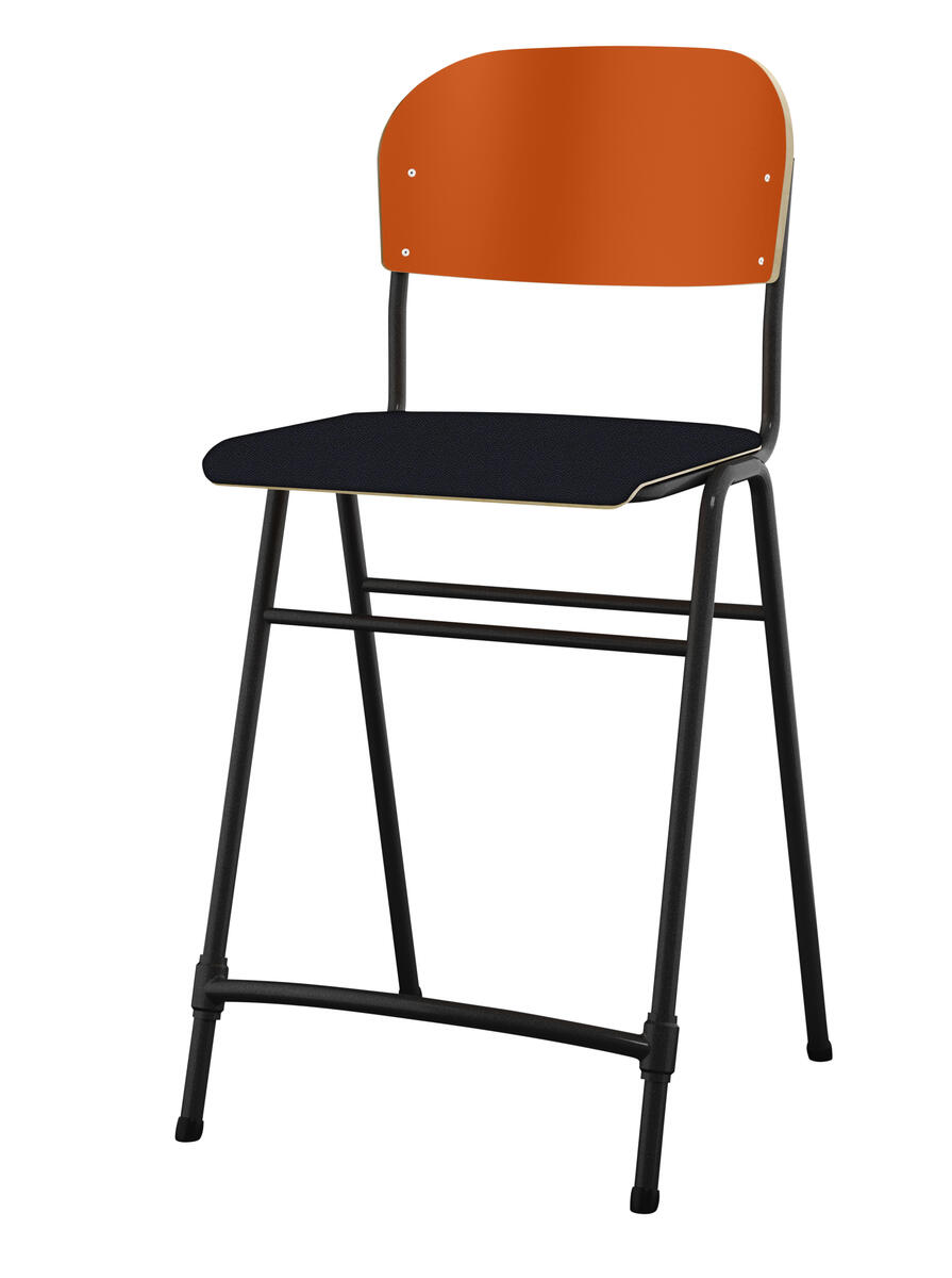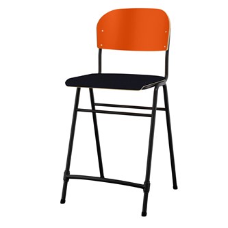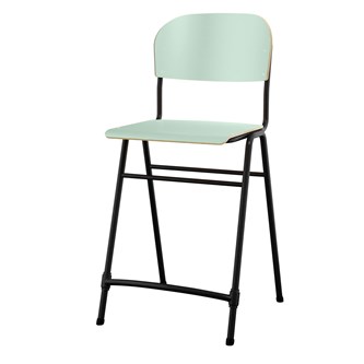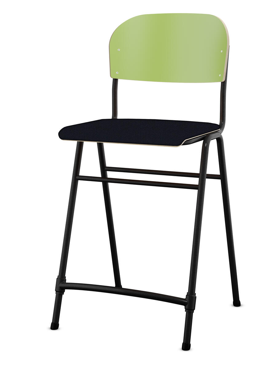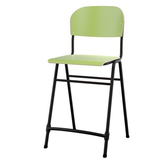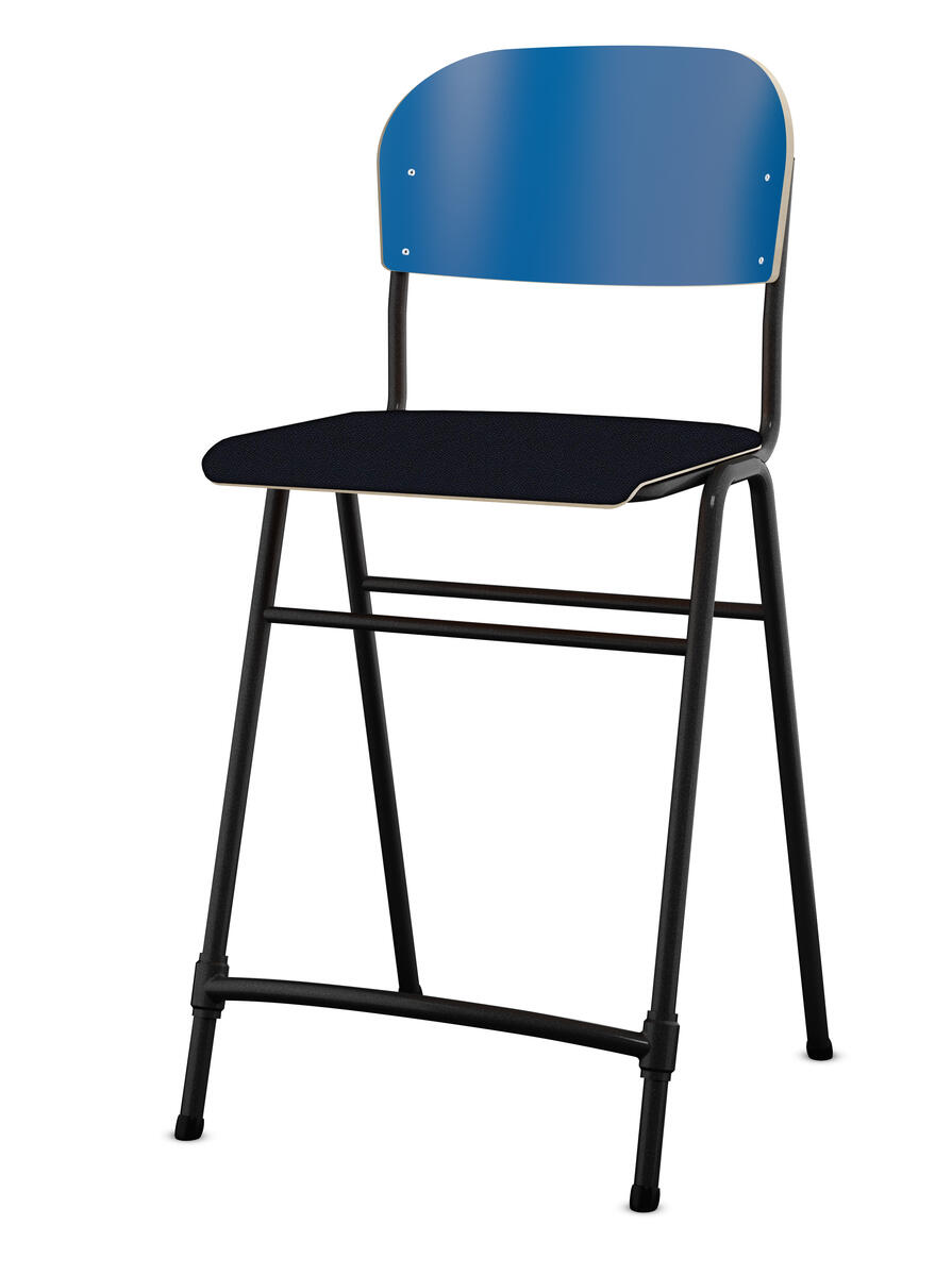 Stapelbar. Ljuddämpande tassar. Reglerbart fotstöd. Sitthöjd: 65 cm. Sitsmått: B42xD39 cm. Vikt 5,3 kg. Sits och rygg i högtryckslaminat. Svartlackerat stativ, RAL 9005.