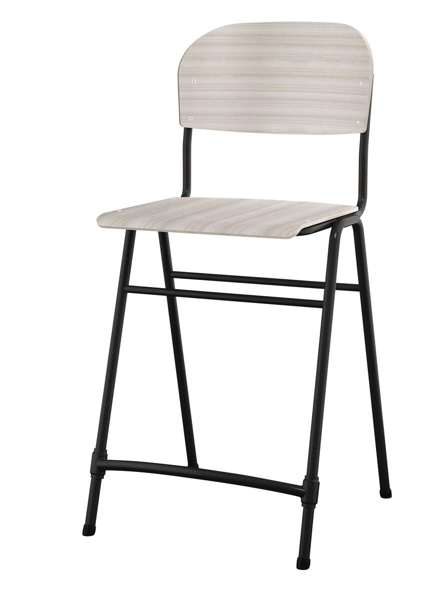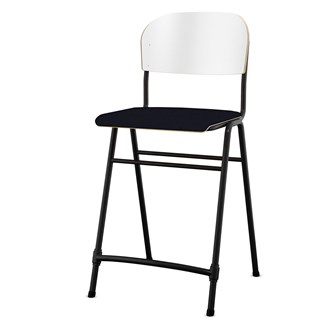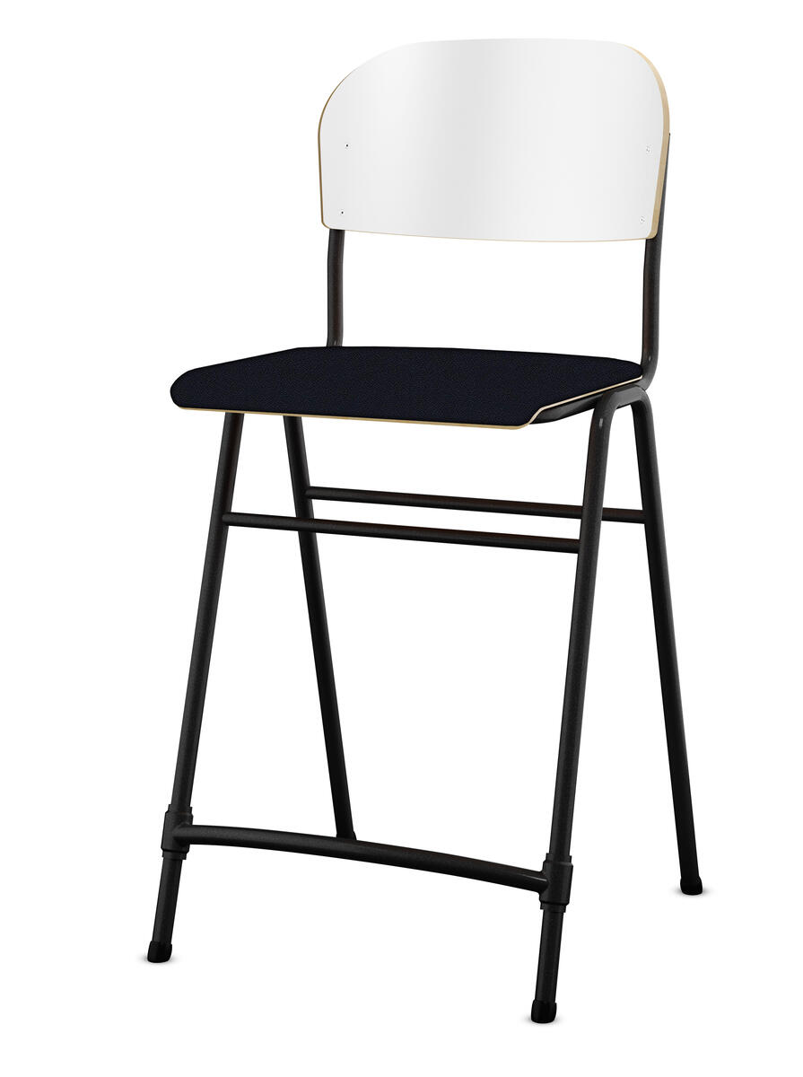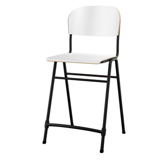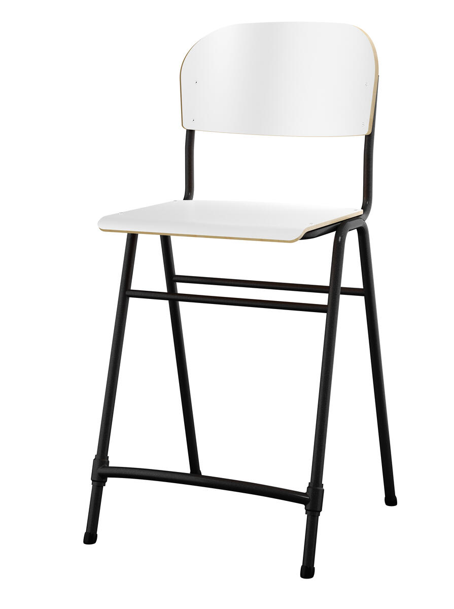 Stapelbar. Ljuddämpande tassar. Reglerbart fotstöd. Sitthöjd: 65 cm. Sitsmått: B42xD39 cm. Vikt 5,3 kg. Sits och rygg i högtryckslaminat. Vitlackerat stativ RAL 9003.