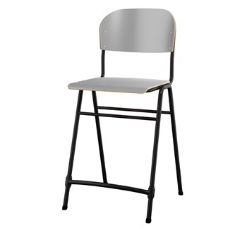 Stapelbar. Ljuddämpande tassar. Reglerbart fotstöd. Sitthöjd: 65 cm. Sitsmått: B42xD39 cm. Vikt 5,3 kg. Sits och rygg i högtryckslaminat. Silverlackerat stativ, RAL 9006.