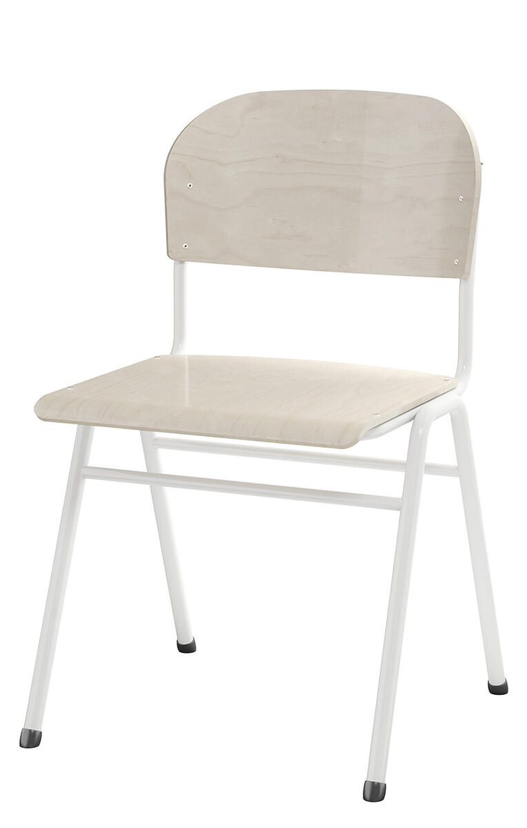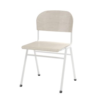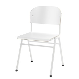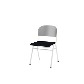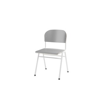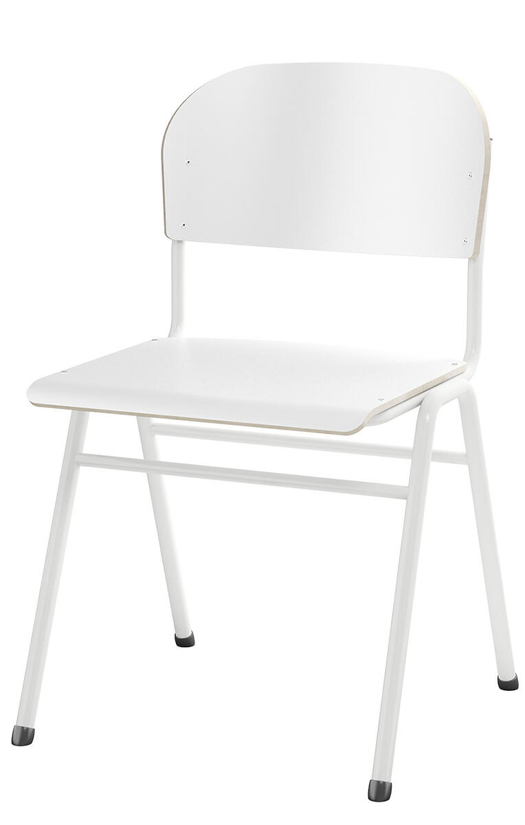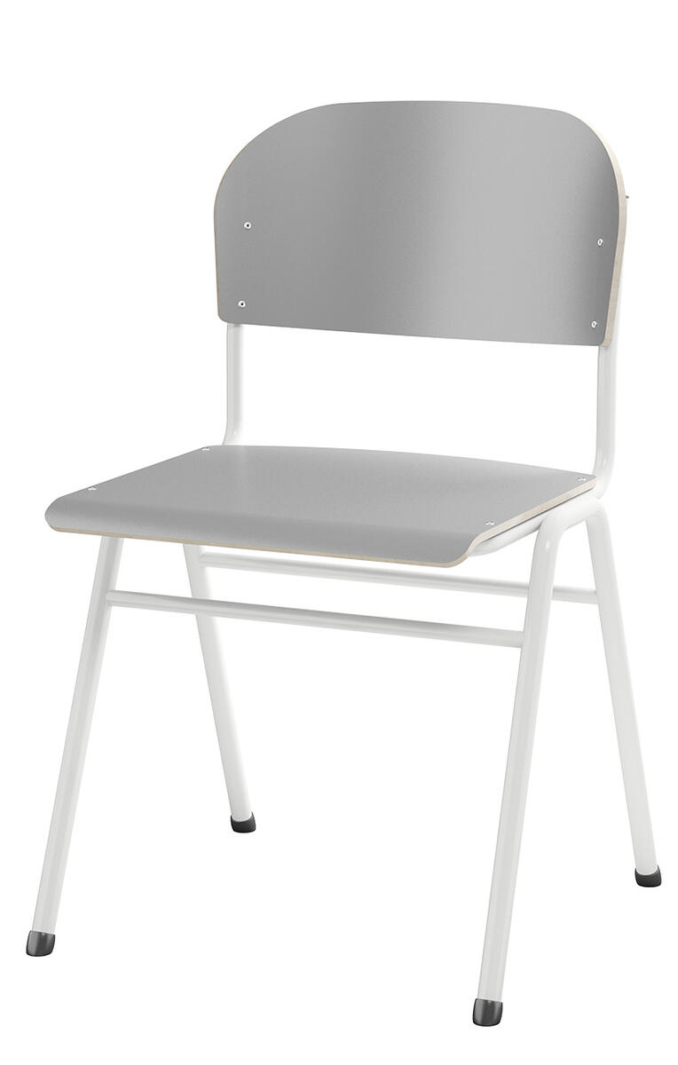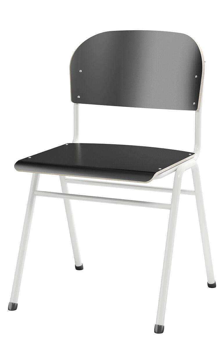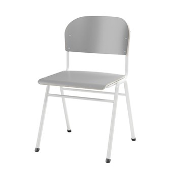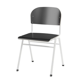 Stapelbar. Ljuddämpande tassar. Reglerbart fotstöd. Sitthöjd: 54 cm. Sitsmått: B42xD39 cm. Vikt 5,3 kg. Sits och rygg i högtryckslaminat. Silverlackerat stativ, RAL 9006.