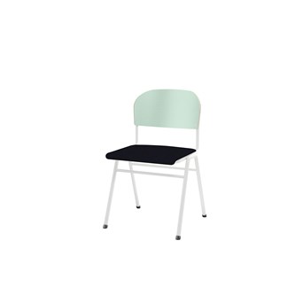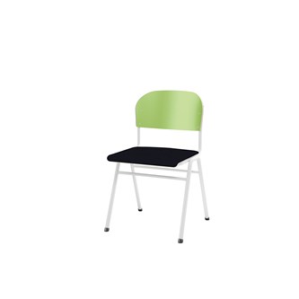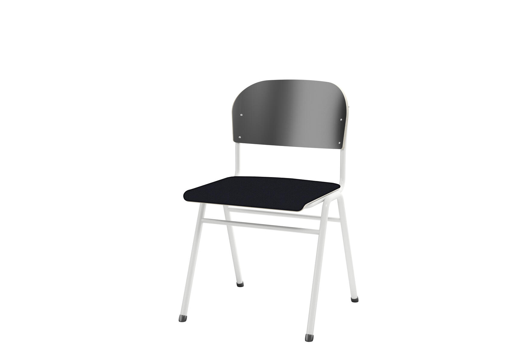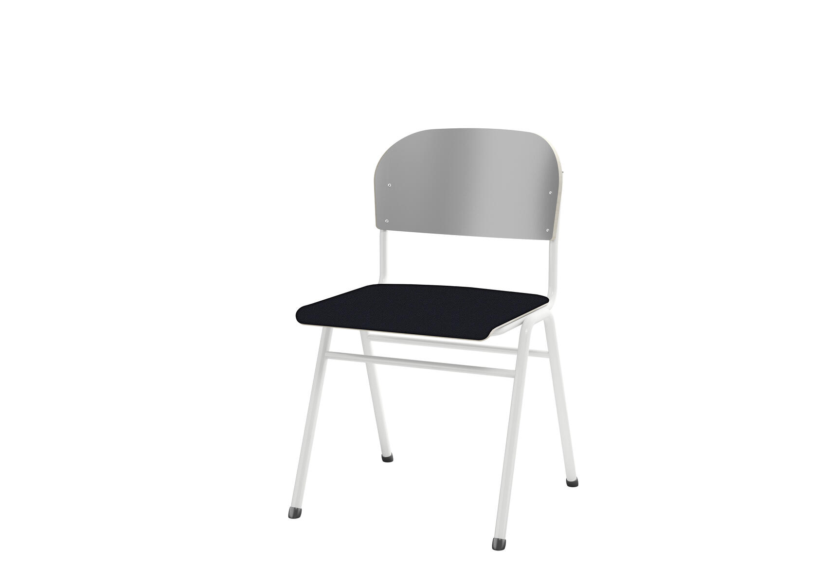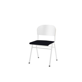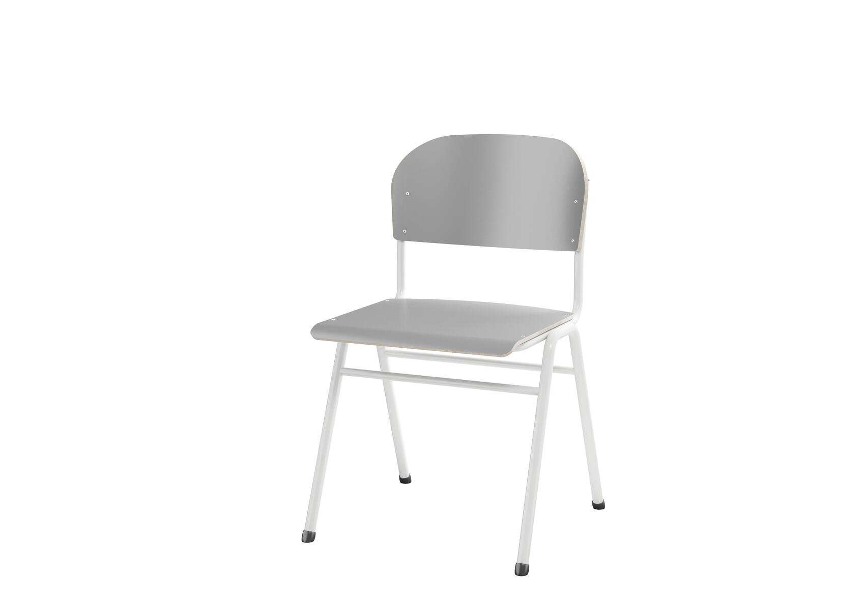 Stapelbar. Ljuddämpande tassar. Reglerbart fotstöd. Sitthöjd: 54 cm. Sitsmått: B42xD39 cm. Vikt 5,3 kg. Sits och rygg i högtryckslaminat. Silverlackerat stativ, RAL 9006.