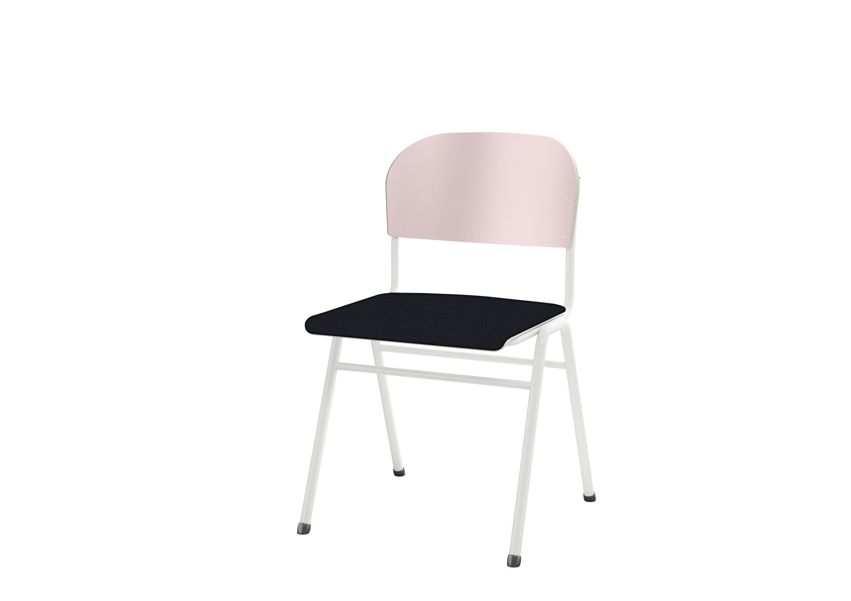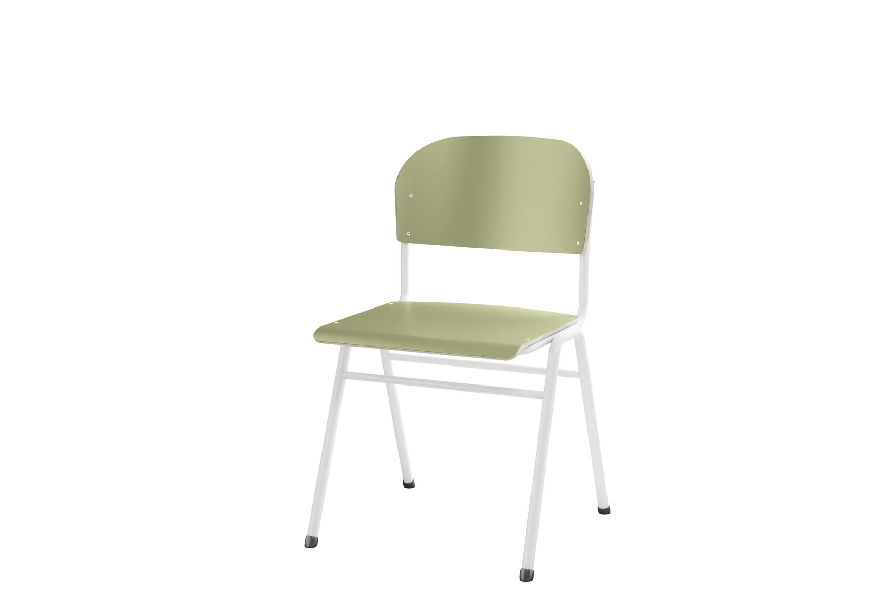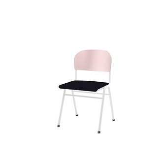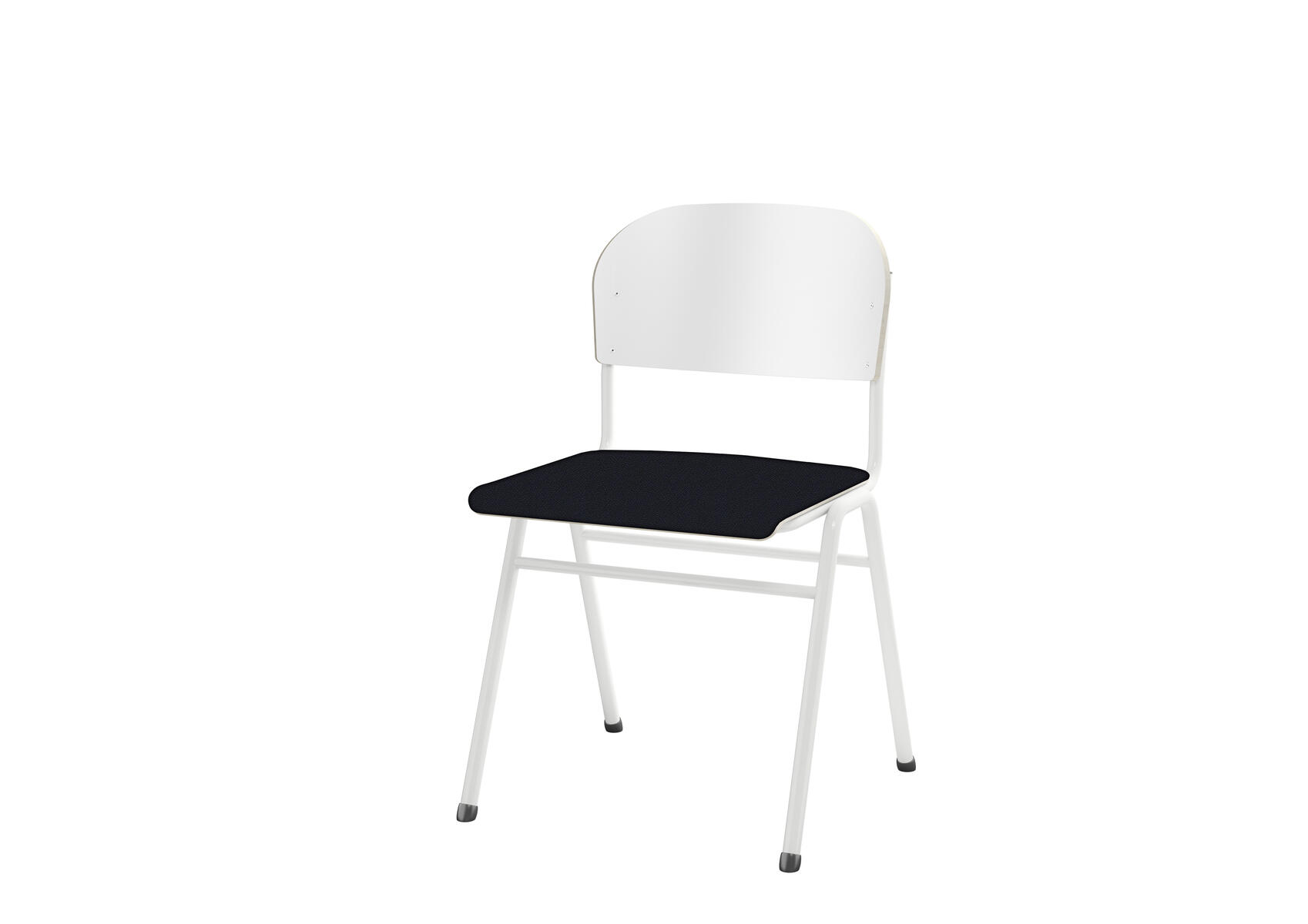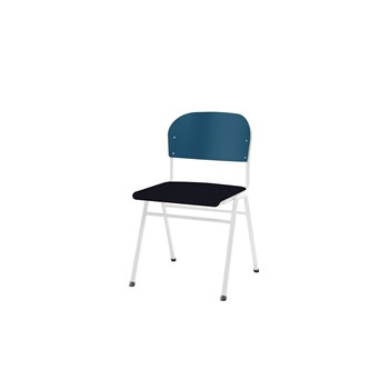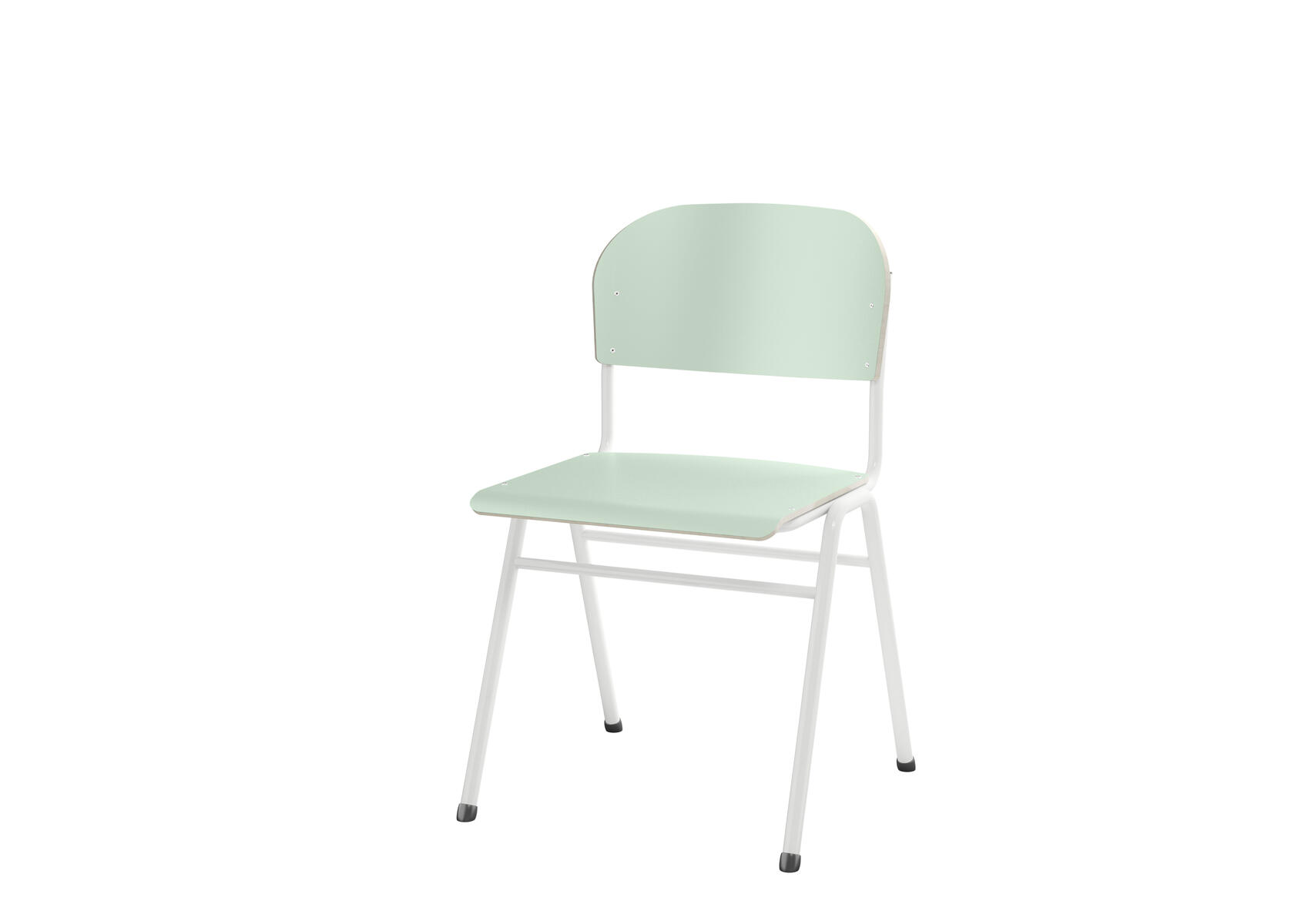 Stapelbar. Ljuddämpande tassar. Reglerbart fotstöd. Sitthöjd: 54 cm. Sitsmått: B42xD39 cm. Vikt 5,3 kg. Sits och rygg i högtryckslaminat. Silverlackerat stativ, RAL 9006.